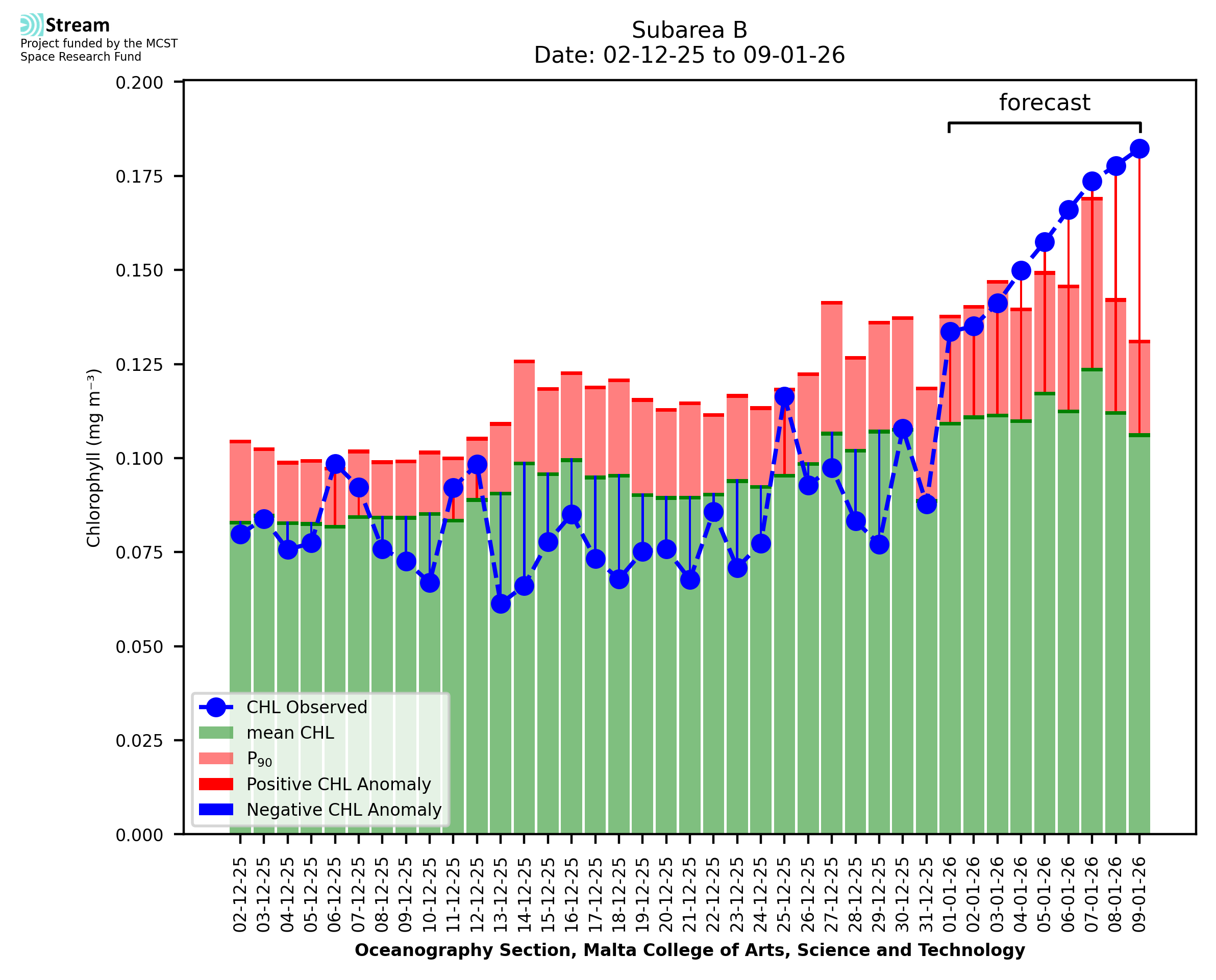 Spatial map of high chlorophyll occurrence and intensity. The CHL index is signalled when the CHL anomaly (CHLA) exceeds the CHL 90th percentile (CHL90) for at least 5 consecutive days. The CHL index gives a measure of the chlorophyll intensity, measured by the size of the CHLA compared to the difference between CHL90 and the climatological mean CHL.