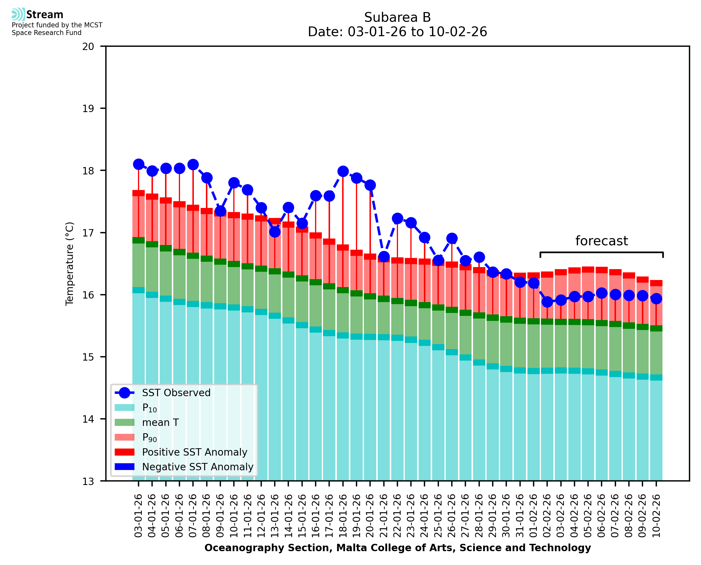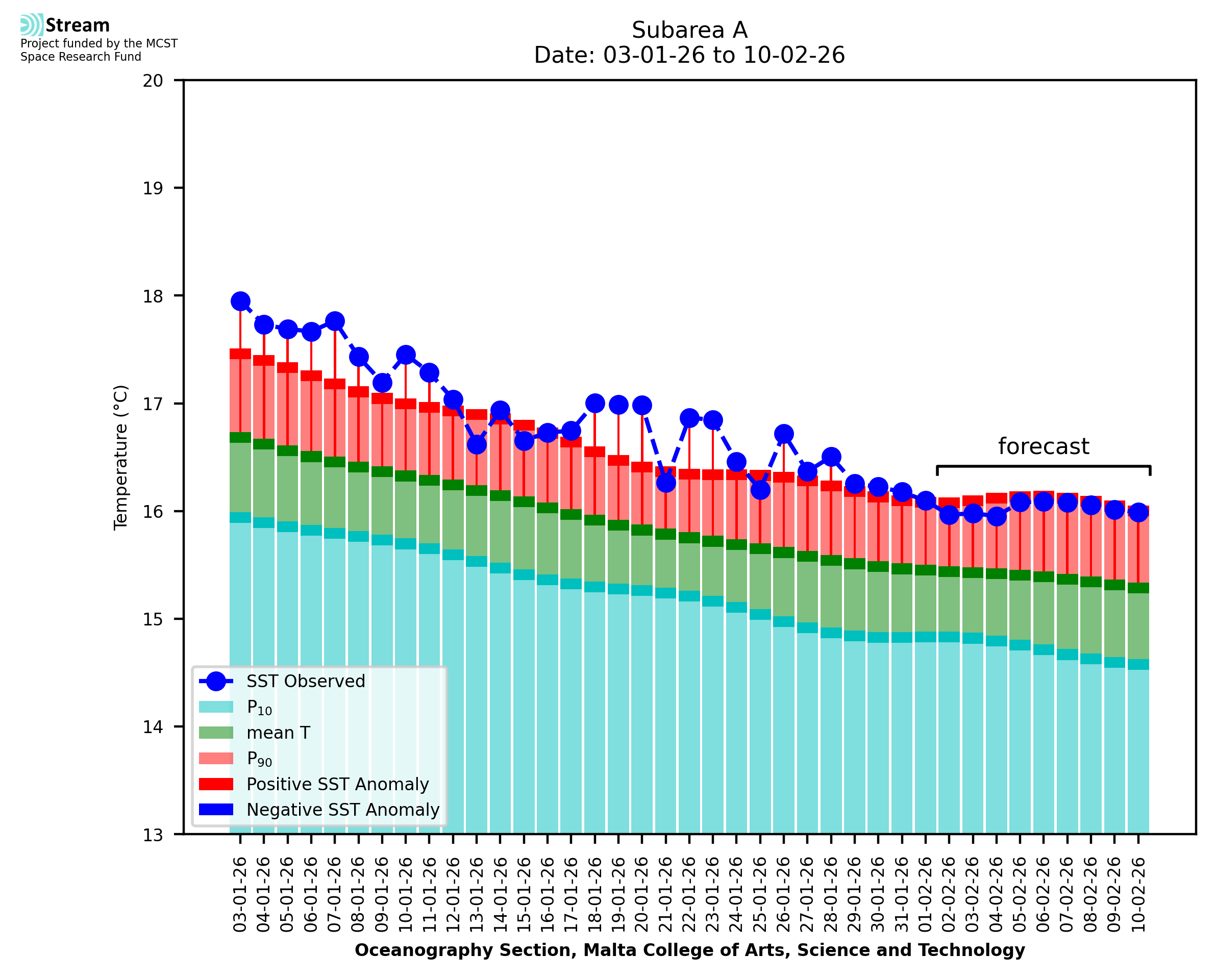 Elaborated by STREAM, the service provides daily analysis of sea surface temperature (SST) anomalies, including spatial maps for marine heat wave occurrence and intensity in the Malta shelf area. The service is based on ultra high resolution SST nighttime observations made by the infrared sensors mounted on different satellite platforms. Personalised user requests for detailed pixel-based data visualisation and access are available operationally on the STREAM web and mobile app.