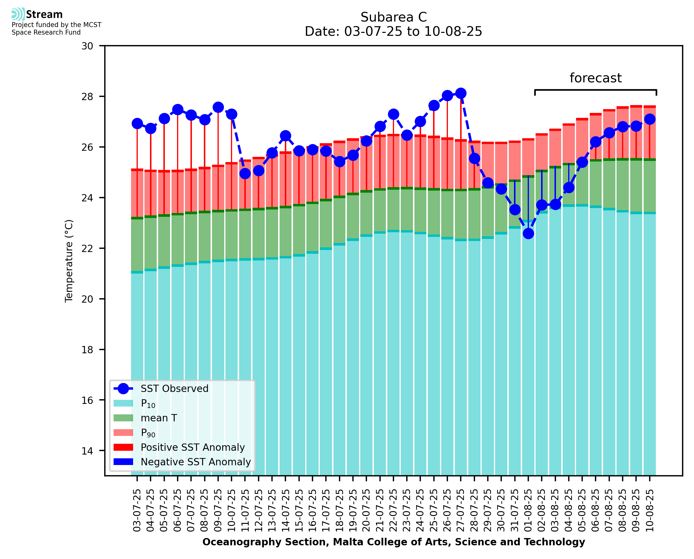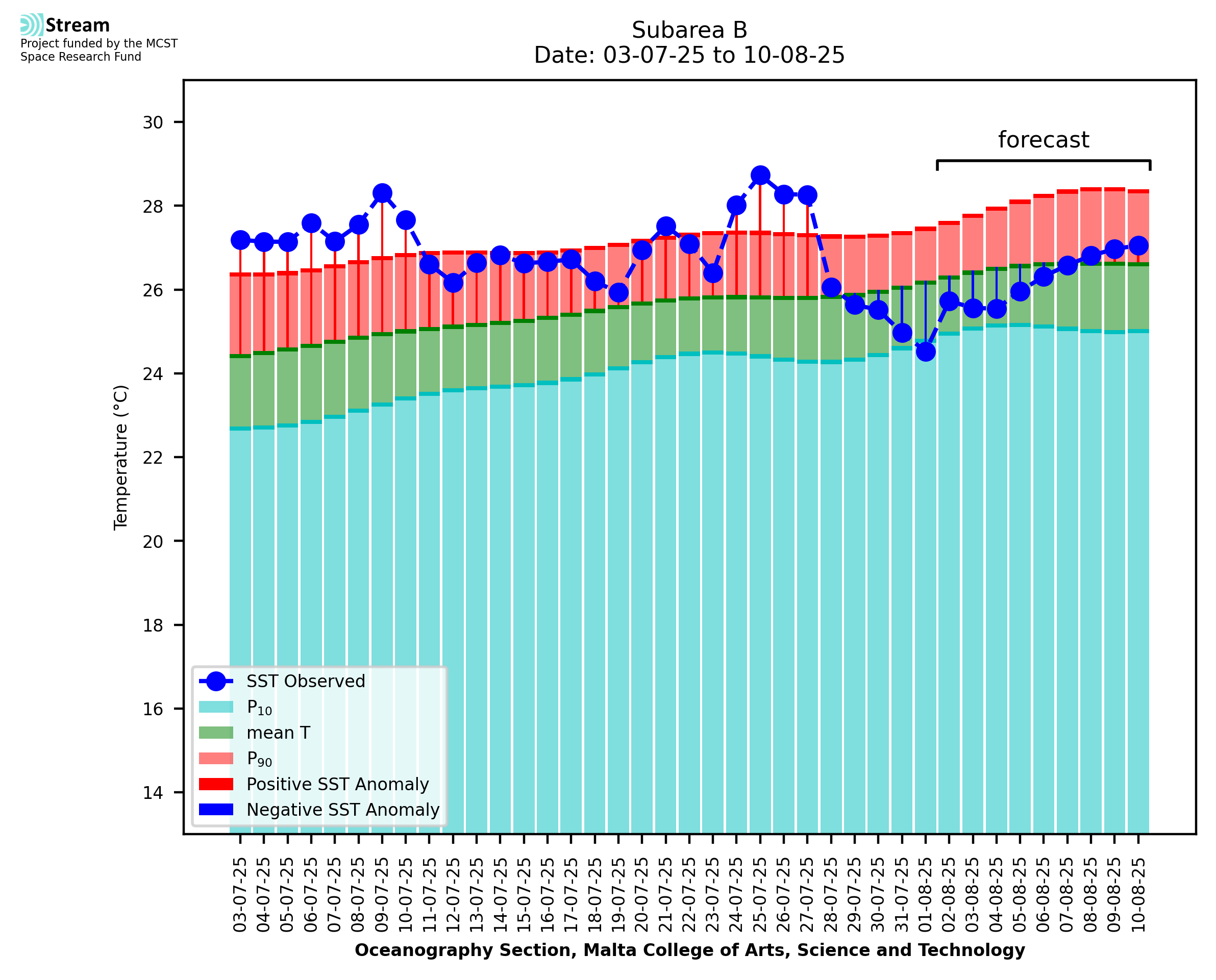 Elaborated by STREAM, the service provides daily analysis of sea surface temperature (SST) anomalies, including spatial maps for marine heat wave occurrence and intensity in the Malta shelf area. The service is based on ultra high resolution SST nighttime observations made by the infrared sensors mounted on different satellite platforms. Personalised user requests for detailed pixel-based data visualisation and access are available operationally on the STREAM web and mobile app.