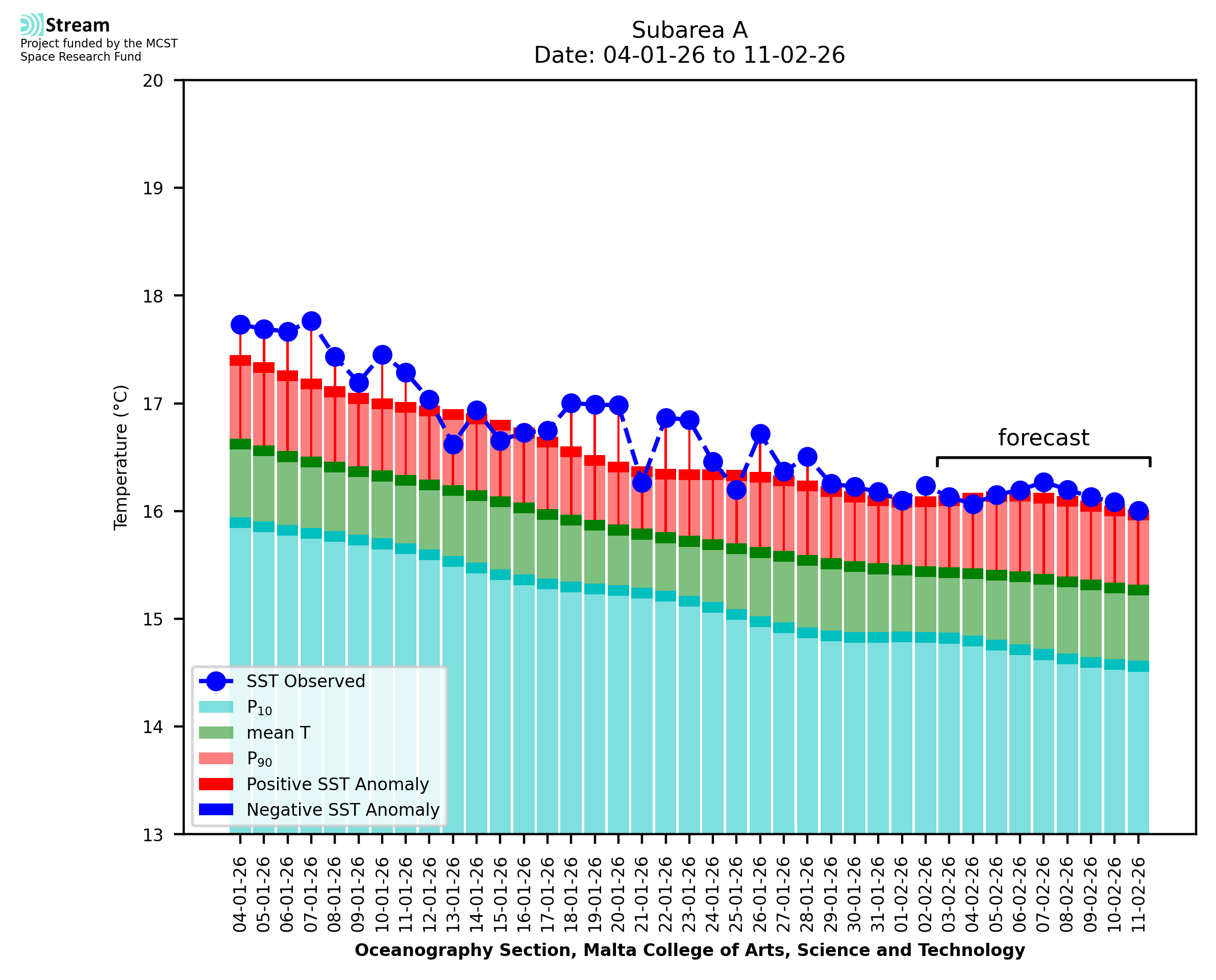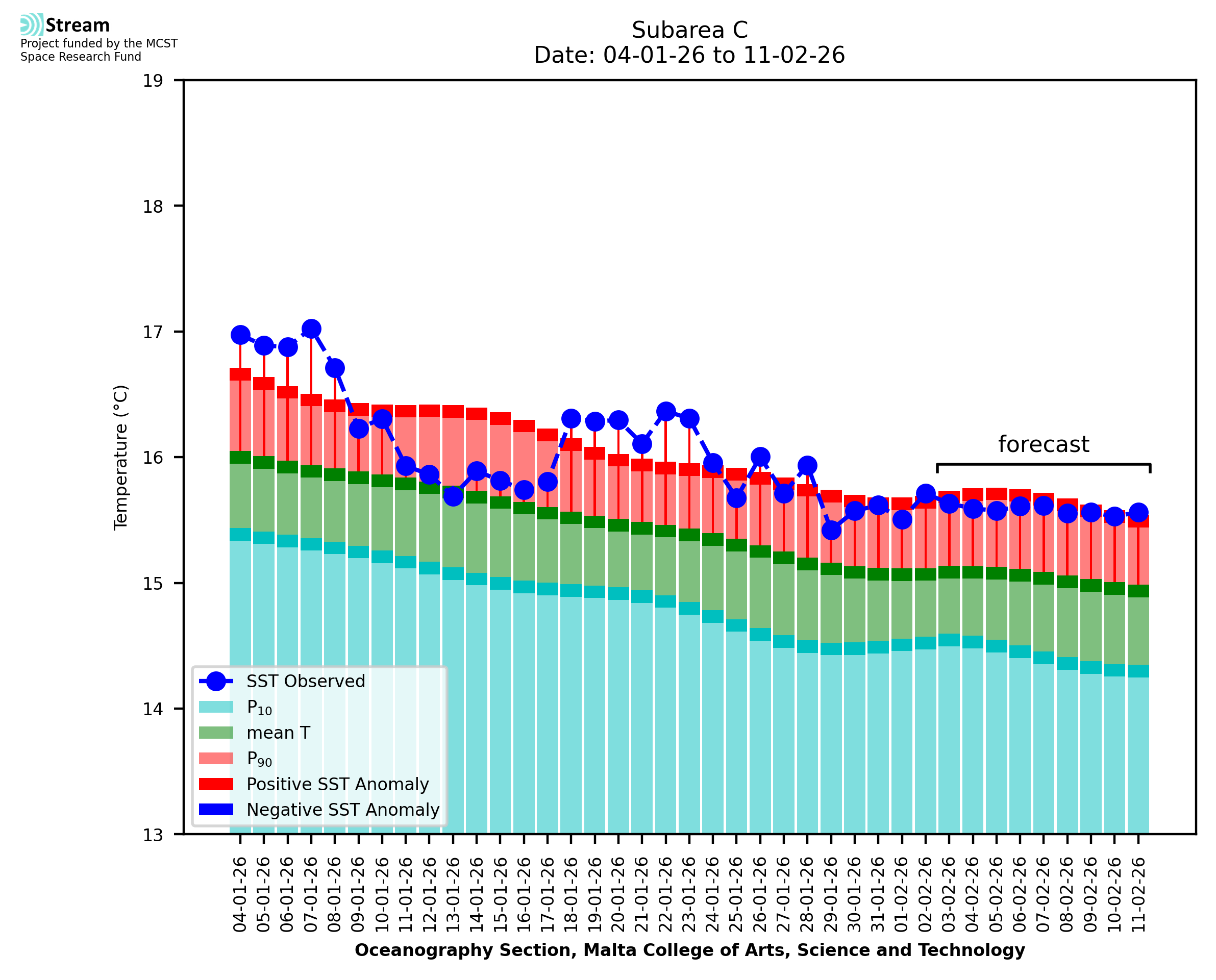 Elaborated by STREAM, the service provides daily analysis of sea surface temperature (SST) anomalies, including spatial maps for marine heat wave occurrence and intensity in the Malta shelf area. The service is based on ultra high resolution SST nighttime observations made by the infrared sensors mounted on different satellite platforms. Personalised user requests for detailed pixel-based data visualisation and access are available operationally on the STREAM web and mobile app.