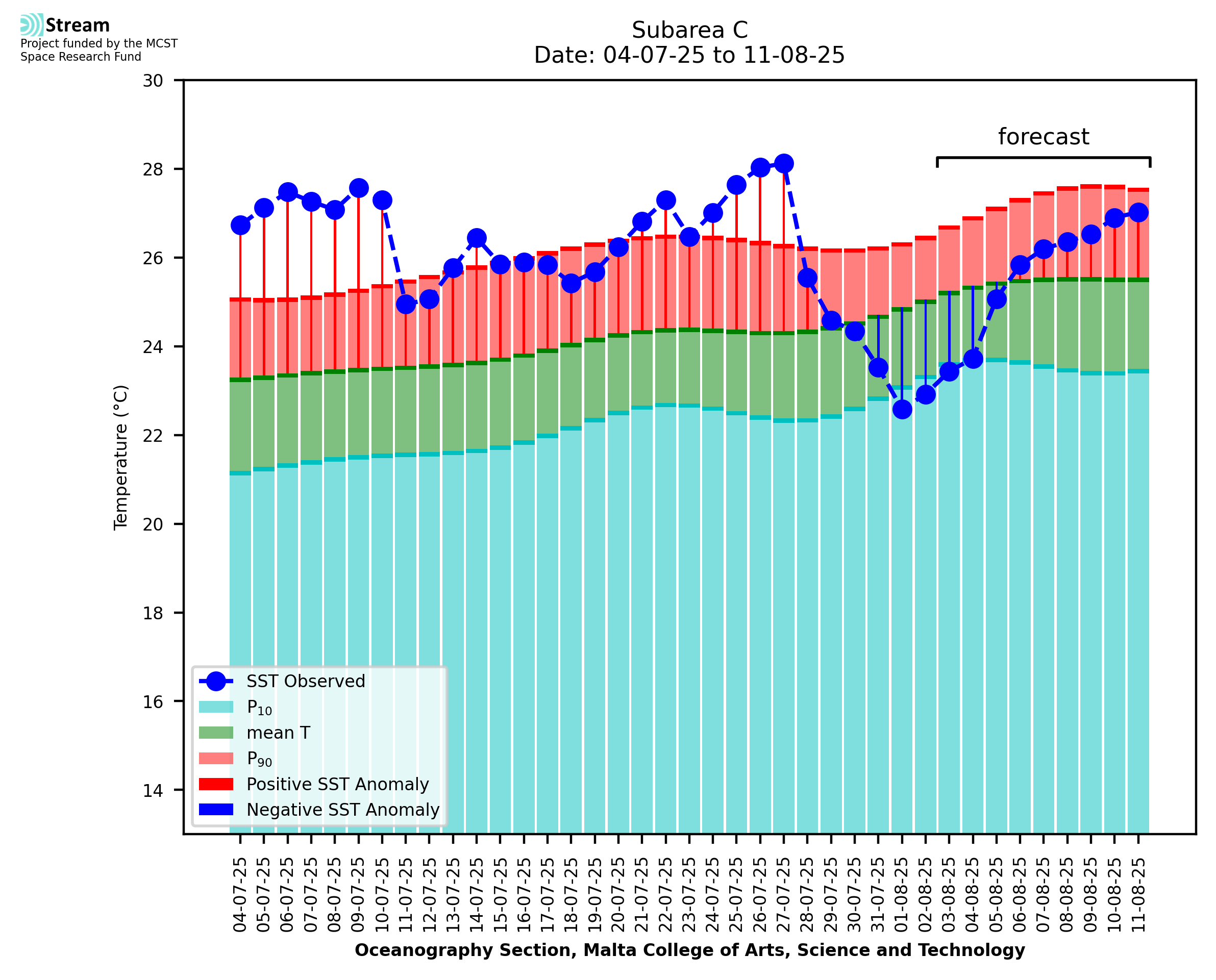 Elaborated by STREAM, the service provides daily analysis of sea surface temperature (SST) anomalies, including spatial maps for marine heat wave occurrence and intensity in the Malta shelf area. The service is based on ultra high resolution SST nighttime observations made by the infrared sensors mounted on different satellite platforms. Personalised user requests for detailed pixel-based data visualisation and access are available operationally on the STREAM web and mobile app.