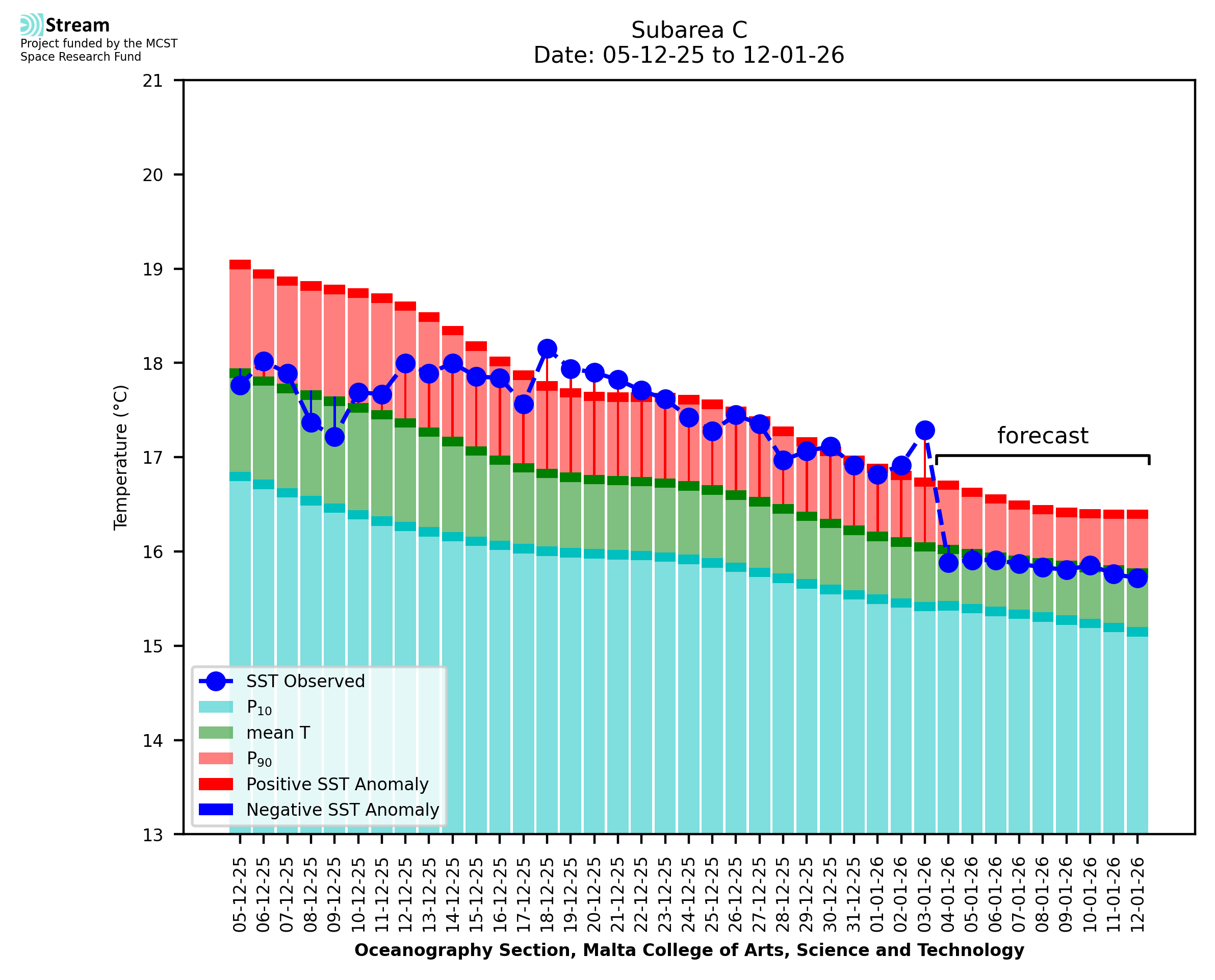Elaborated by STREAM, the service provides daily analysis of sea surface temperature (SST) anomalies, including spatial maps for marine heat wave occurrence and intensity in the Malta shelf area. The service is based on ultra high resolution SST nighttime observations made by the infrared sensors mounted on different satellite platforms. Personalised user requests for detailed pixel-based data visualisation and access are available operationally on the STREAM web and mobile app.