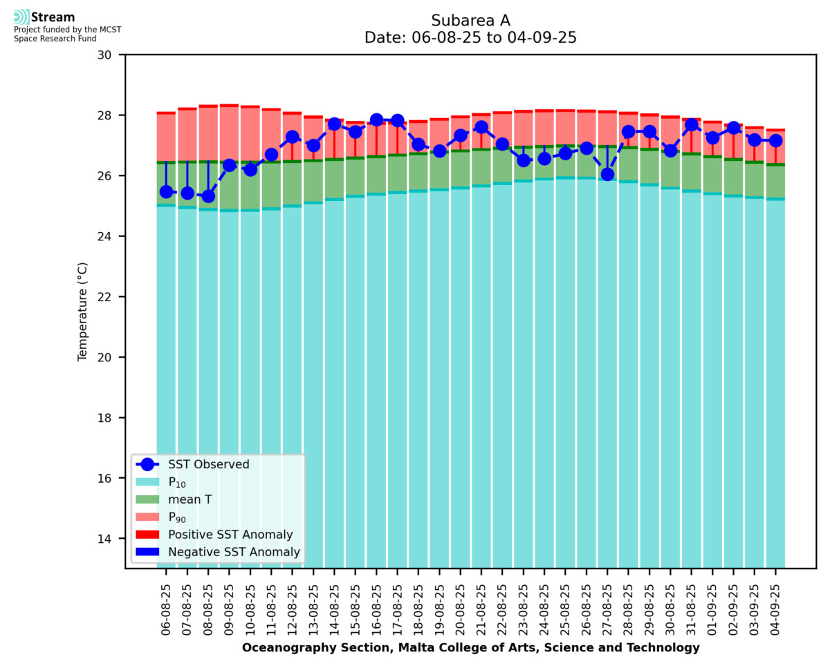 Elaborated by STREAM, the service provides daily analysis of sea surface temperature (SST) anomalies, including spatial maps for marine heat wave occurrence and intensity in the Malta shelf area. The service is based on ultra high resolution SST nighttime observations made by the infrared sensors mounted on different satellite platforms. Personalised user requests for detailed pixel-based data visualisation and access are available operationally on the STREAM web and mobile app.
