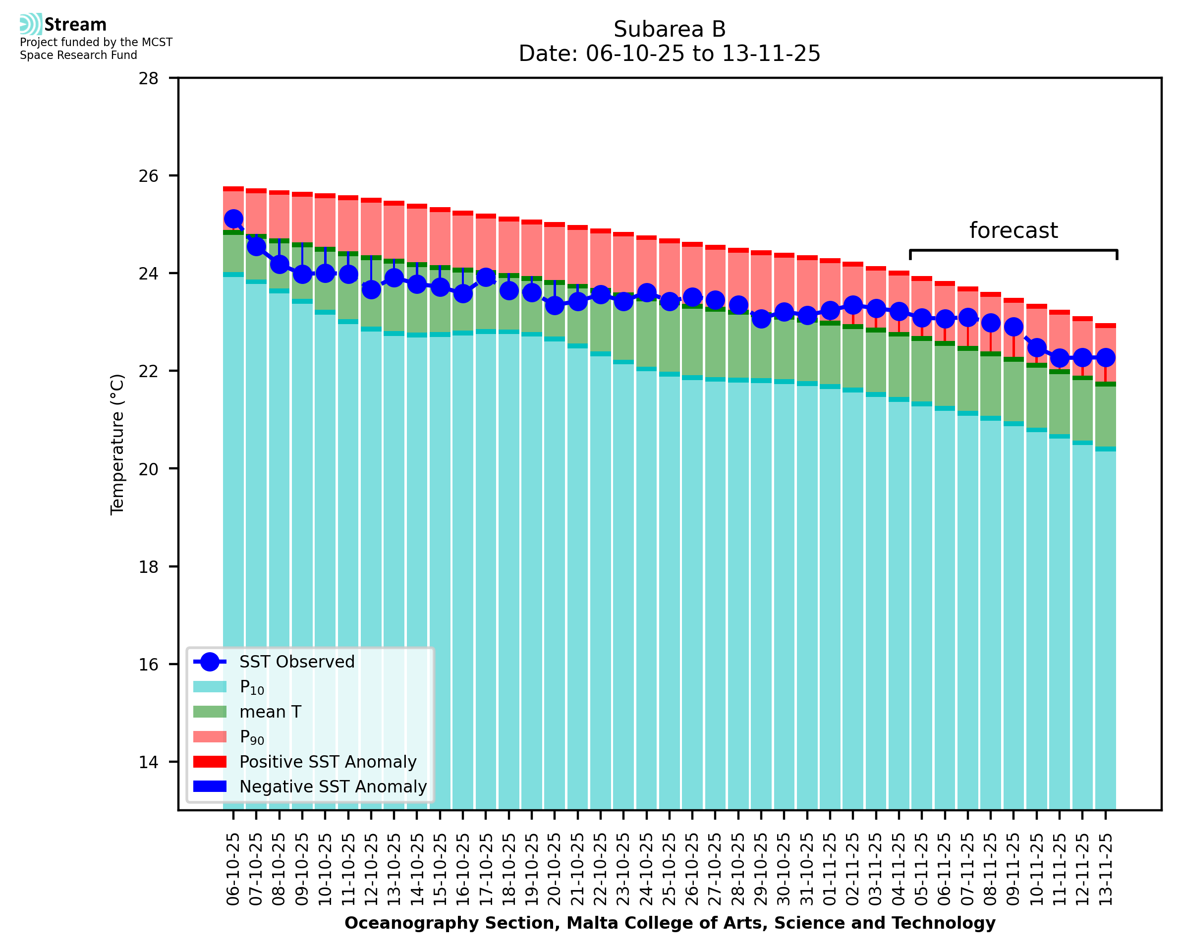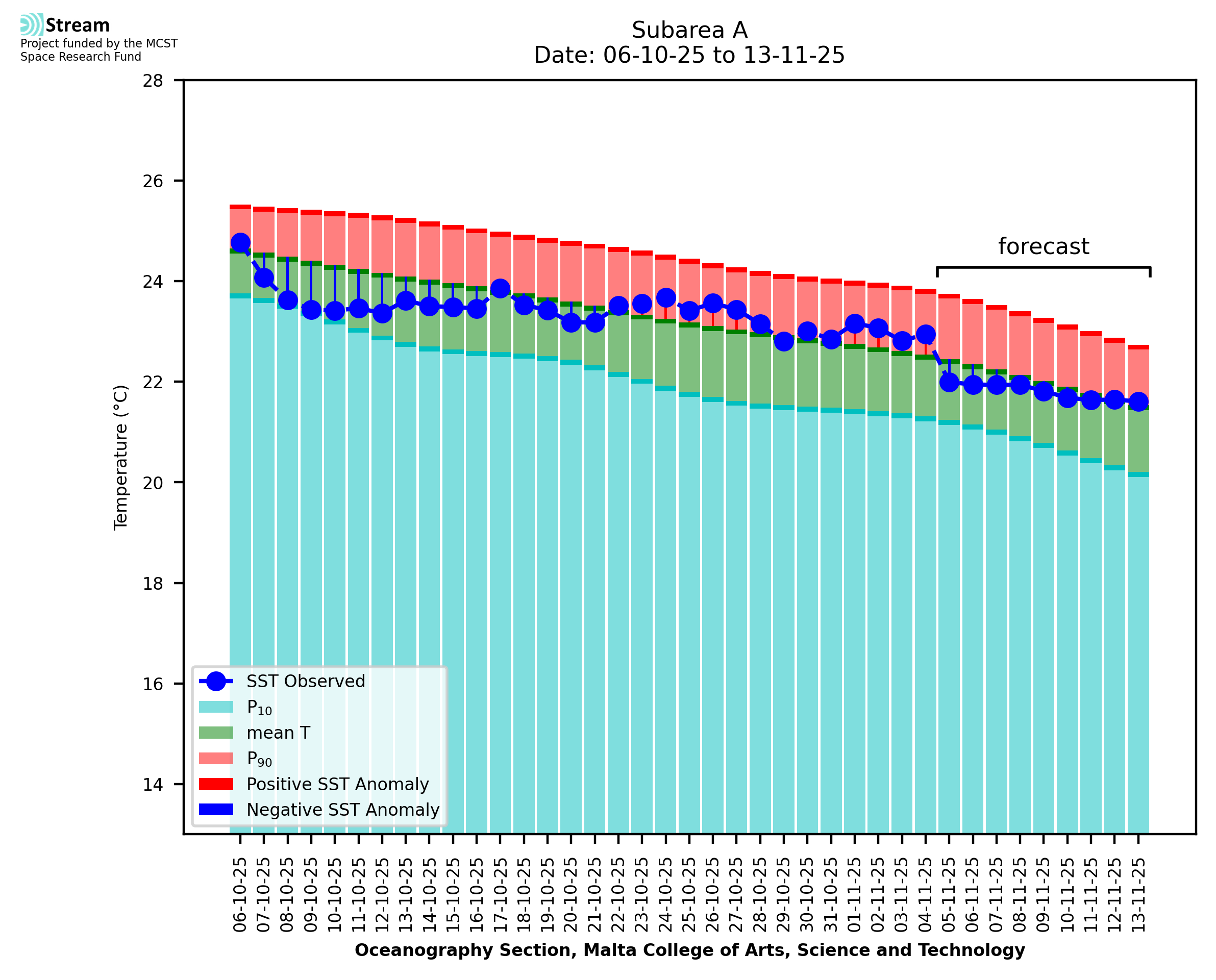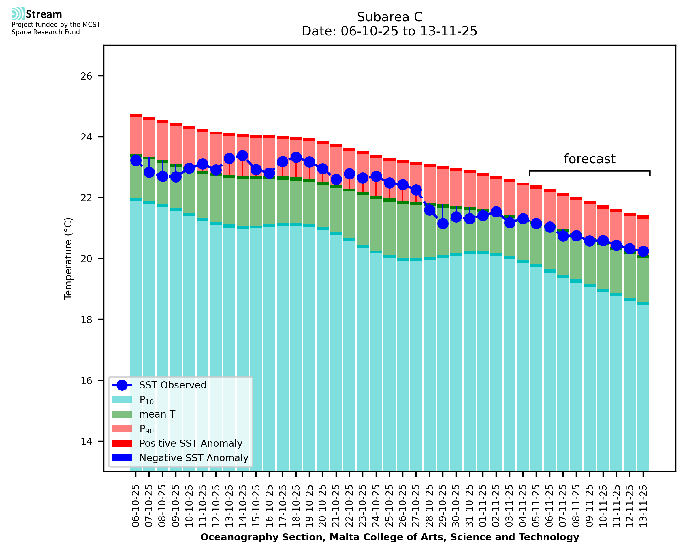 Elaborated by STREAM, the service provides daily analysis of sea surface temperature (SST) anomalies, including spatial maps for marine heat wave occurrence and intensity in the Malta shelf area. The service is based on ultra high resolution SST nighttime observations made by the infrared sensors mounted on different satellite platforms. Personalised user requests for detailed pixel-based data visualisation and access are available operationally on the STREAM web and mobile app.