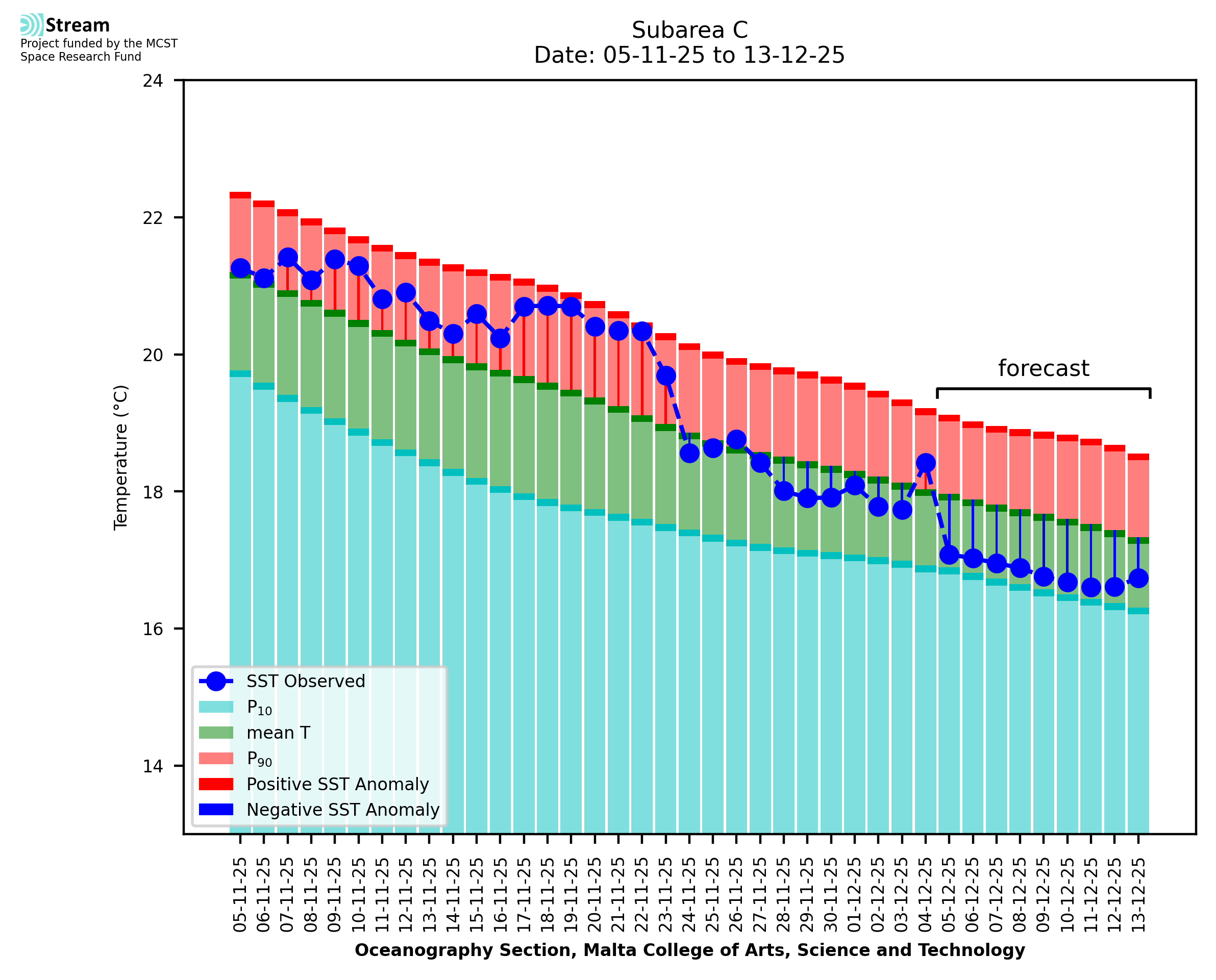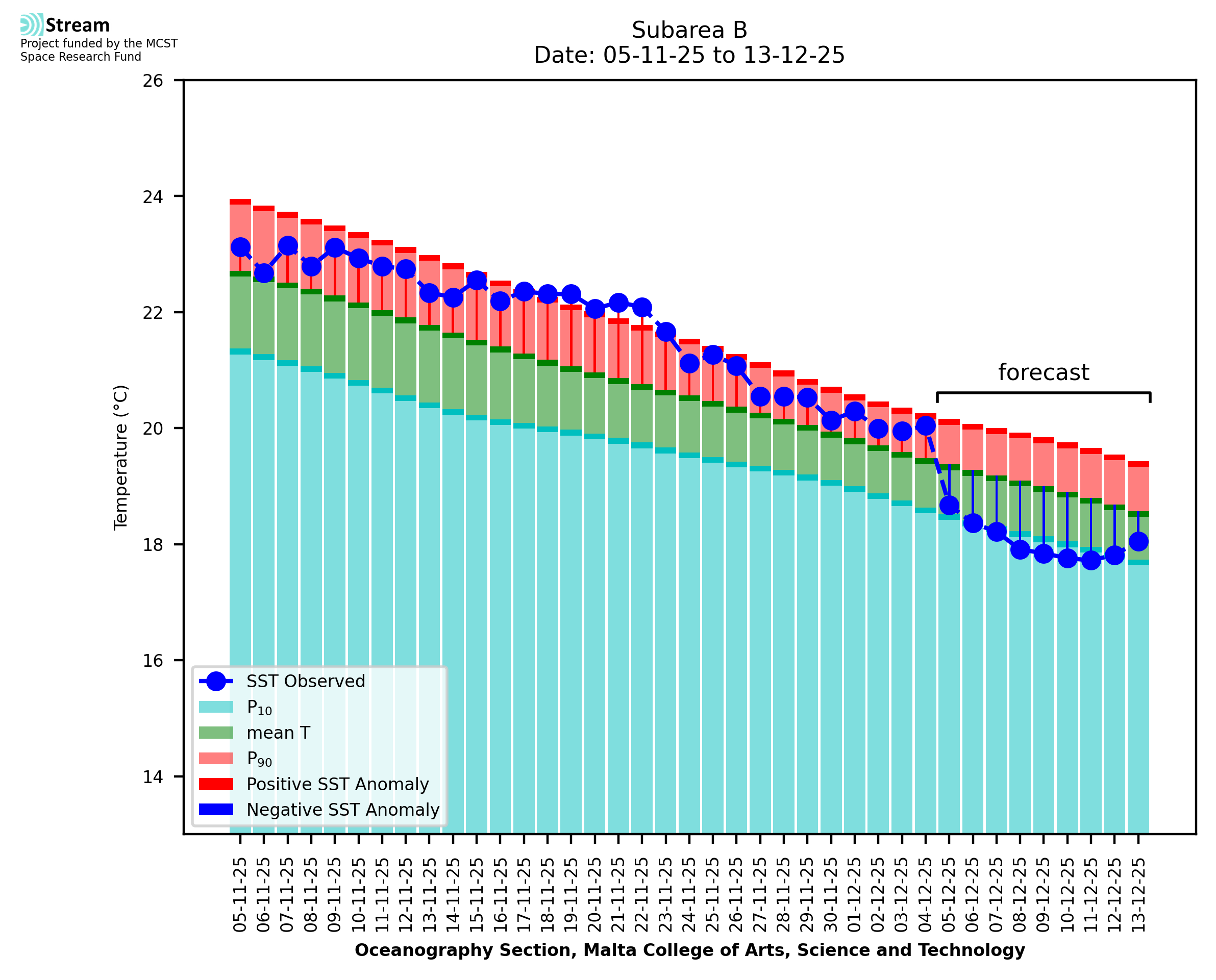 Elaborated by STREAM, the service provides daily analysis of sea surface temperature (SST) anomalies, including spatial maps for marine heat wave occurrence and intensity in the Malta shelf area. The service is based on ultra high resolution SST nighttime observations made by the infrared sensors mounted on different satellite platforms. Personalised user requests for detailed pixel-based data visualisation and access are available operationally on the STREAM web and mobile app.