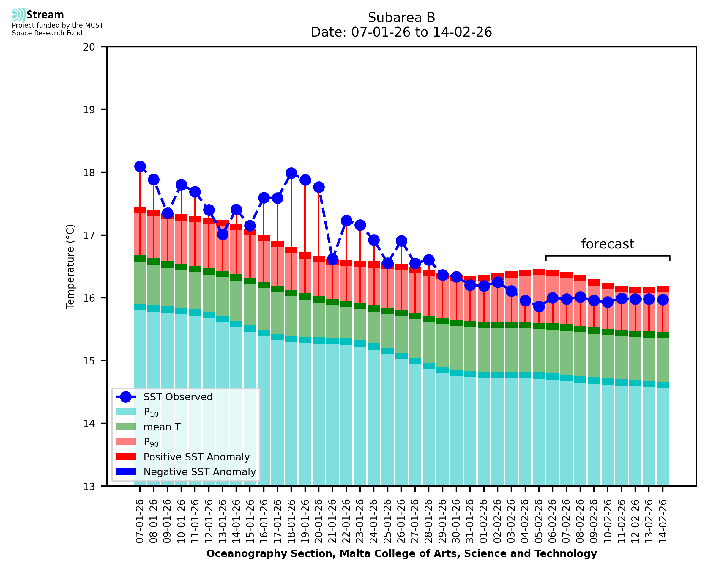 Elaborated by STREAM, the service provides daily analysis of sea surface temperature (SST) anomalies, including spatial maps for marine heat wave occurrence and intensity in the Malta shelf area. The service is based on ultra high resolution SST nighttime observations made by the infrared sensors mounted on different satellite platforms. Personalised user requests for detailed pixel-based data visualisation and access are available operationally on the STREAM web and mobile app.