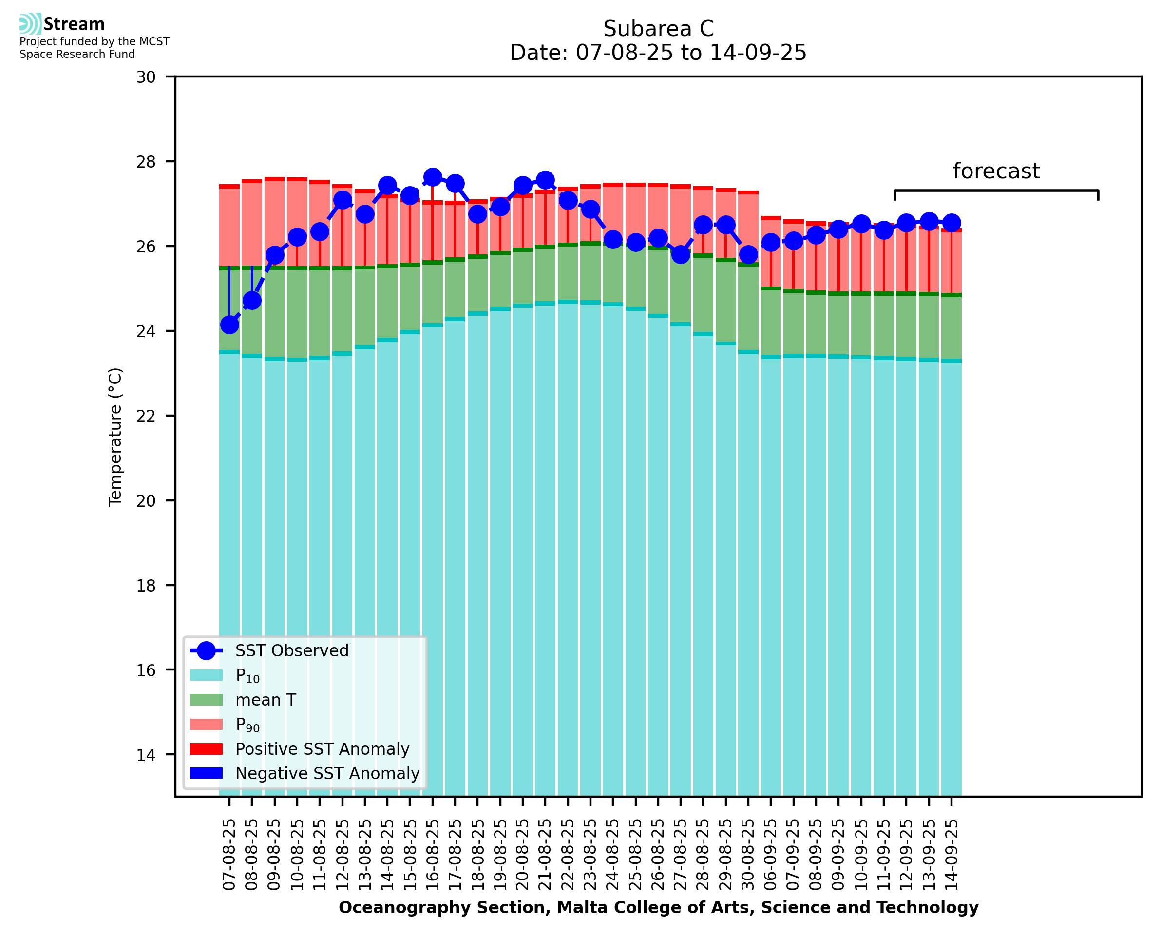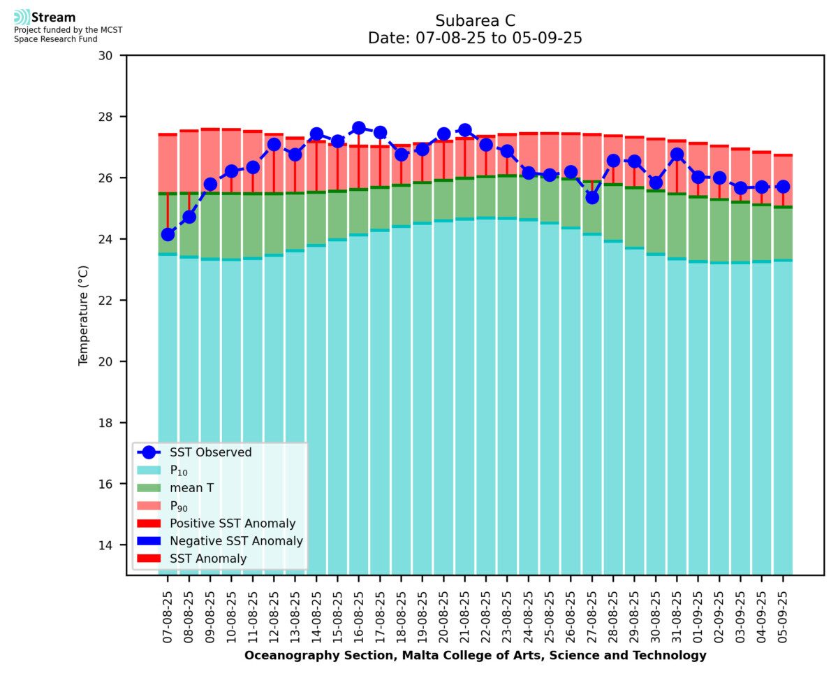 Elaborated by STREAM, the service provides daily analysis of sea surface temperature (SST) anomalies, including spatial maps for marine heat wave occurrence and intensity in the Malta shelf area. The service is based on ultra high resolution SST nighttime observations made by the infrared sensors mounted on different satellite platforms. Personalised user requests for detailed pixel-based data visualisation and access are available operationally on the STREAM web and mobile app.
