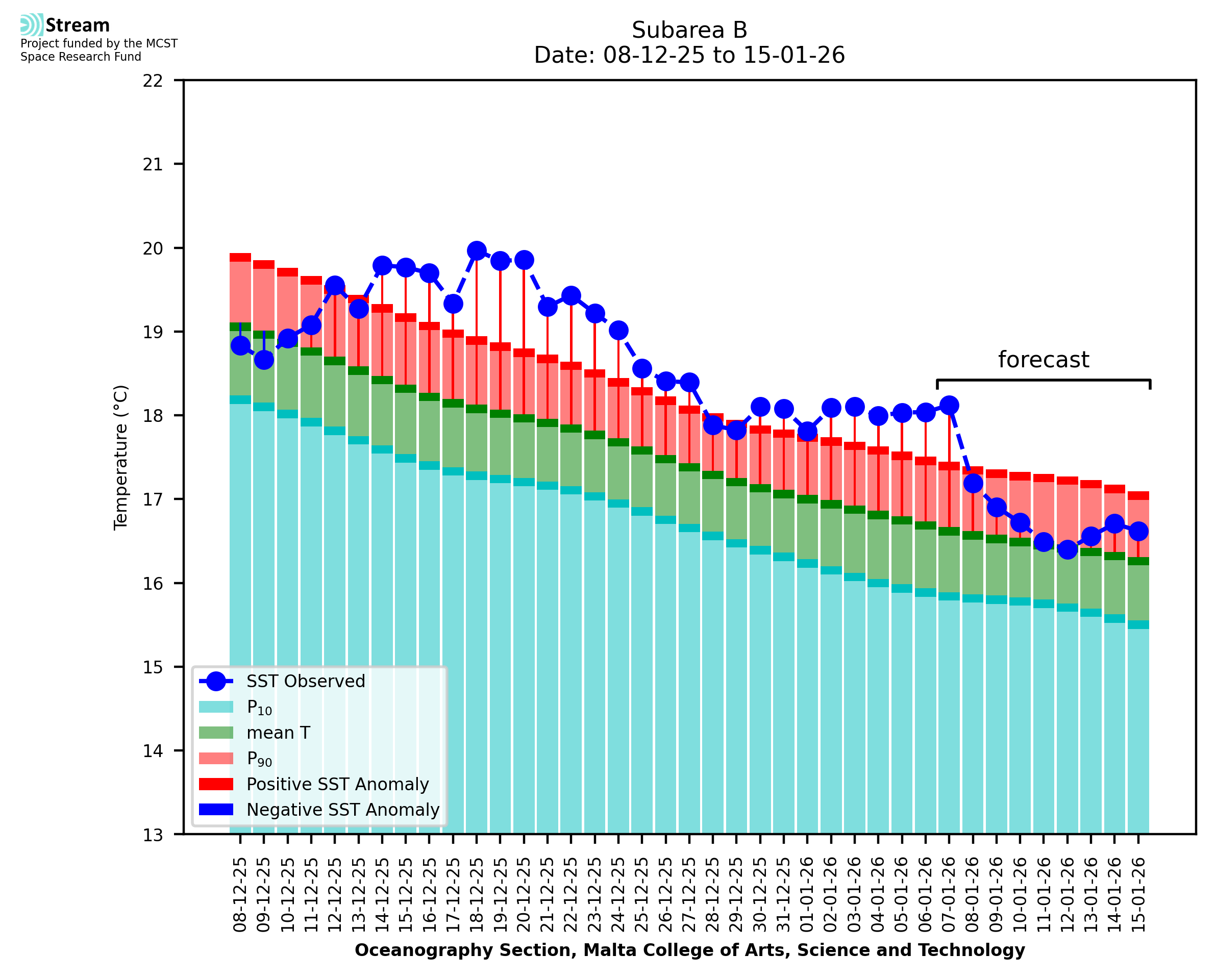 Elaborated by STREAM, the service provides daily analysis of sea surface temperature (SST) anomalies, including spatial maps for marine heat wave occurrence and intensity in the Malta shelf area. The service is based on ultra high resolution SST nighttime observations made by the infrared sensors mounted on different satellite platforms. Personalised user requests for detailed pixel-based data visualisation and access are available operationally on the STREAM web and mobile app.