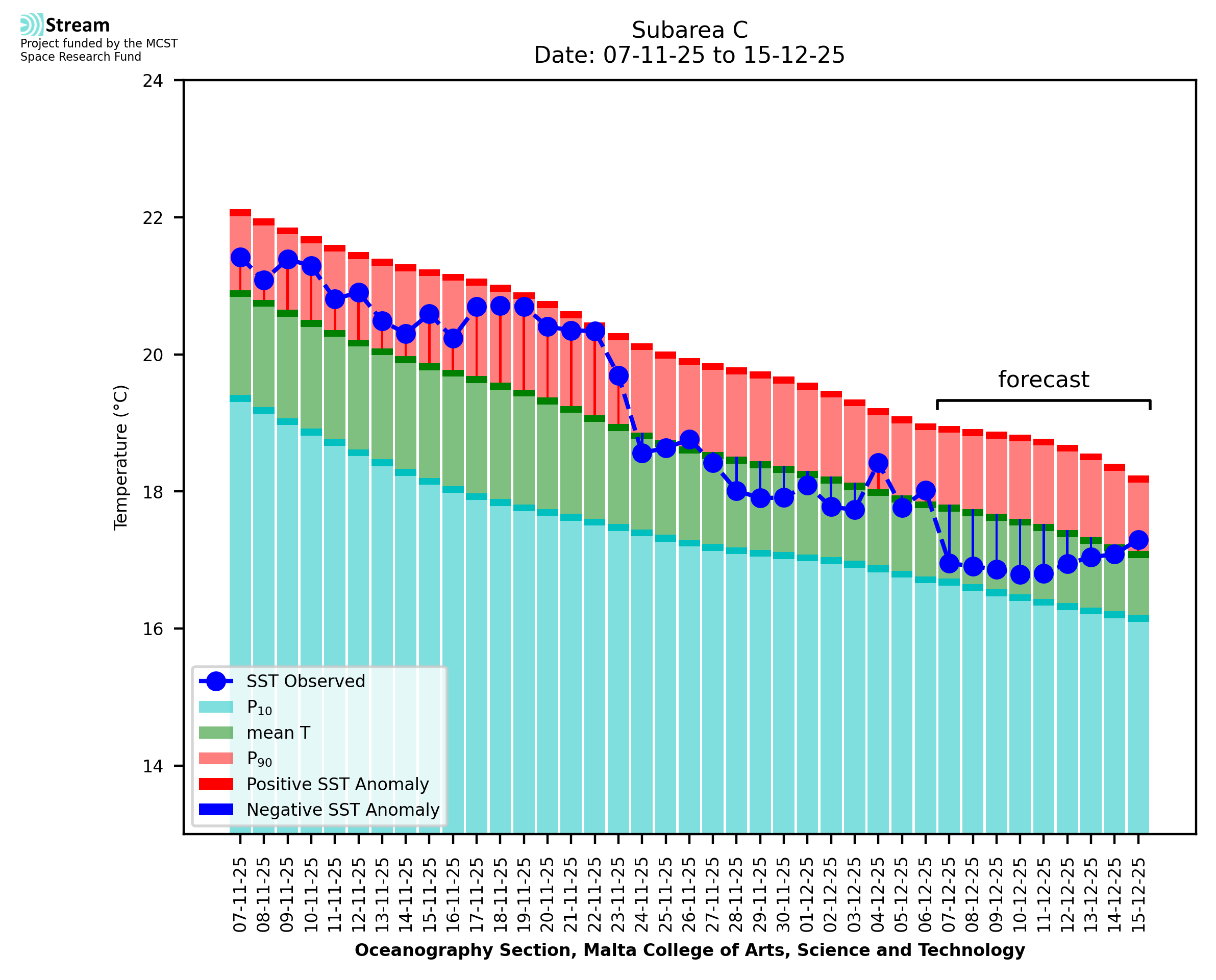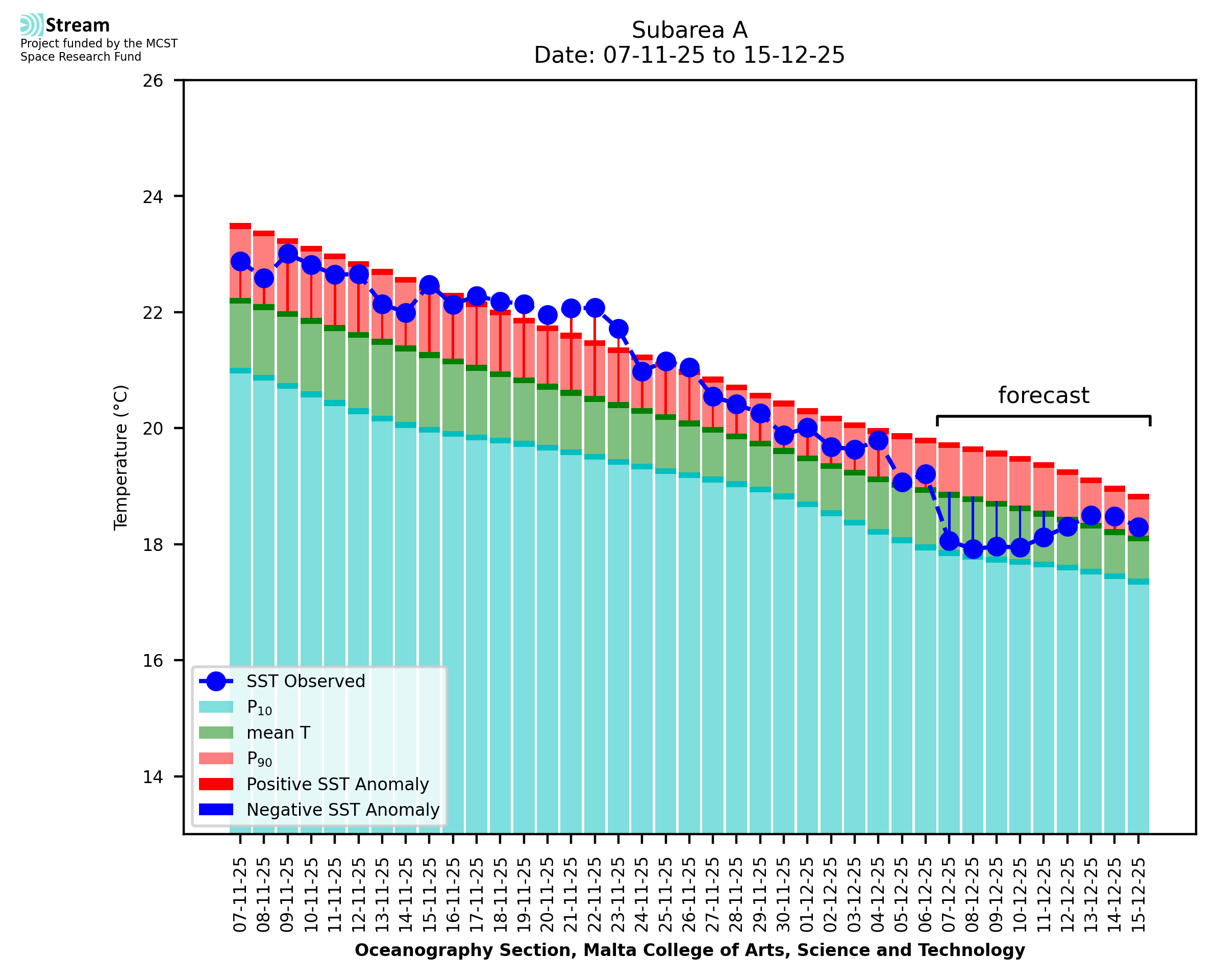Elaborated by STREAM, the service provides daily analysis of sea surface temperature (SST) anomalies, including spatial maps for marine heat wave occurrence and intensity in the Malta shelf area. The service is based on ultra high resolution SST nighttime observations made by the infrared sensors mounted on different satellite platforms. Personalised user requests for detailed pixel-based data visualisation and access are available operationally on the STREAM web and mobile app.