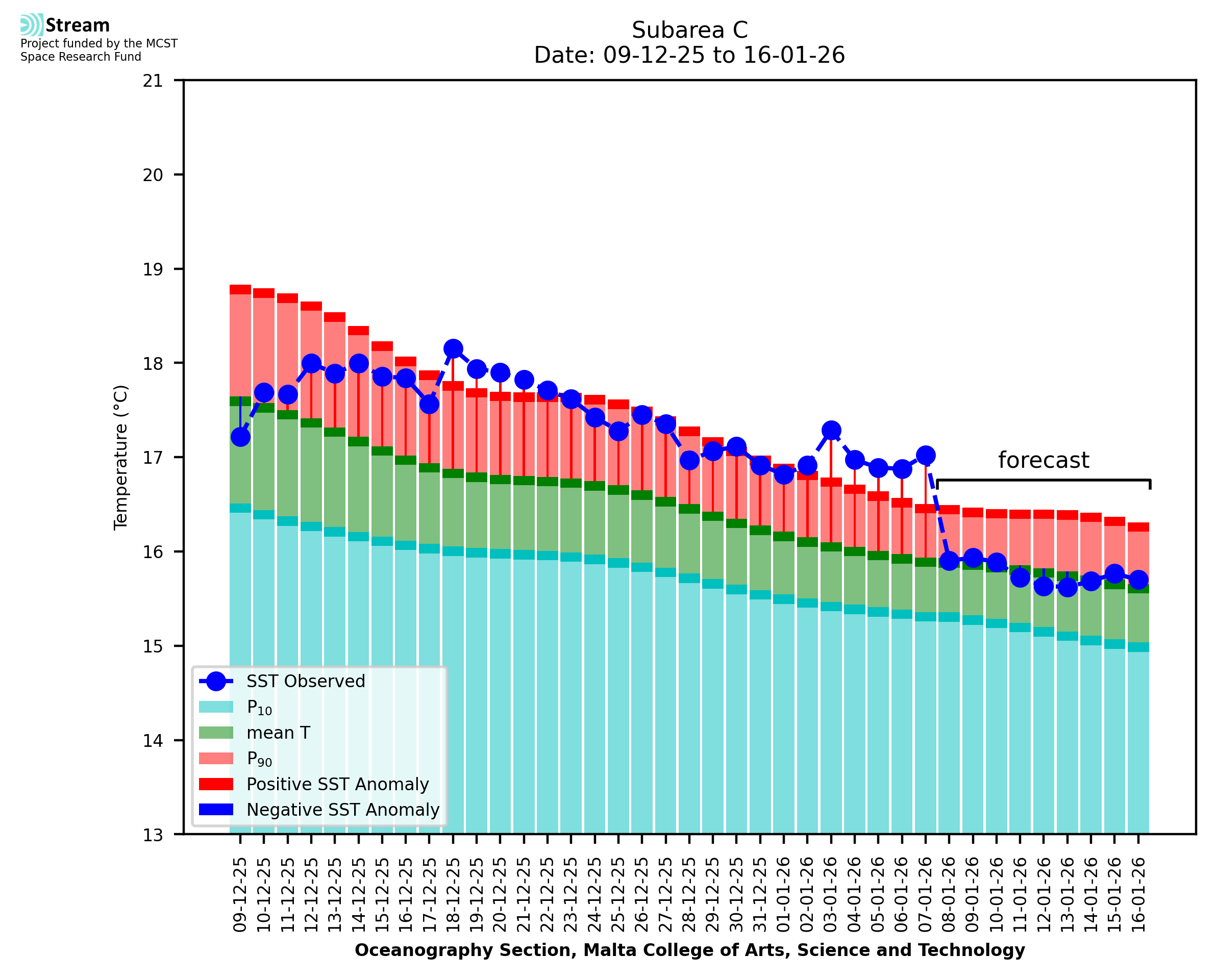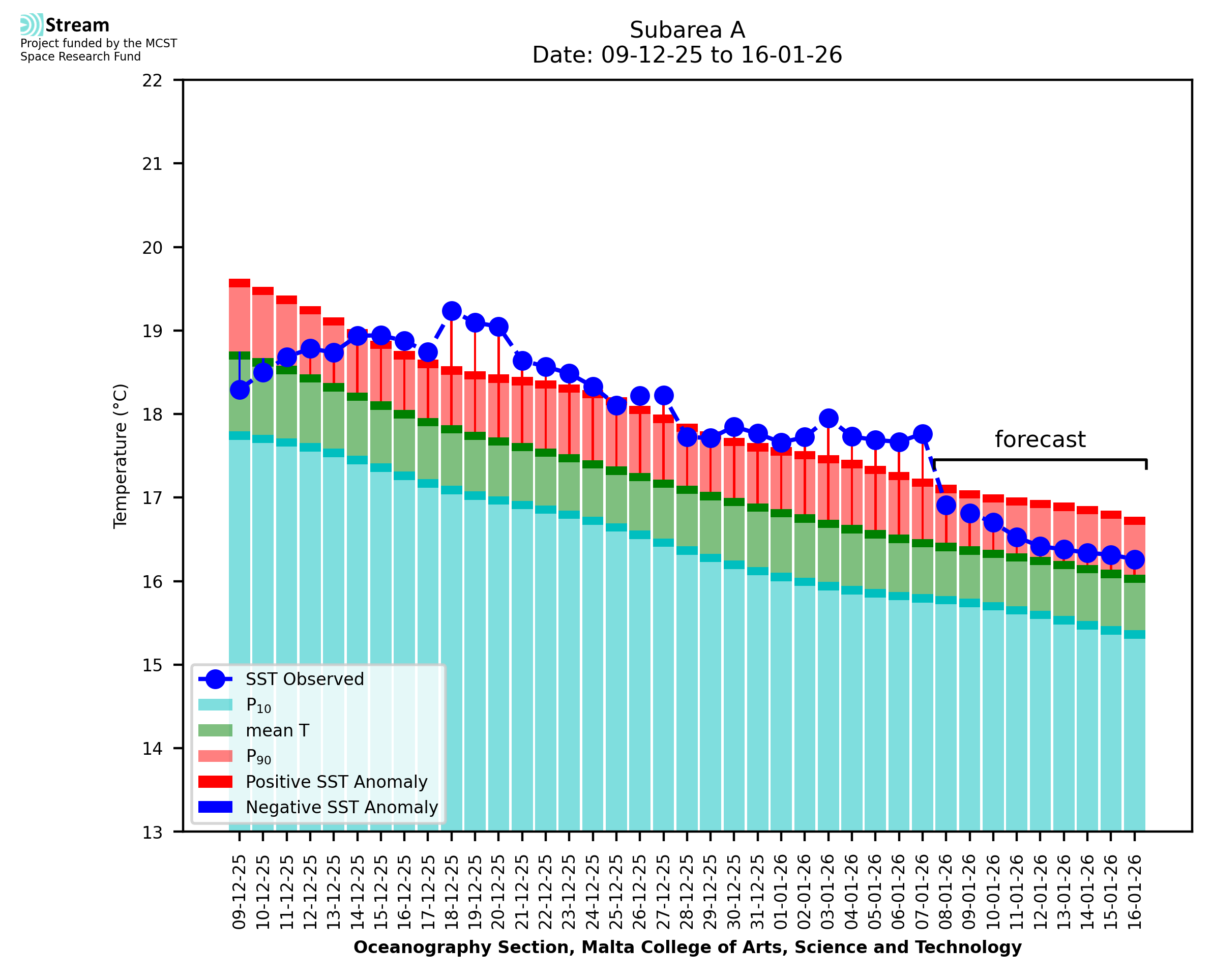 Elaborated by STREAM, the service provides daily analysis of sea surface temperature (SST) anomalies, including spatial maps for marine heat wave occurrence and intensity in the Malta shelf area. The service is based on ultra high resolution SST nighttime observations made by the infrared sensors mounted on different satellite platforms. Personalised user requests for detailed pixel-based data visualisation and access are available operationally on the STREAM web and mobile app.