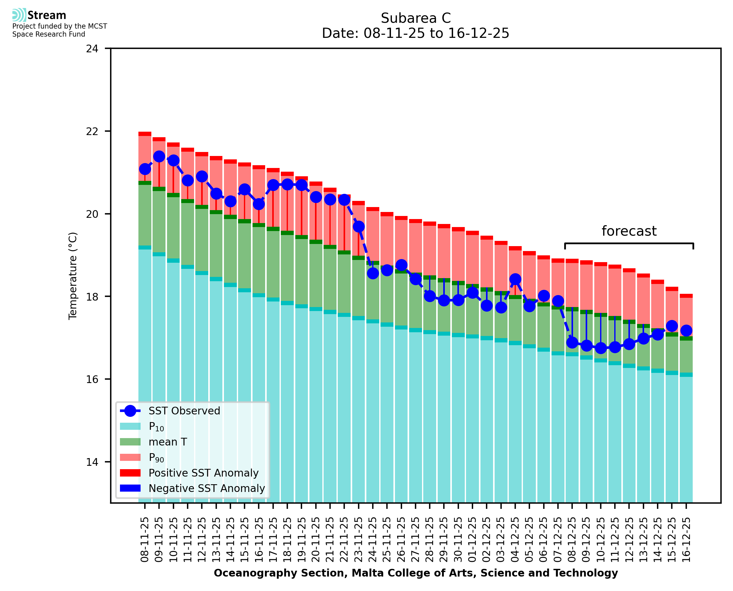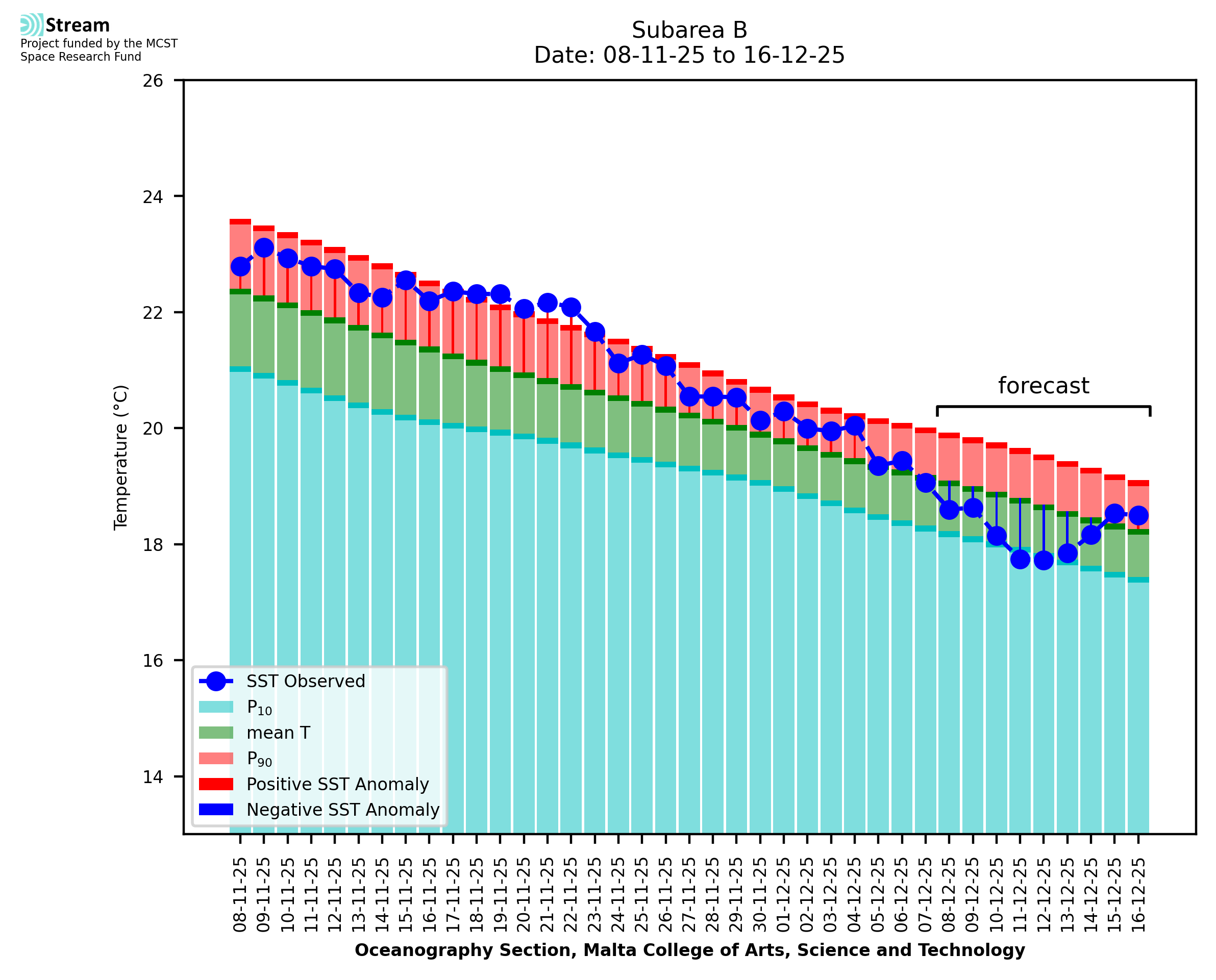 Elaborated by STREAM, the service provides daily analysis of sea surface temperature (SST) anomalies, including spatial maps for marine heat wave occurrence and intensity in the Malta shelf area. The service is based on ultra high resolution SST nighttime observations made by the infrared sensors mounted on different satellite platforms. Personalised user requests for detailed pixel-based data visualisation and access are available operationally on the STREAM web and mobile app.