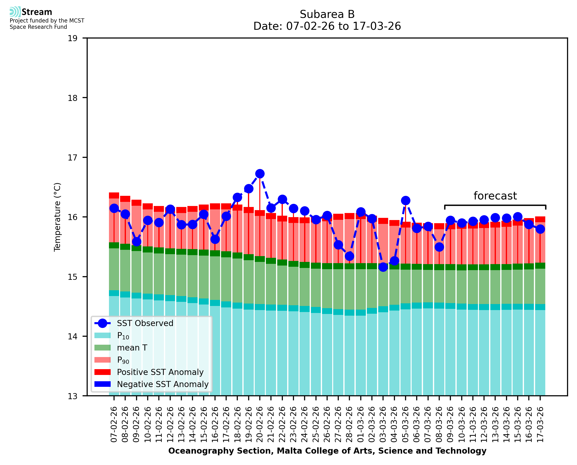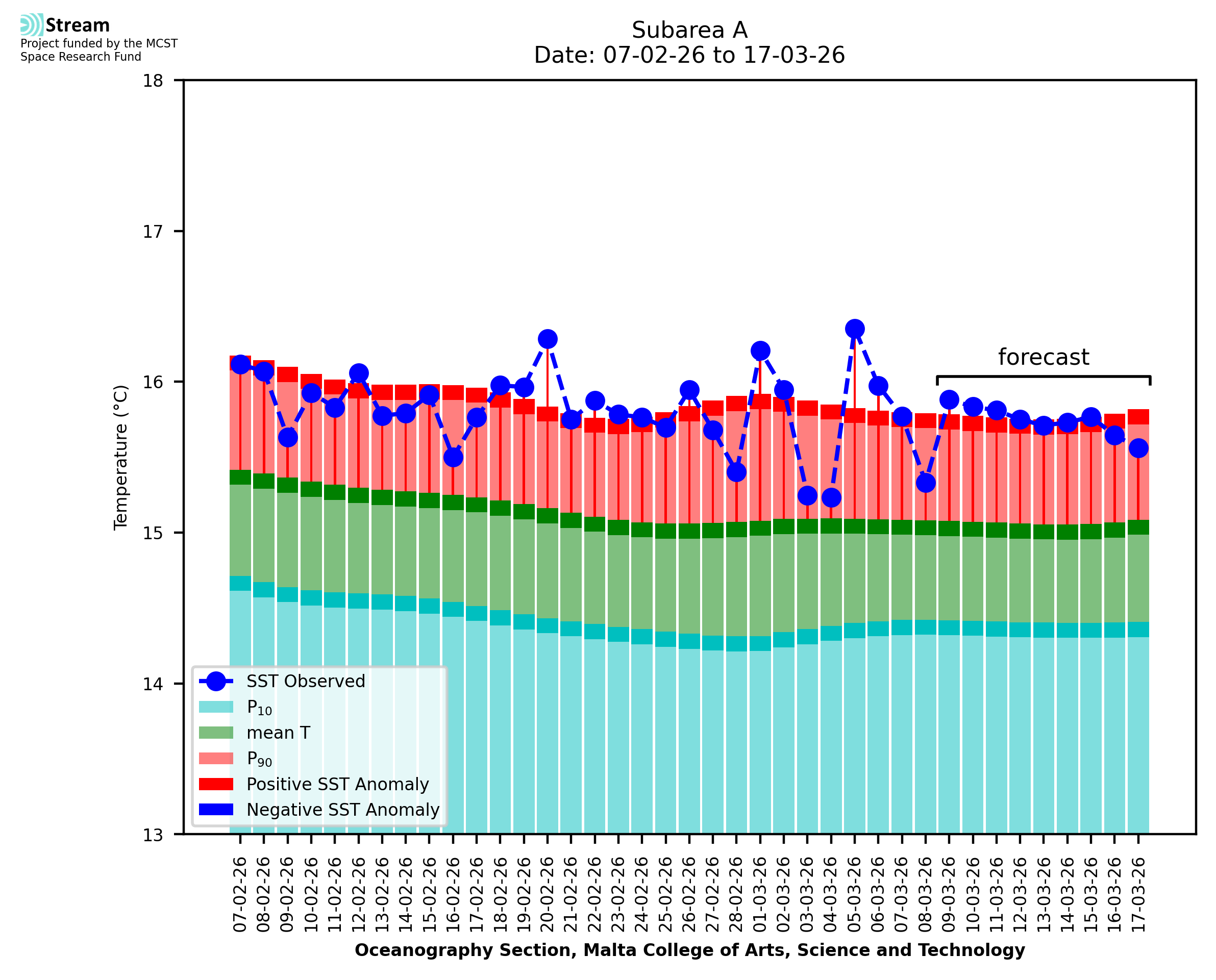 Elaborated by STREAM, the service provides daily analysis of sea surface temperature (SST) anomalies, including spatial maps for marine heat wave occurrence and intensity in the Malta shelf area. The service is based on ultra high resolution SST nighttime observations made by the infrared sensors mounted on different satellite platforms. Personalised user requests for detailed pixel-based data visualisation and access are available operationally on the STREAM web and mobile app.