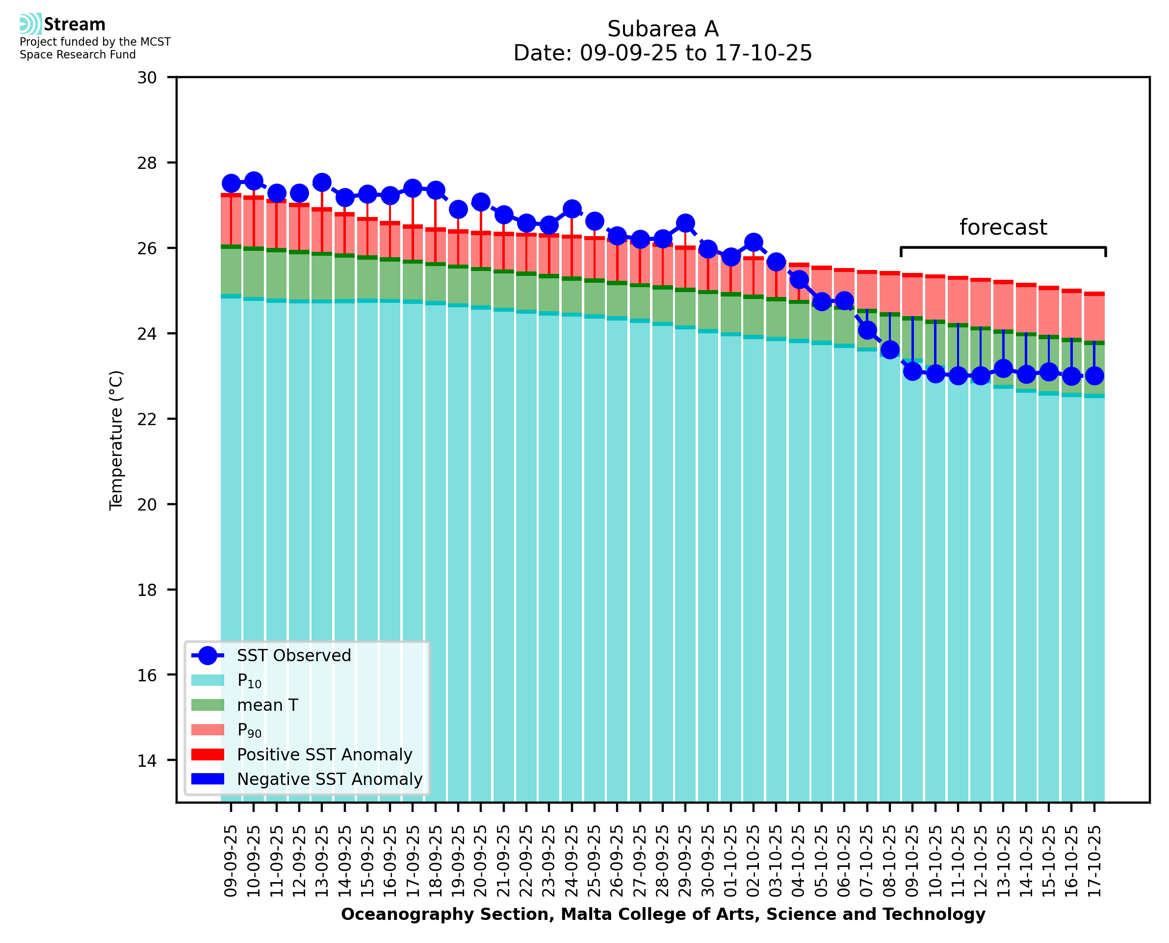 Elaborated by STREAM, the service provides daily analysis of sea surface temperature (SST) anomalies, including spatial maps for marine heat wave occurrence and intensity in the Malta shelf area. The service is based on ultra high resolution SST nighttime observations made by the infrared sensors mounted on different satellite platforms. Personalised user requests for detailed pixel-based data visualisation and access are available operationally on the STREAM web and mobile app.