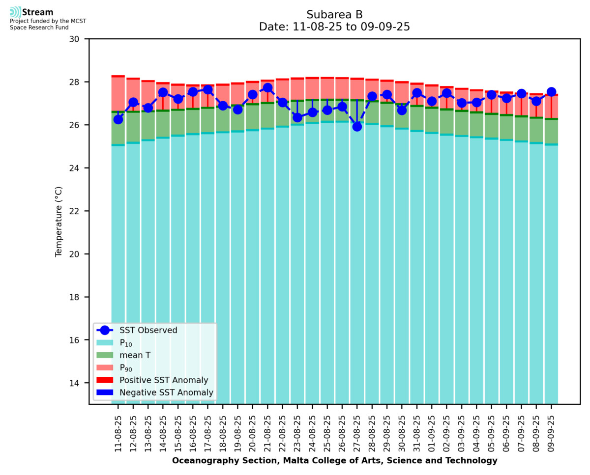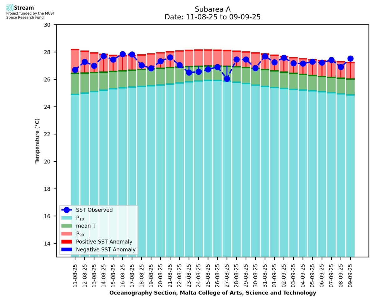 Elaborated by STREAM, the service provides daily analysis of sea surface temperature (SST) anomalies, including spatial maps for marine heat wave occurrence and intensity in the Malta shelf area. The service is based on ultra high resolution SST nighttime observations made by the infrared sensors mounted on different satellite platforms. Personalised user requests for detailed pixel-based data visualisation and access are available operationally on the STREAM web and mobile app.