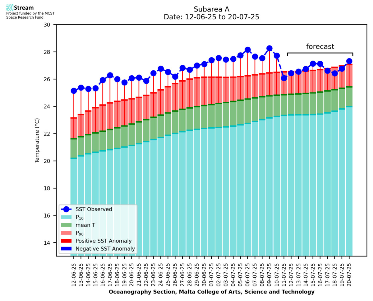 Elaborated by STREAM, the service provides daily analysis of sea surface temperature (SST) anomalies, including spatial maps for marine heat wave occurrence and intensity in the Malta shelf area. The service is based on ultra high resolution SST nighttime observations made by the infrared sensors mounted on different satellite platforms. Personalised user requests for detailed pixel-based data visualisation and access are available operationally on the STREAM web and mobile app.