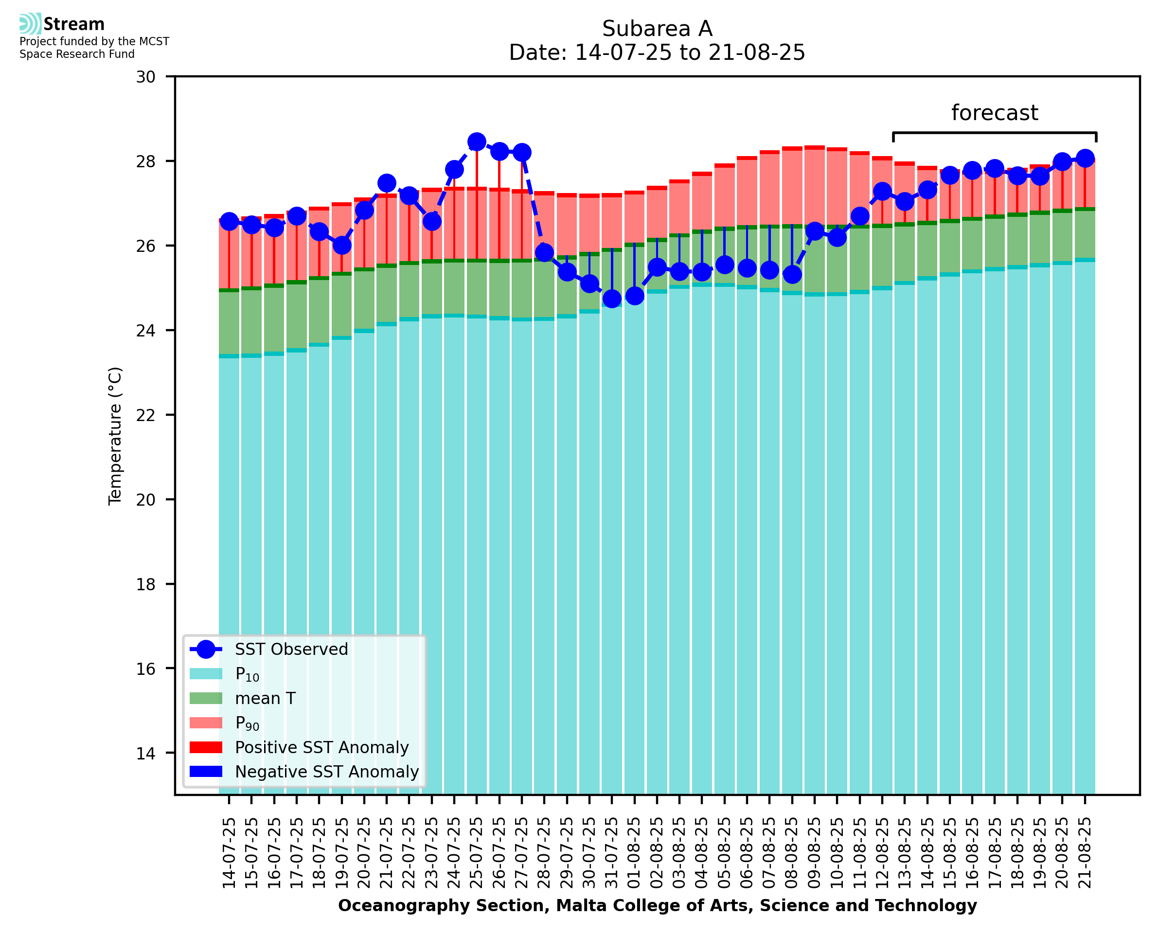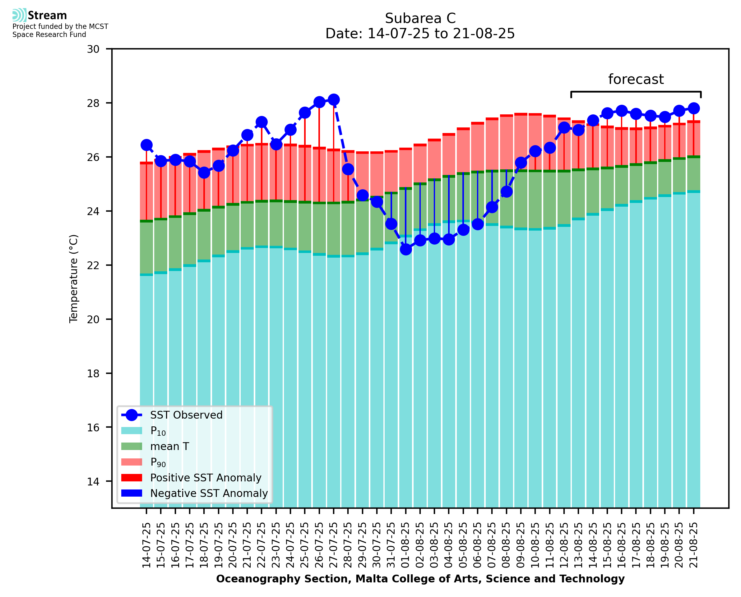 Elaborated by STREAM, the service provides daily analysis of sea surface temperature (SST) anomalies, including spatial maps for marine heat wave occurrence and intensity in the Malta shelf area. The service is based on ultra high resolution SST nighttime observations made by the infrared sensors mounted on different satellite platforms. Personalised user requests for detailed pixel-based data visualisation and access are available operationally on the STREAM web and mobile app.
