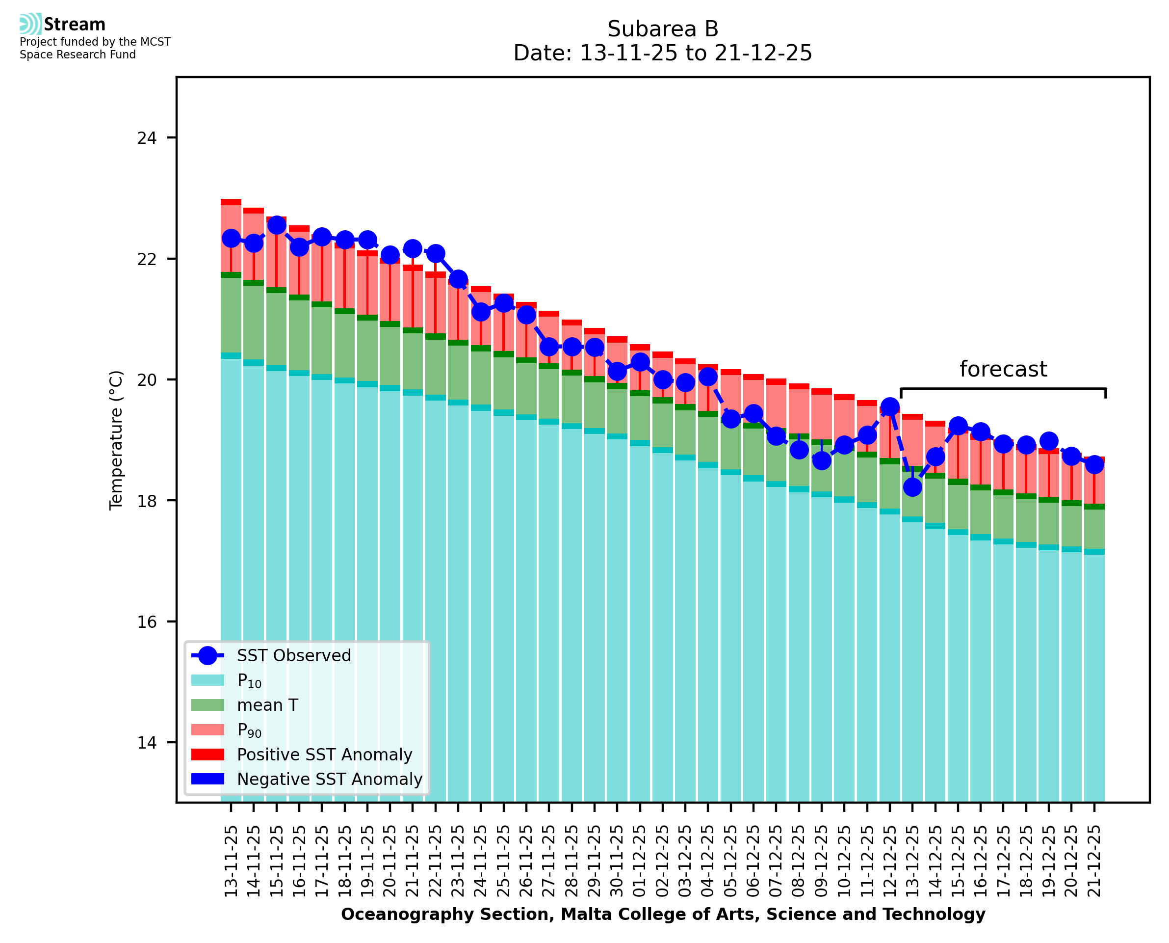 Elaborated by STREAM, the service provides daily analysis of sea surface temperature (SST) anomalies, including spatial maps for marine heat wave occurrence and intensity in the Malta shelf area. The service is based on ultra high resolution SST nighttime observations made by the infrared sensors mounted on different satellite platforms. Personalised user requests for detailed pixel-based data visualisation and access are available operationally on the STREAM web and mobile app.