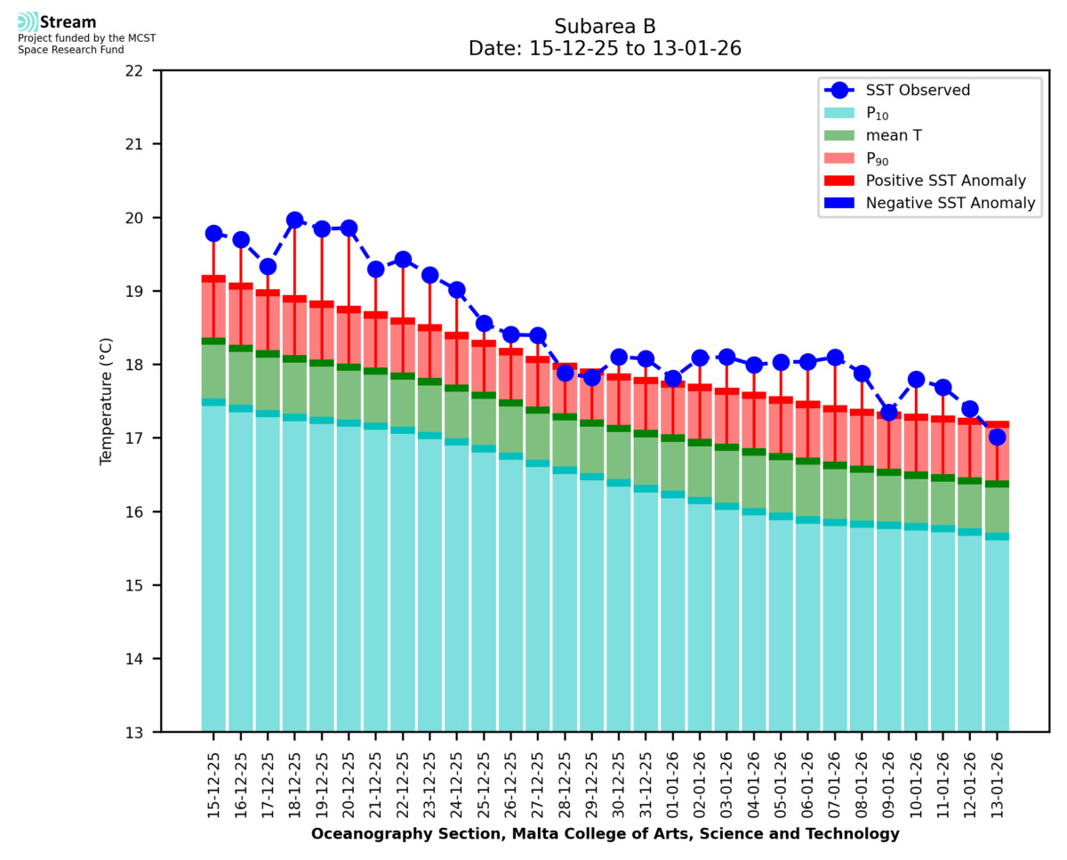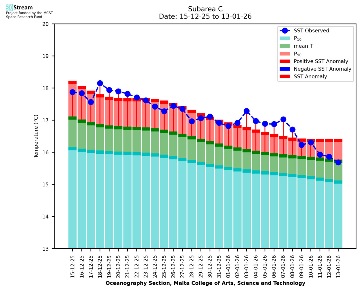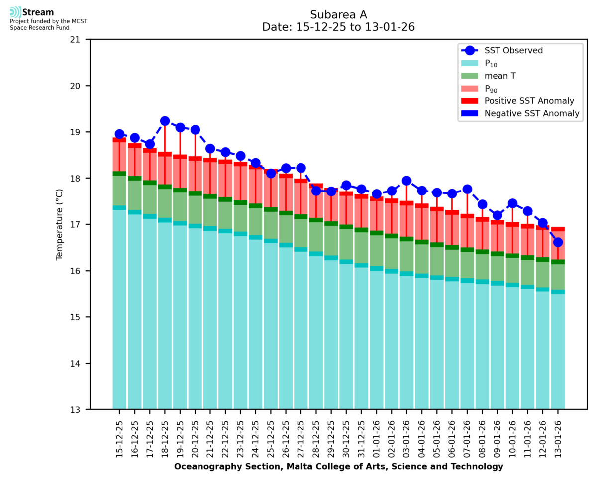 Elaborated by STREAM, the service provides daily analysis of sea surface temperature (SST) anomalies, including spatial maps for marine heat wave occurrence and intensity in the Malta shelf area. The service is based on ultra high resolution SST nighttime observations made by the infrared sensors mounted on different satellite platforms. Personalised user requests for detailed pixel-based data visualisation and access are available operationally on the STREAM web and mobile app.