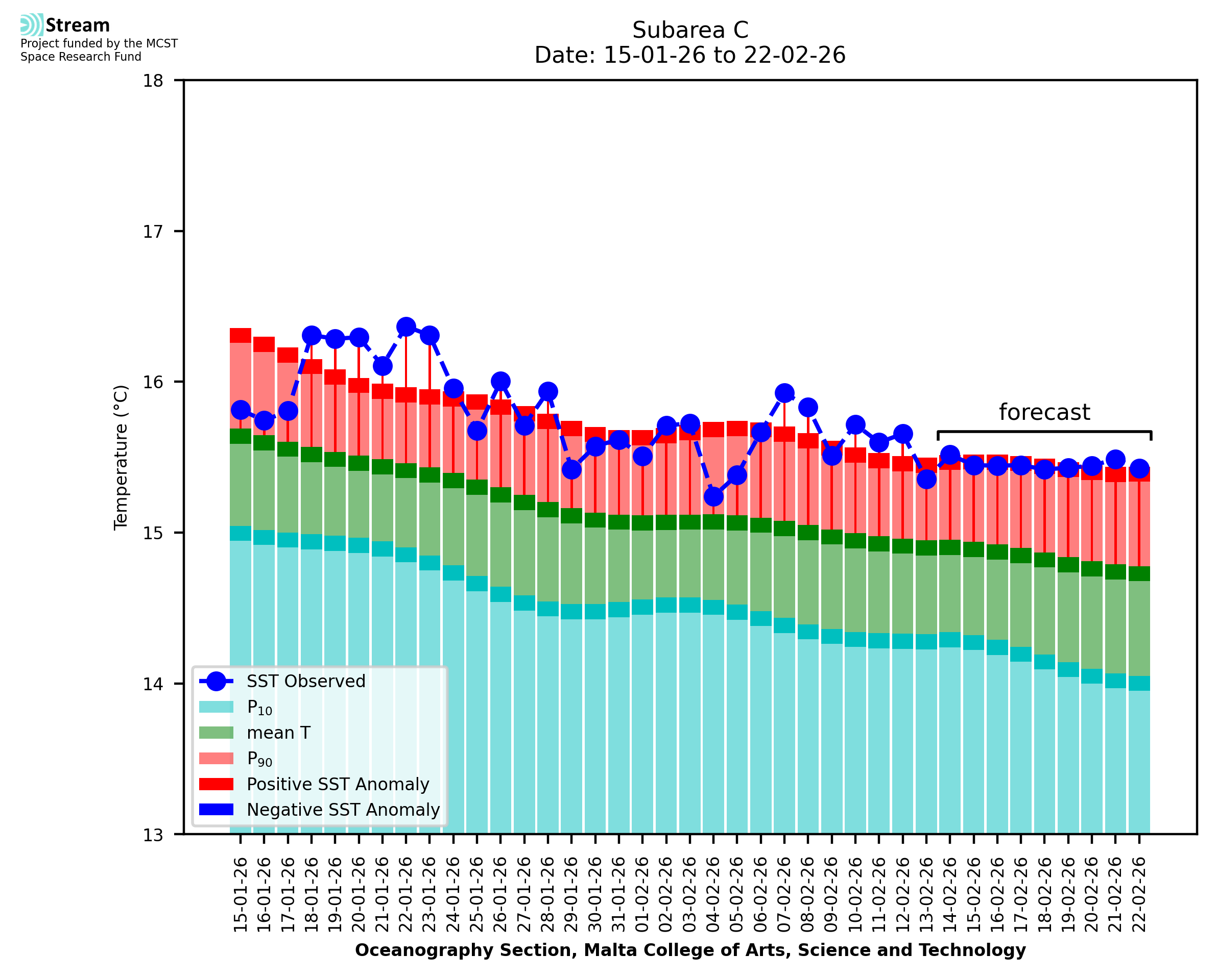 Elaborated by STREAM, the service provides daily analysis of sea surface temperature (SST) anomalies, including spatial maps for marine heat wave occurrence and intensity in the Malta shelf area. The service is based on ultra high resolution SST nighttime observations made by the infrared sensors mounted on different satellite platforms. Personalised user requests for detailed pixel-based data visualisation and access are available operationally on the STREAM web and mobile app.