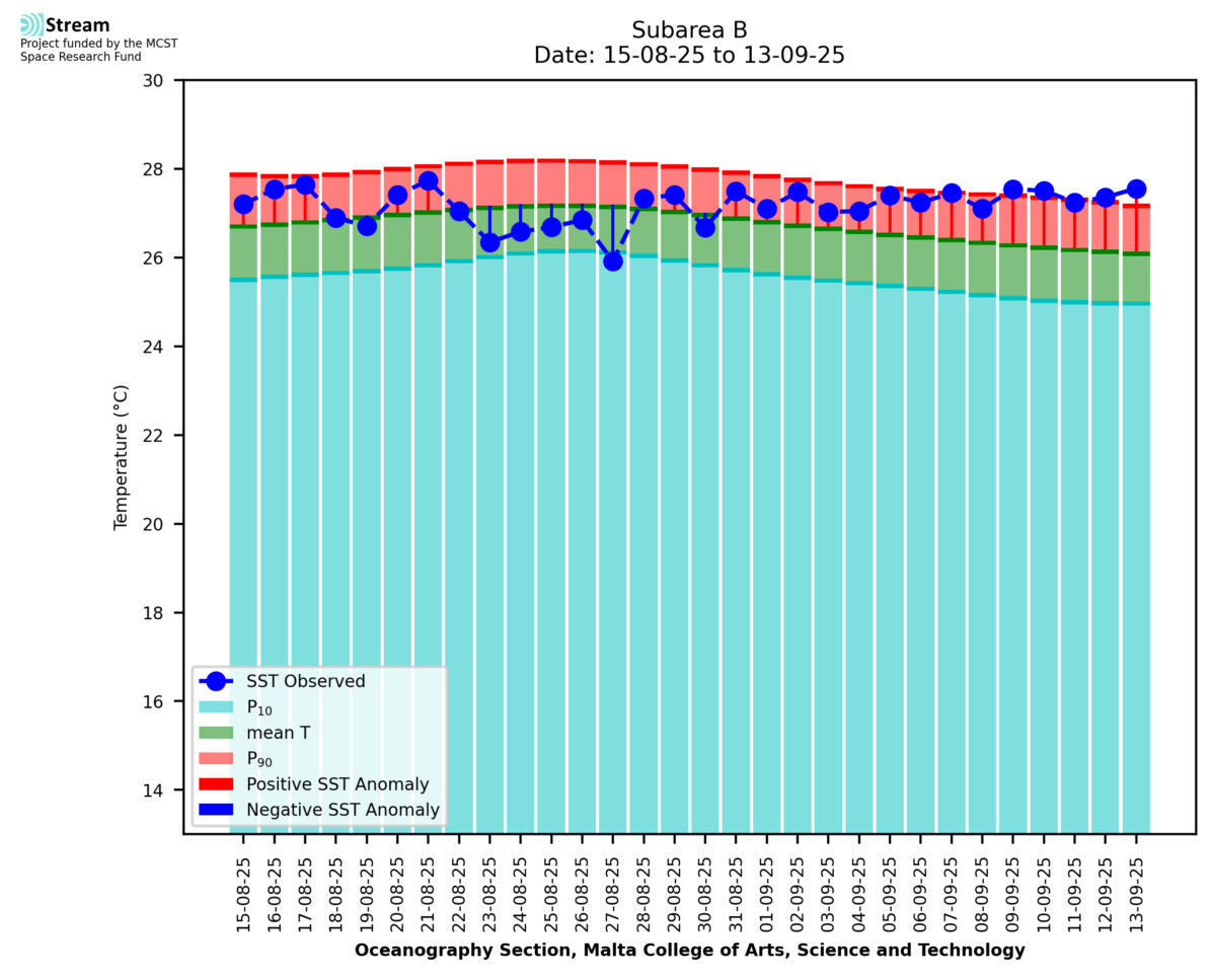 Elaborated by STREAM, the service provides daily analysis of sea surface temperature (SST) anomalies, including spatial maps for marine heat wave occurrence and intensity in the Malta shelf area. The service is based on ultra high resolution SST nighttime observations made by the infrared sensors mounted on different satellite platforms. Personalised user requests for detailed pixel-based data visualisation and access are available operationally on the STREAM web and mobile app.
