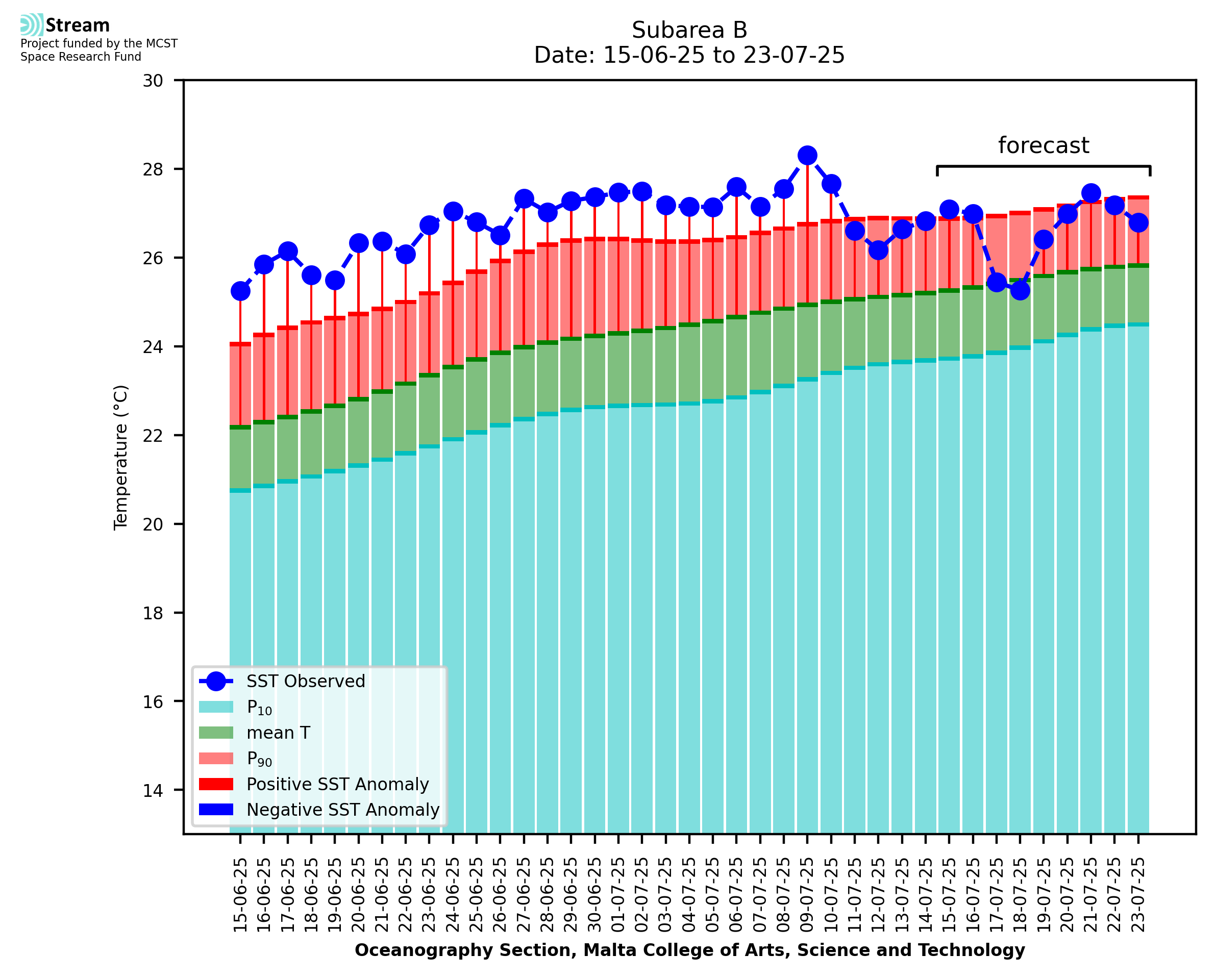 Elaborated by STREAM, the service provides daily analysis of sea surface temperature (SST) anomalies, including spatial maps for marine heat wave occurrence and intensity in the Malta shelf area. The service is based on ultra high resolution SST nighttime observations made by the infrared sensors mounted on different satellite platforms. Personalised user requests for detailed pixel-based data visualisation and access are available operationally on the STREAM web and mobile app.