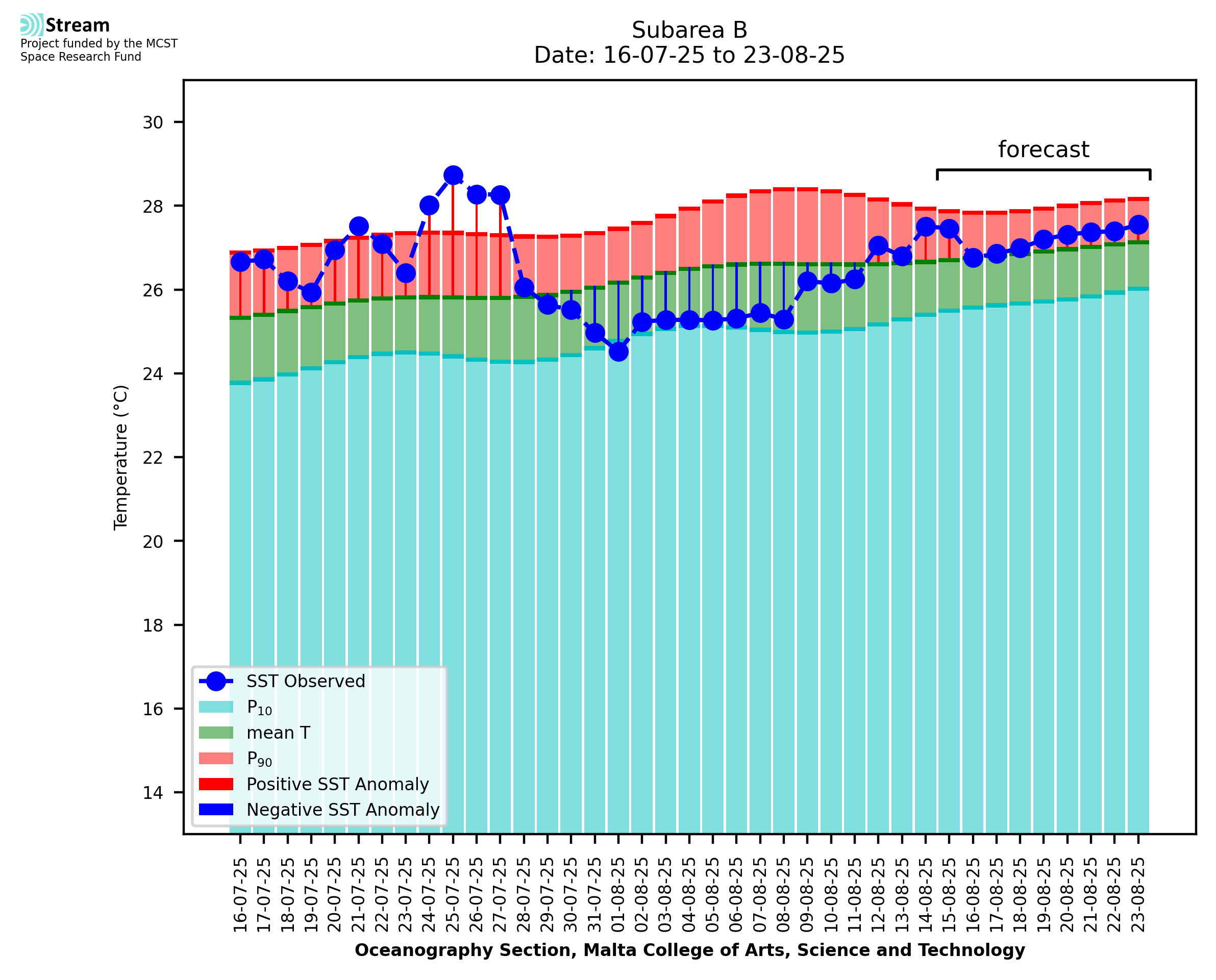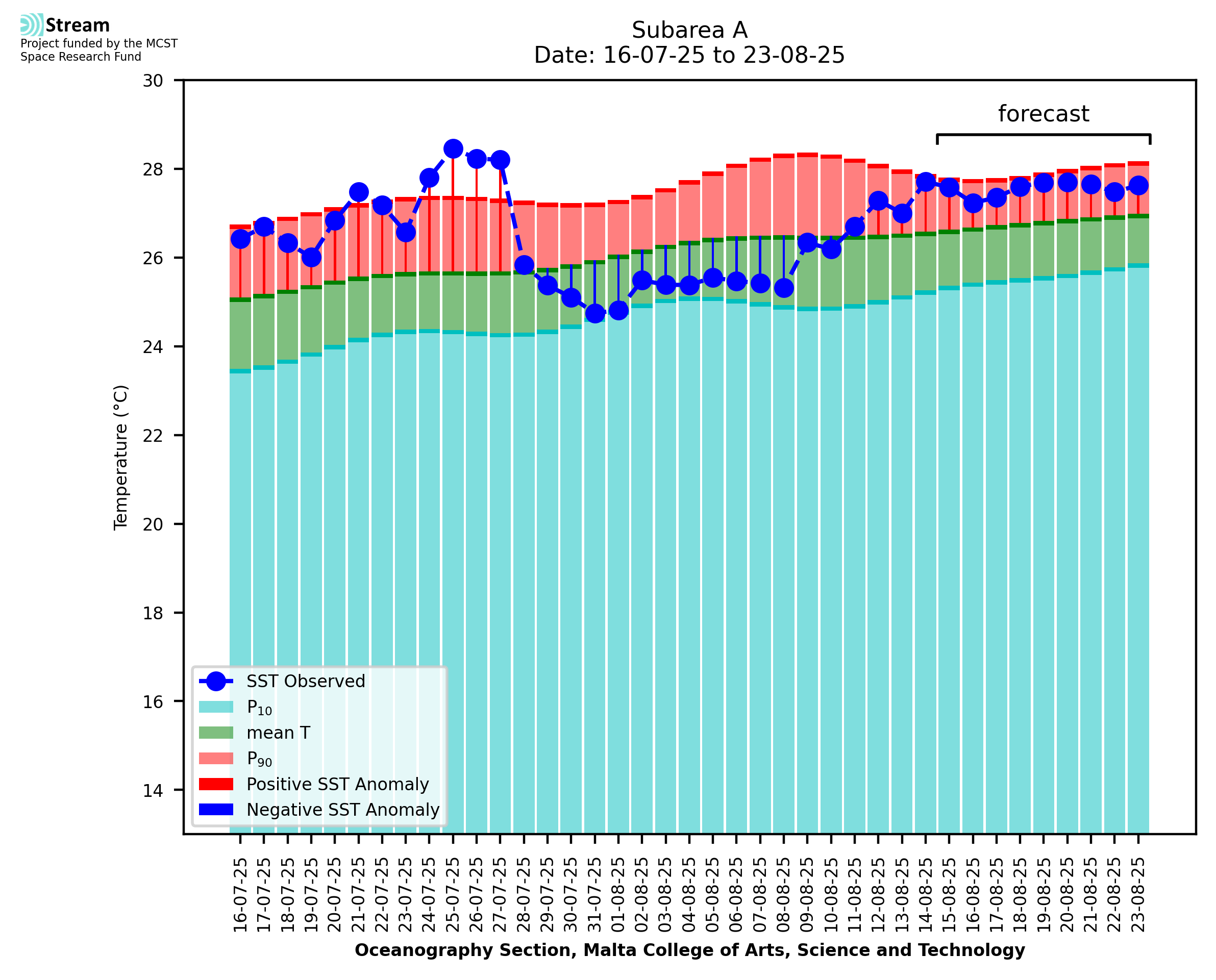 Elaborated by STREAM, the service provides daily analysis of sea surface temperature (SST) anomalies, including spatial maps for marine heat wave occurrence and intensity in the Malta shelf area. The service is based on ultra high resolution SST nighttime observations made by the infrared sensors mounted on different satellite platforms. Personalised user requests for detailed pixel-based data visualisation and access are available operationally on the STREAM web and mobile app.
