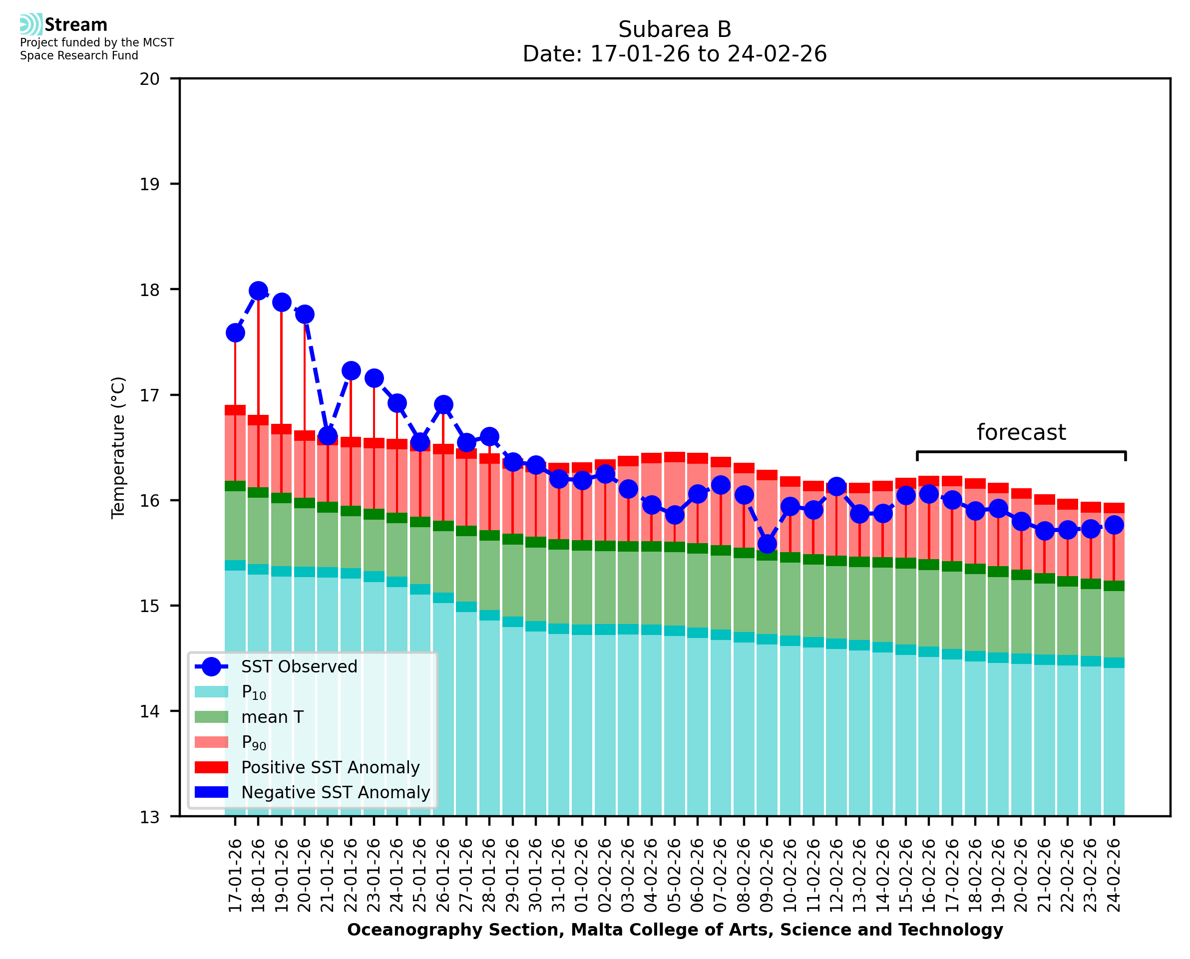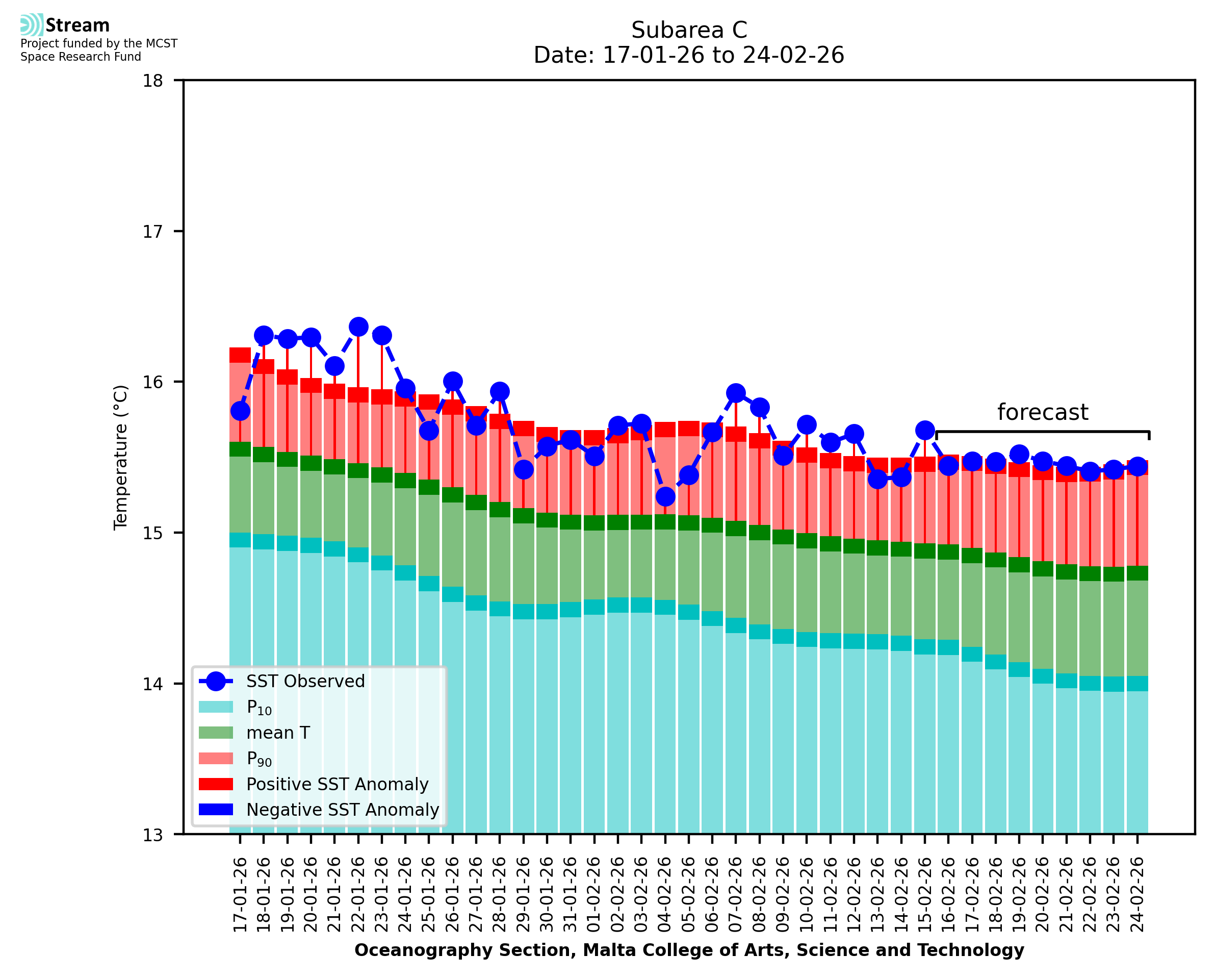 Elaborated by STREAM, the service provides daily analysis of sea surface temperature (SST) anomalies, including spatial maps for marine heat wave occurrence and intensity in the Malta shelf area. The service is based on ultra high resolution SST nighttime observations made by the infrared sensors mounted on different satellite platforms. Personalised user requests for detailed pixel-based data visualisation and access are available operationally on the STREAM web and mobile app.