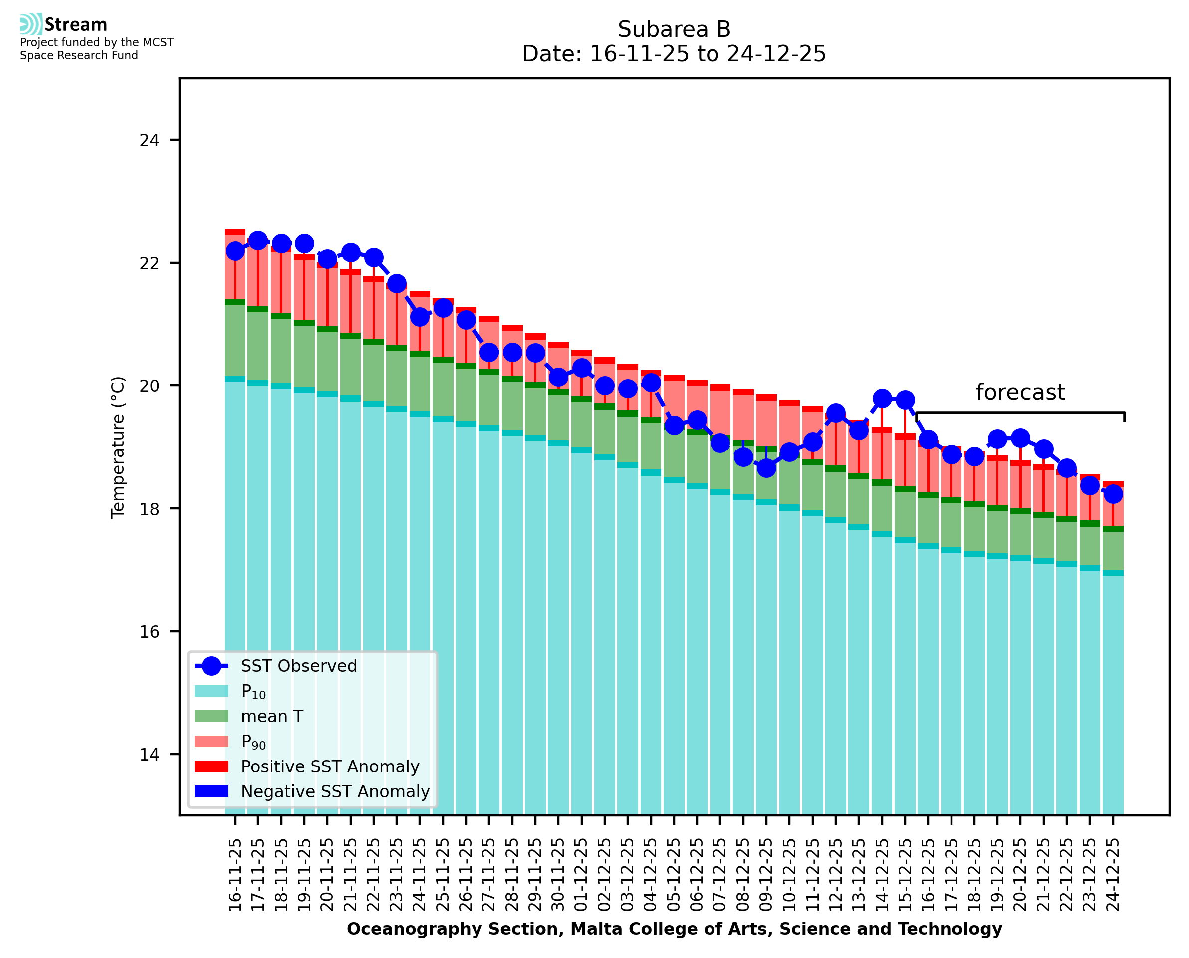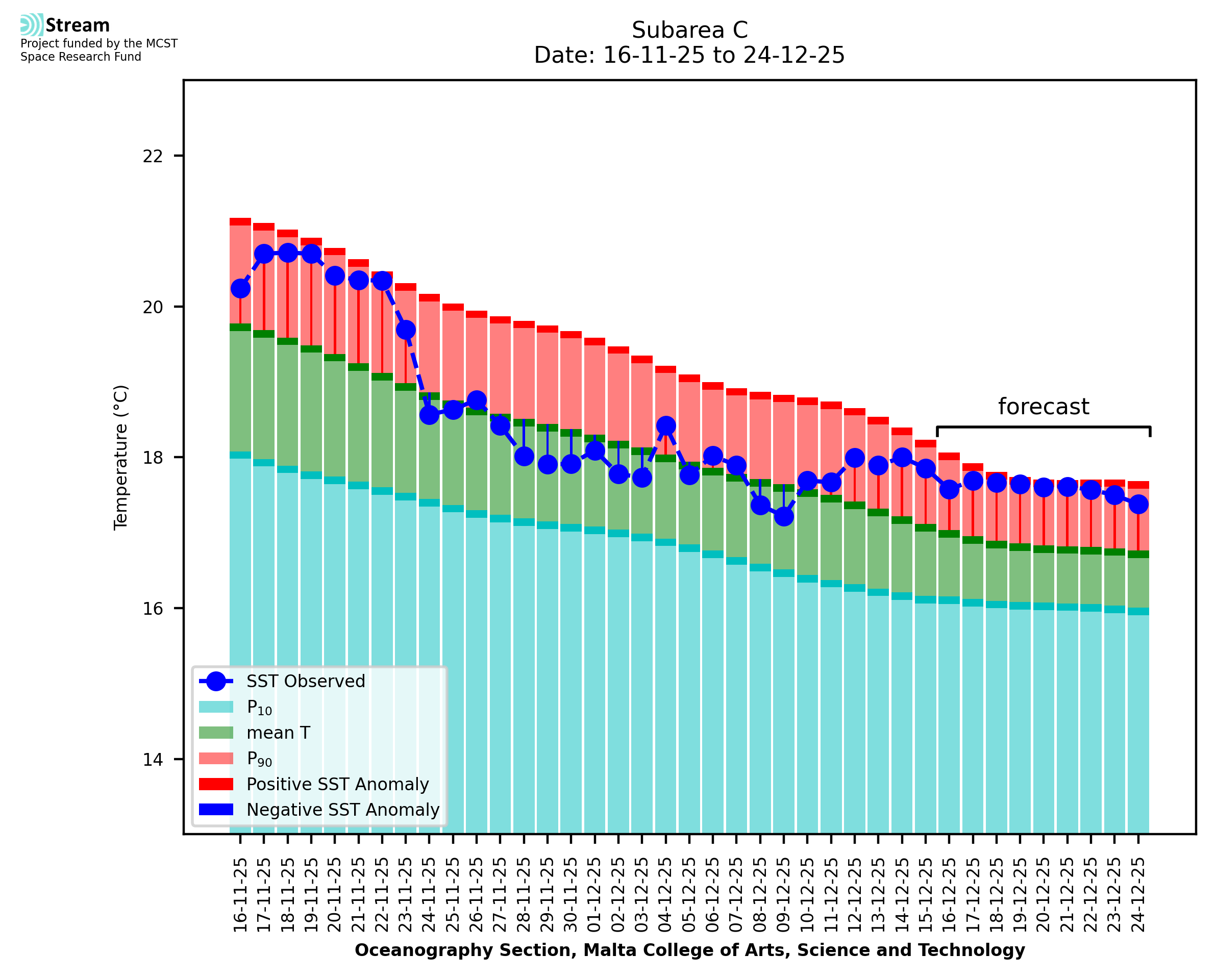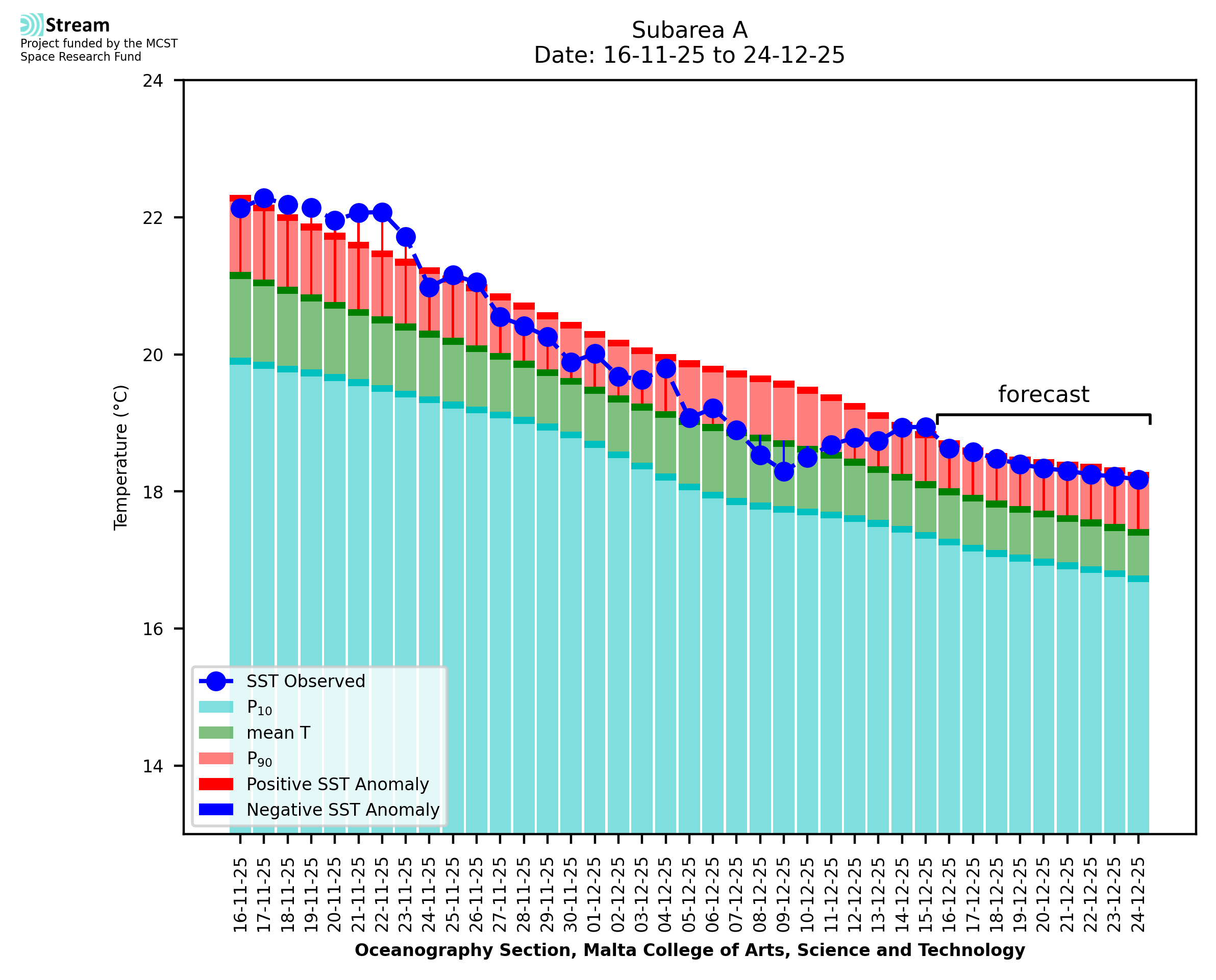 Elaborated by STREAM, the service provides daily analysis of sea surface temperature (SST) anomalies, including spatial maps for marine heat wave occurrence and intensity in the Malta shelf area. The service is based on ultra high resolution SST nighttime observations made by the infrared sensors mounted on different satellite platforms. Personalised user requests for detailed pixel-based data visualisation and access are available operationally on the STREAM web and mobile app.