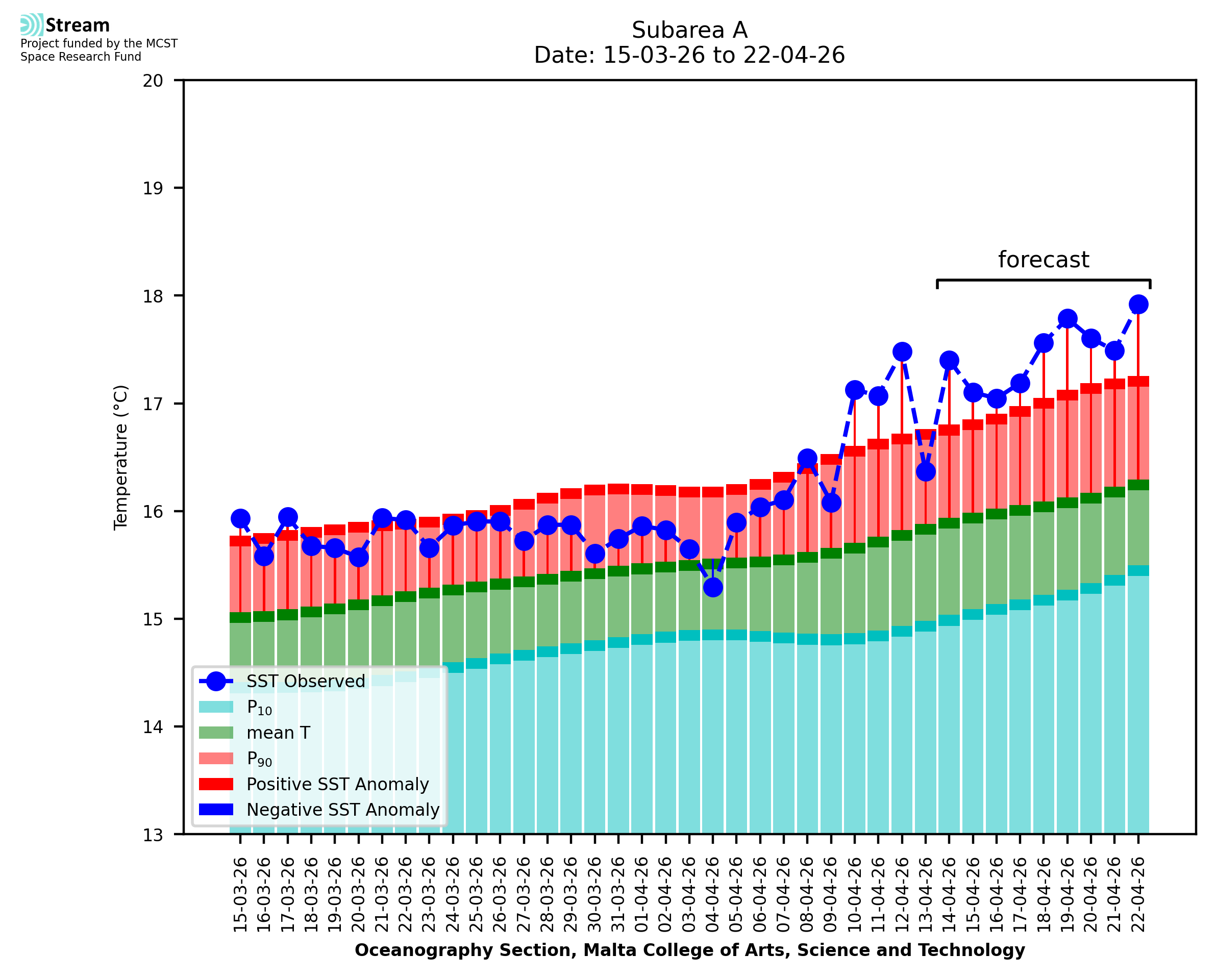 Elaborated by STREAM, the service provides daily analysis of sea surface temperature (SST) anomalies, including spatial maps for marine heat wave occurrence and intensity in the Malta shelf area. The service is based on ultra high resolution SST nighttime observations made by the infrared sensors mounted on different satellite platforms. Personalised user requests for detailed pixel-based data visualisation and access are available operationally on the STREAM web and mobile app.