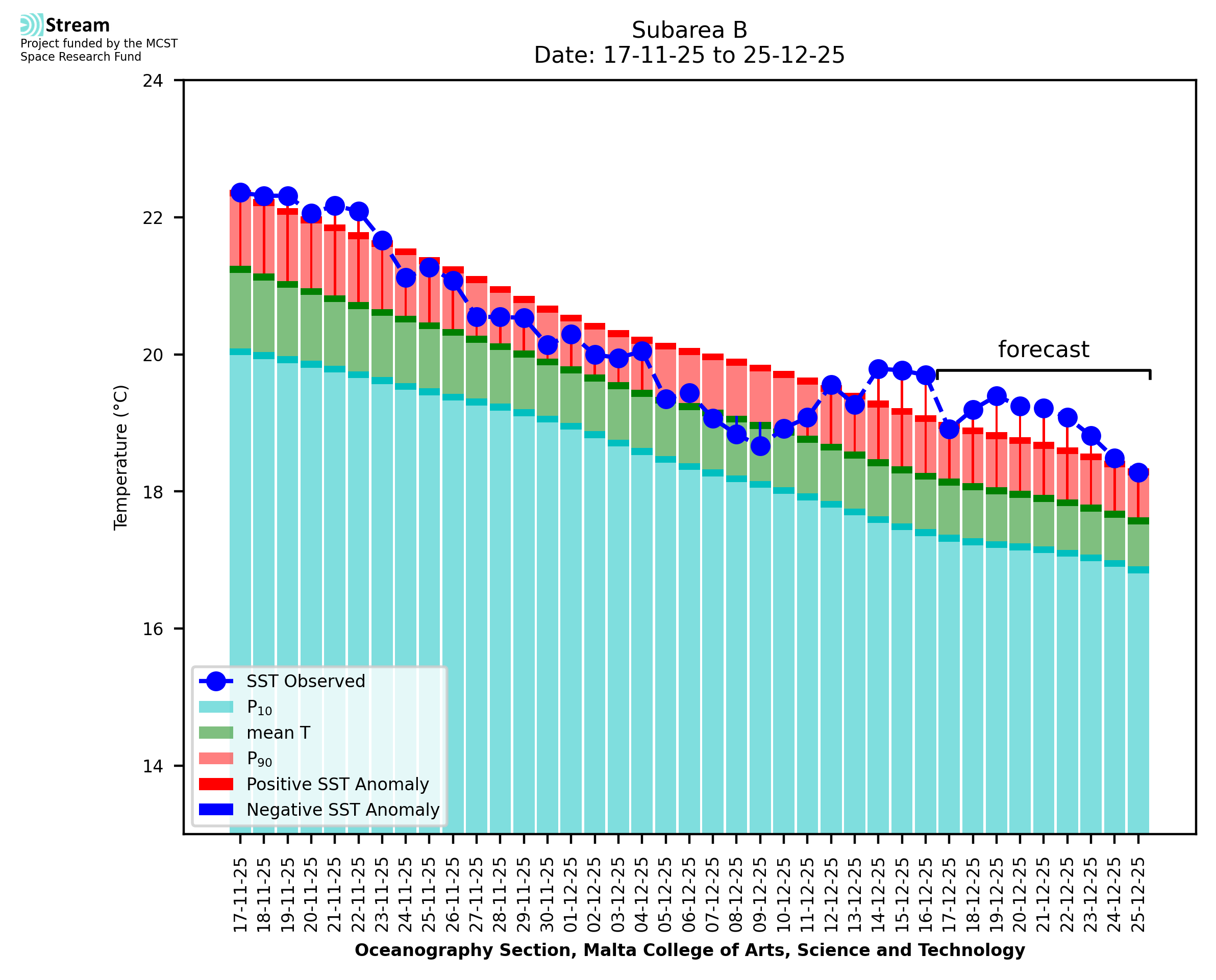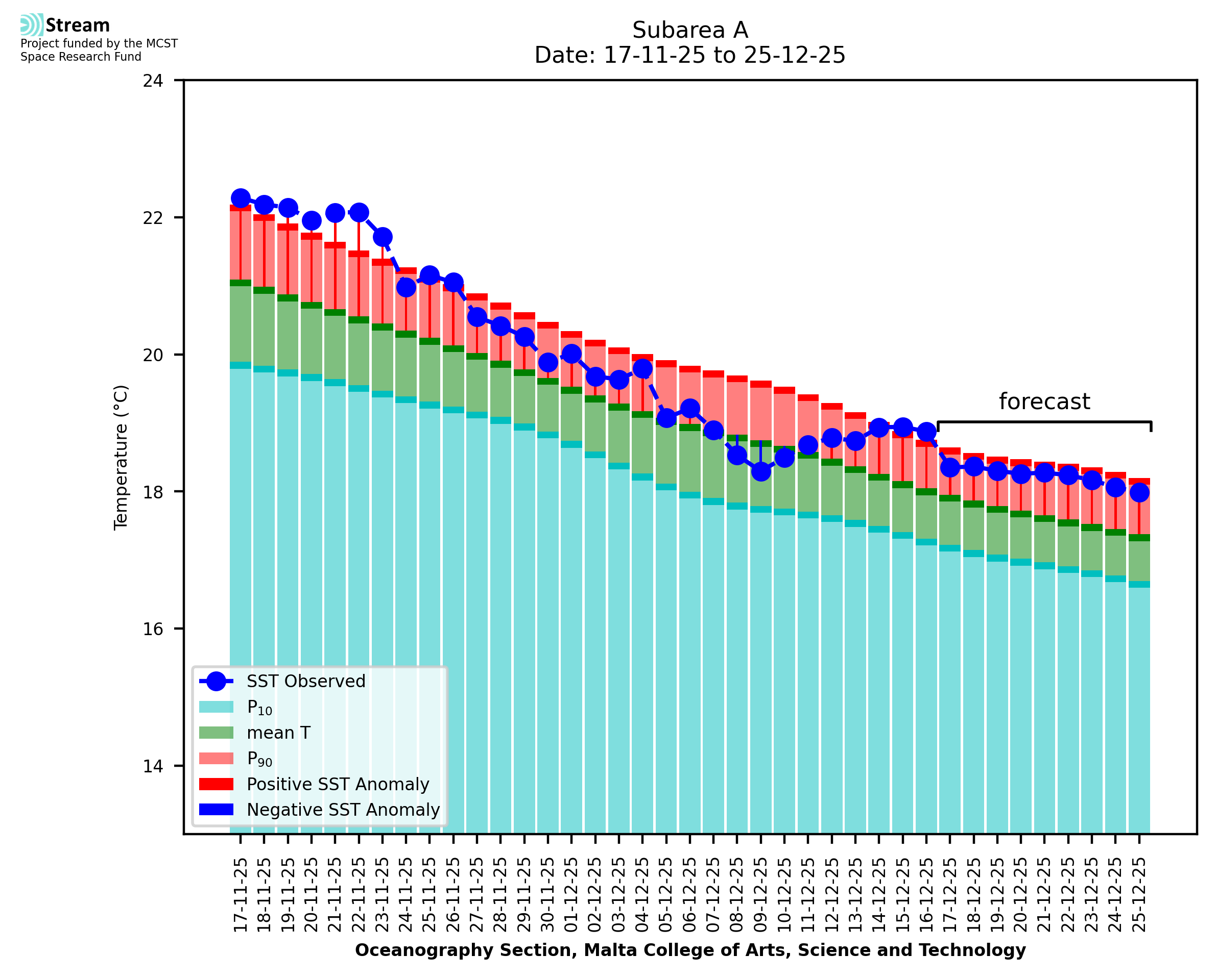 Elaborated by STREAM, the service provides daily analysis of sea surface temperature (SST) anomalies, including spatial maps for marine heat wave occurrence and intensity in the Malta shelf area. The service is based on ultra high resolution SST nighttime observations made by the infrared sensors mounted on different satellite platforms. Personalised user requests for detailed pixel-based data visualisation and access are available operationally on the STREAM web and mobile app.