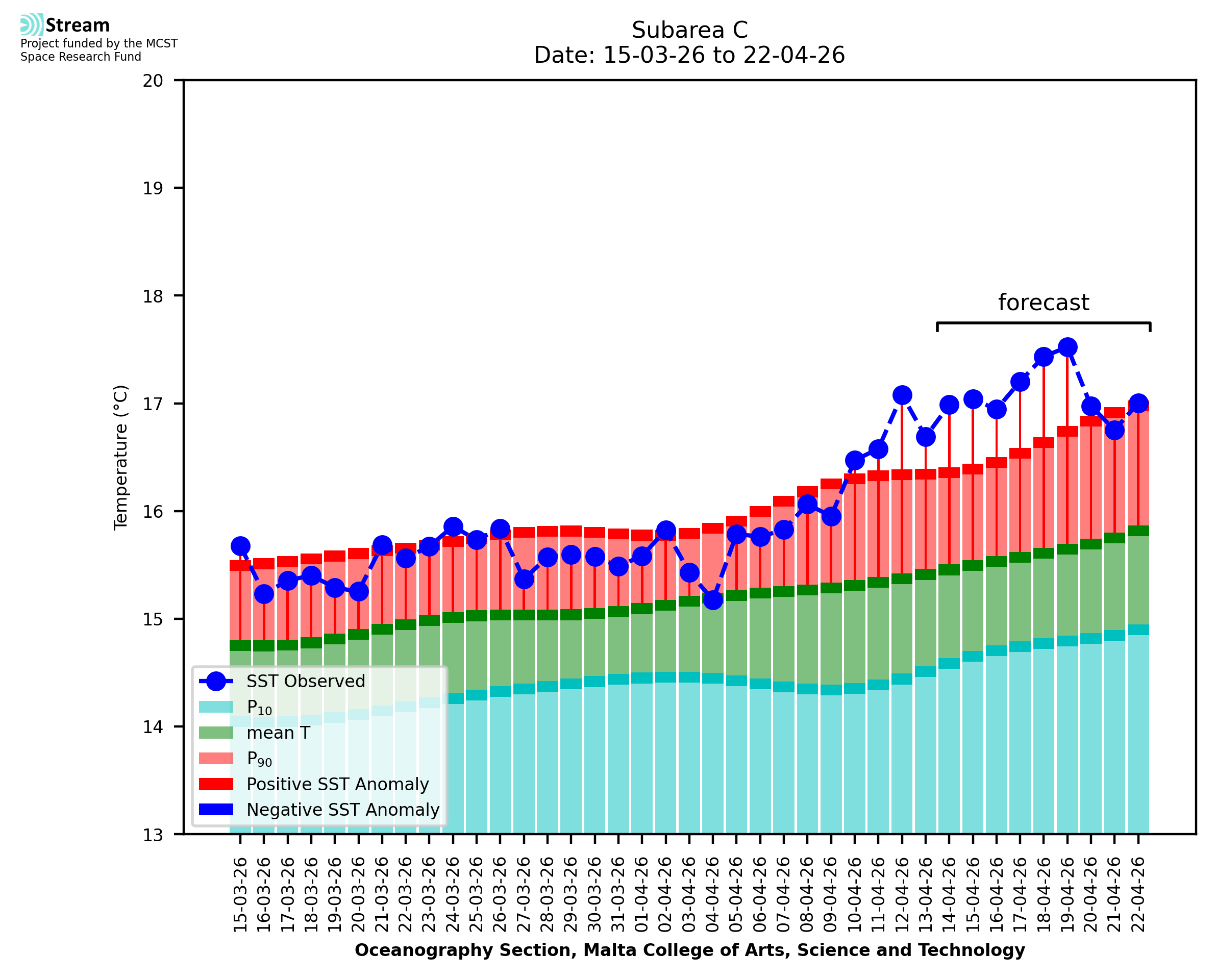 Elaborated by STREAM, the service provides daily analysis of sea surface temperature (SST) anomalies, including spatial maps for marine heat wave occurrence and intensity in the Malta shelf area. The service is based on ultra high resolution SST nighttime observations made by the infrared sensors mounted on different satellite platforms. Personalised user requests for detailed pixel-based data visualisation and access are available operationally on the STREAM web and mobile app.