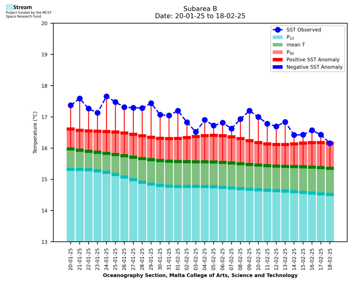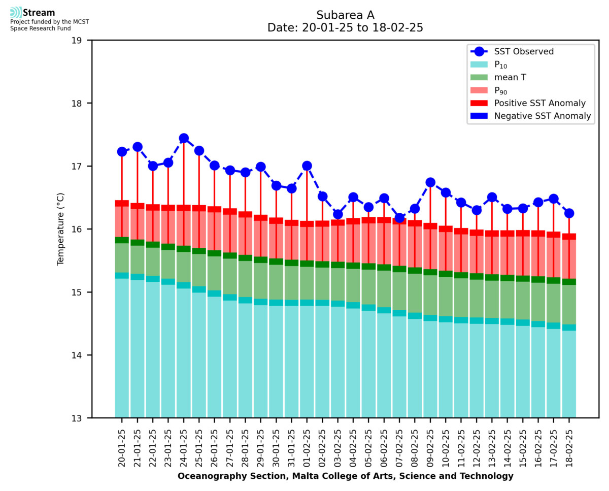Elaborated by STREAM, the service provides daily analysis of sea surface temperature (SST) anomalies, including spatial maps for marine heat wave occurrence and intensity in the Malta shelf area. The service is based on ultra high resolution SST nighttime observations made by the infrared sensors mounted on different satellite platforms. Personalised user requests for detailed pixel-based data visualisation and access are available operationally on the STREAM web and mobile app.