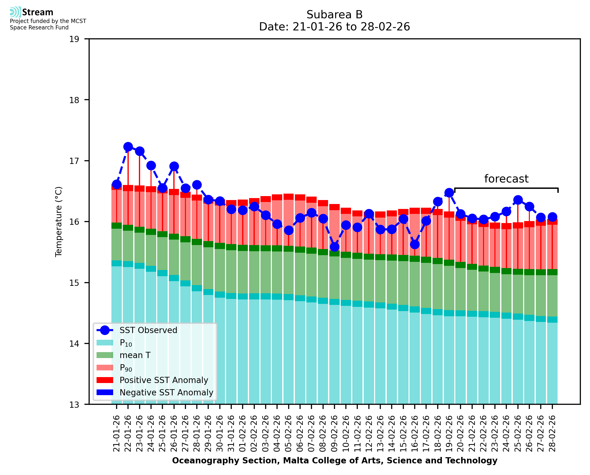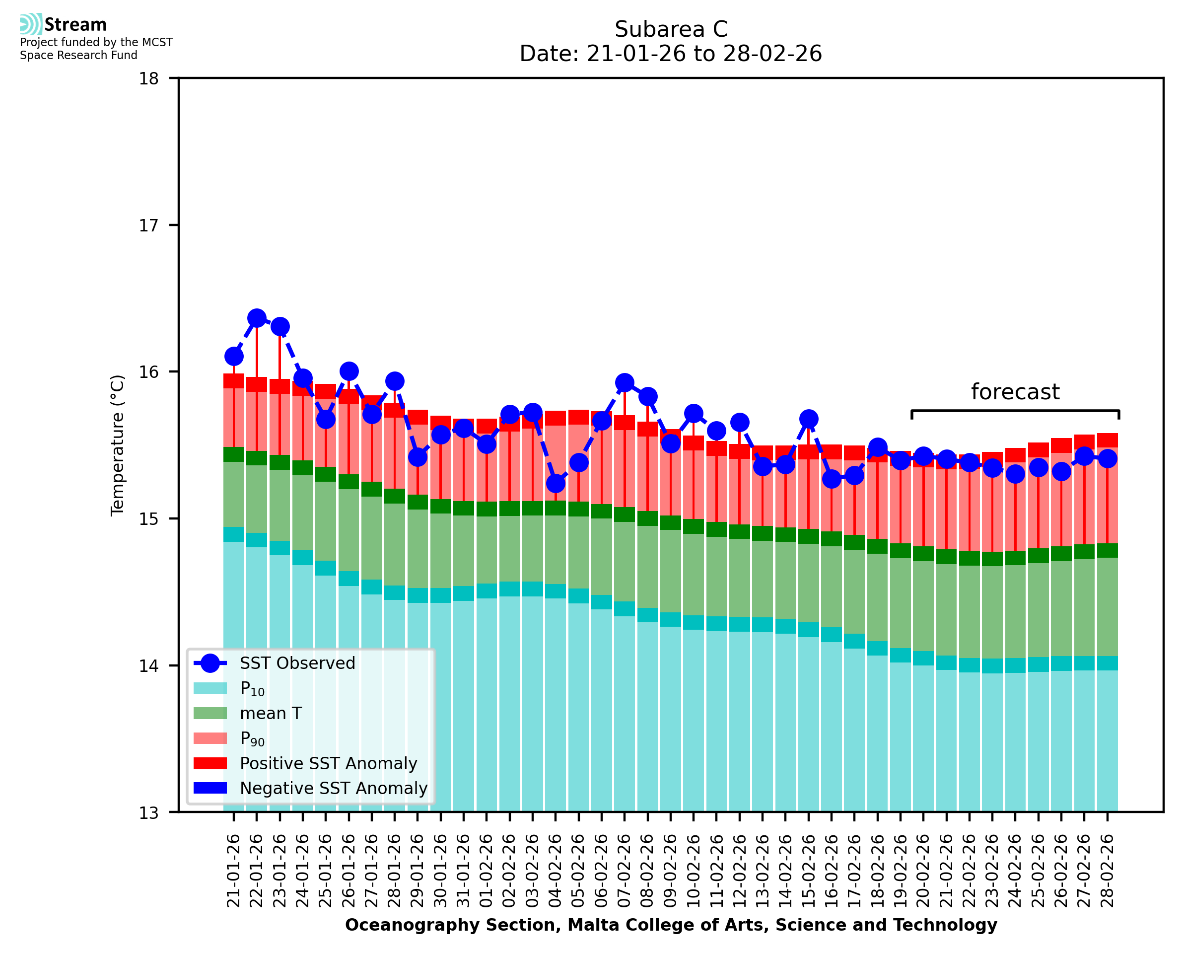 Elaborated by STREAM, the service provides daily analysis of sea surface temperature (SST) anomalies, including spatial maps for marine heat wave occurrence and intensity in the Malta shelf area. The service is based on ultra high resolution SST nighttime observations made by the infrared sensors mounted on different satellite platforms. Personalised user requests for detailed pixel-based data visualisation and access are available operationally on the STREAM web and mobile app.