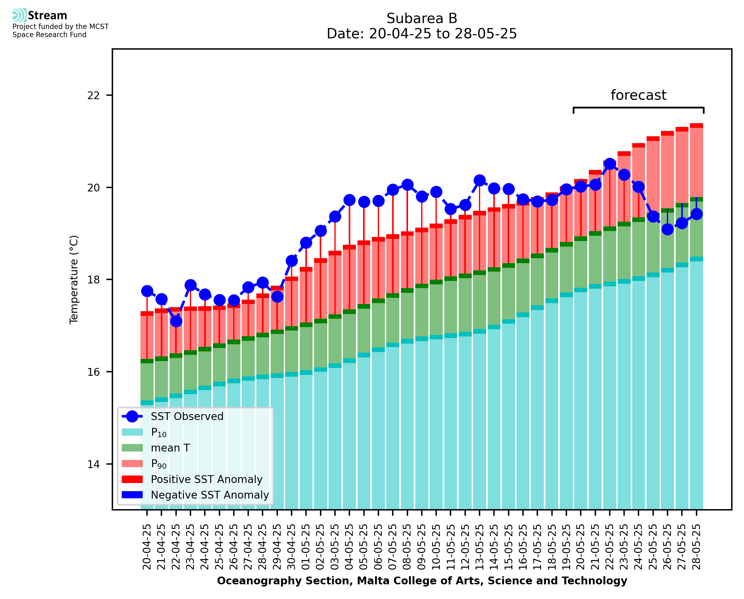 Elaborated by STREAM, the service provides daily analysis of sea surface temperature (SST) anomalies, including spatial maps for marine heat wave occurrence and intensity in the Malta shelf area. The service is based on ultra high resolution SST nighttime observations made by the infrared sensors mounted on different satellite platforms. Personalised user requests for detailed pixel-based data visualisation and access are available operationally on the STREAM web and mobile app.