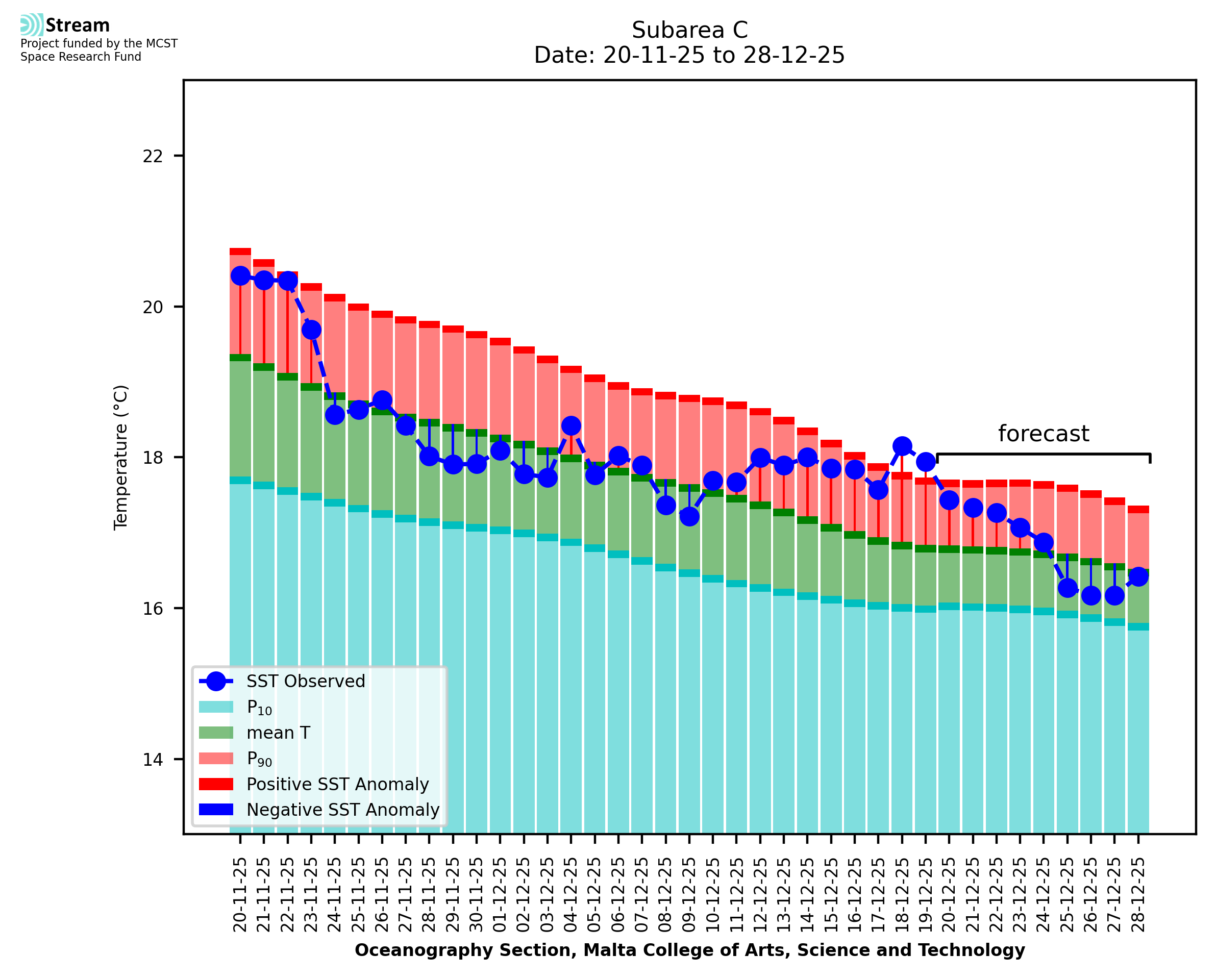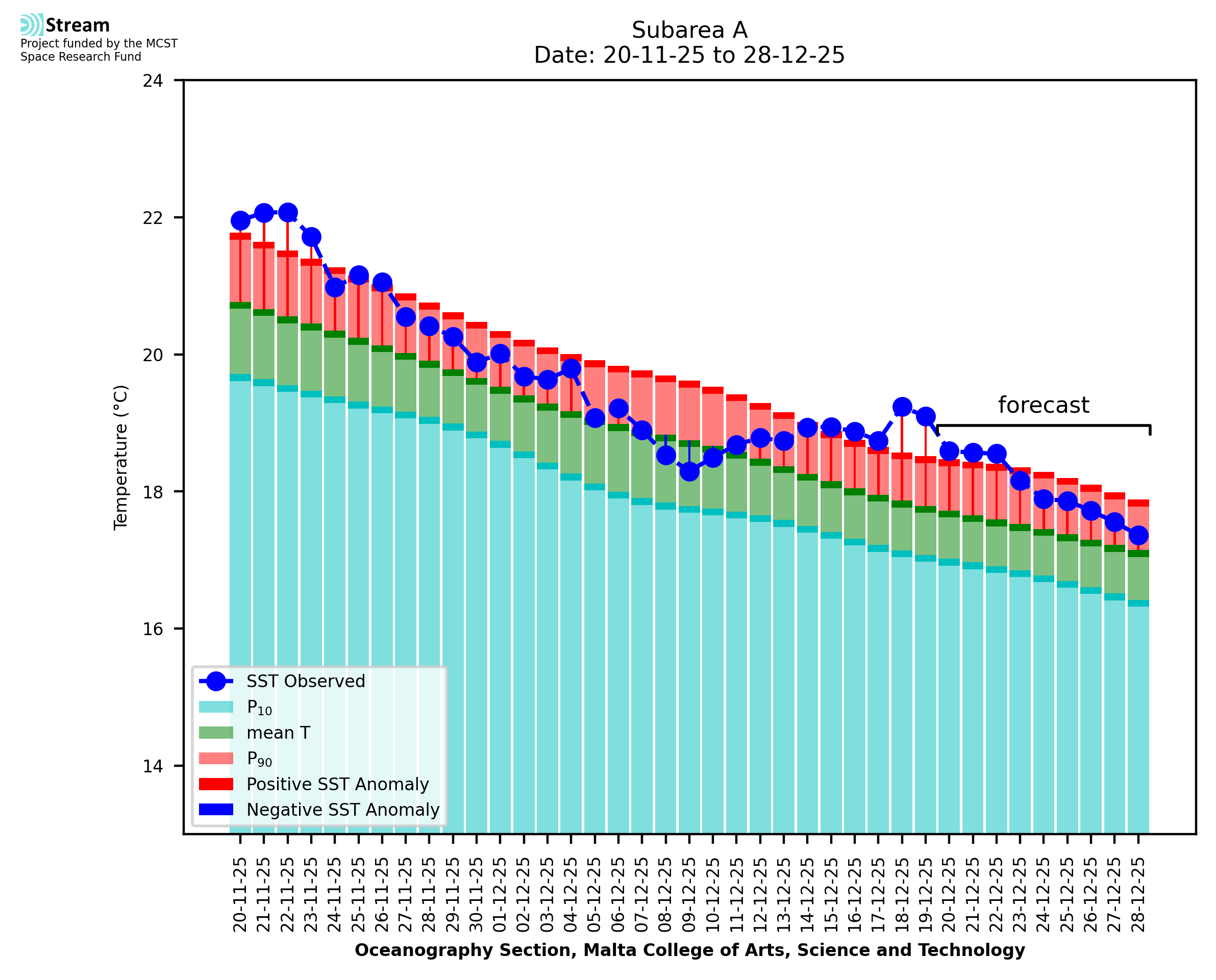 Elaborated by STREAM, the service provides daily analysis of sea surface temperature (SST) anomalies, including spatial maps for marine heat wave occurrence and intensity in the Malta shelf area. The service is based on ultra high resolution SST nighttime observations made by the infrared sensors mounted on different satellite platforms. Personalised user requests for detailed pixel-based data visualisation and access are available operationally on the STREAM web and mobile app.