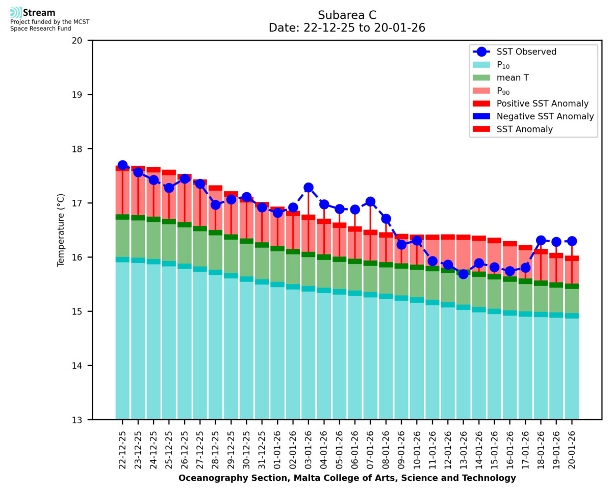 Elaborated by STREAM, the service provides daily analysis of sea surface temperature (SST) anomalies, including spatial maps for marine heat wave occurrence and intensity in the Malta shelf area. The service is based on ultra high resolution SST nighttime observations made by the infrared sensors mounted on different satellite platforms. Personalised user requests for detailed pixel-based data visualisation and access are available operationally on the STREAM web and mobile app.