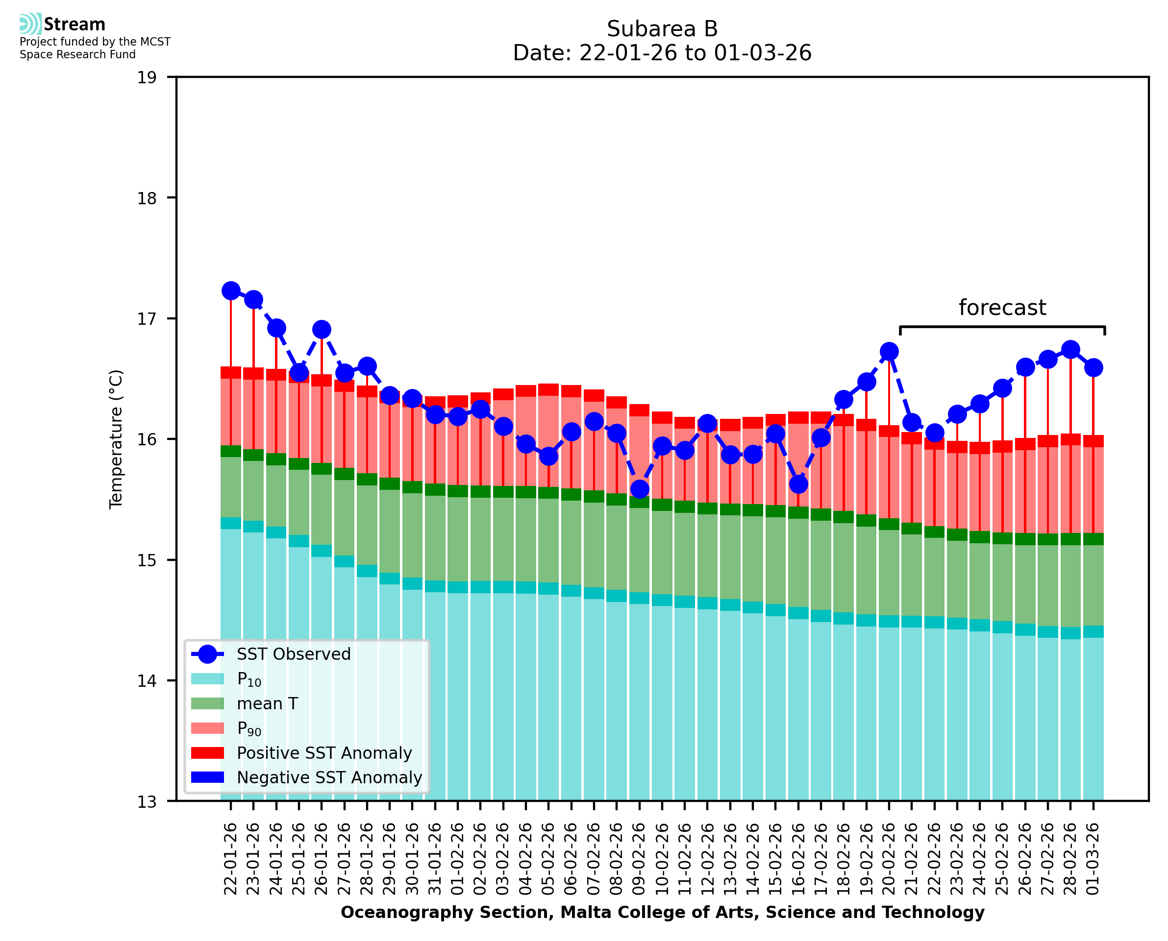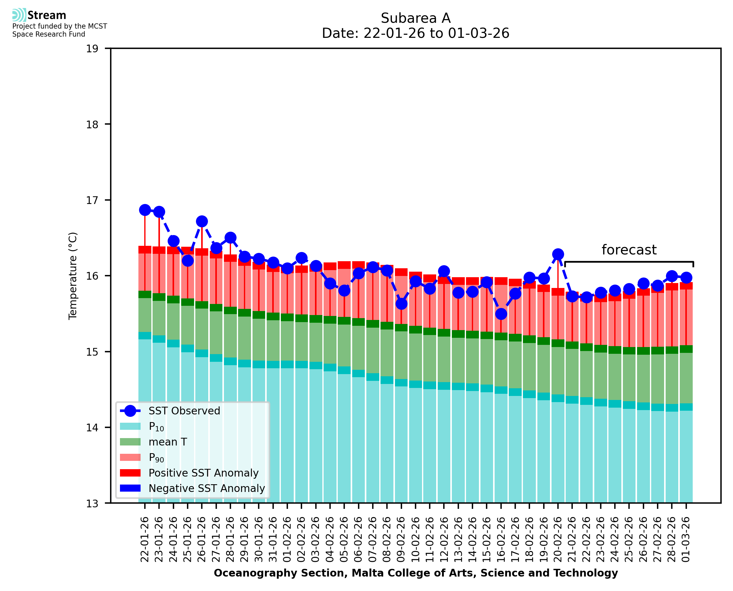 Elaborated by STREAM, the service provides daily analysis of sea surface temperature (SST) anomalies, including spatial maps for marine heat wave occurrence and intensity in the Malta shelf area. The service is based on ultra high resolution SST nighttime observations made by the infrared sensors mounted on different satellite platforms. Personalised user requests for detailed pixel-based data visualisation and access are available operationally on the STREAM web and mobile app.