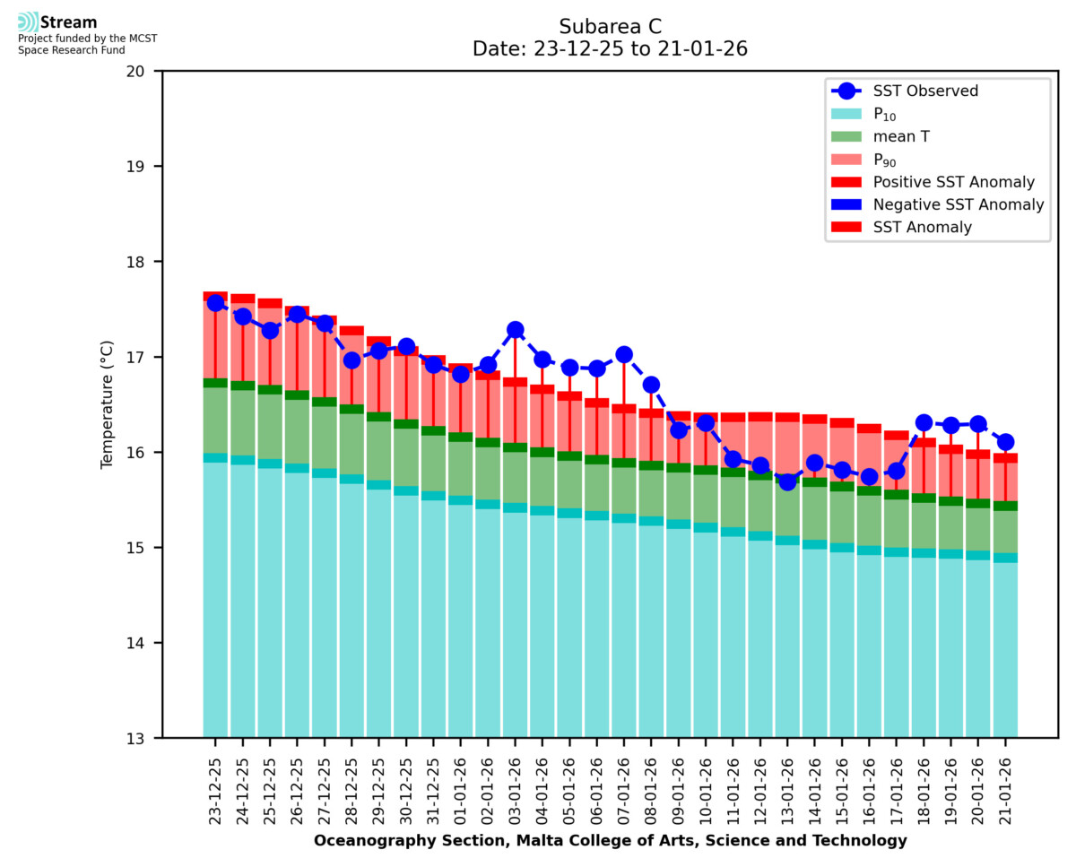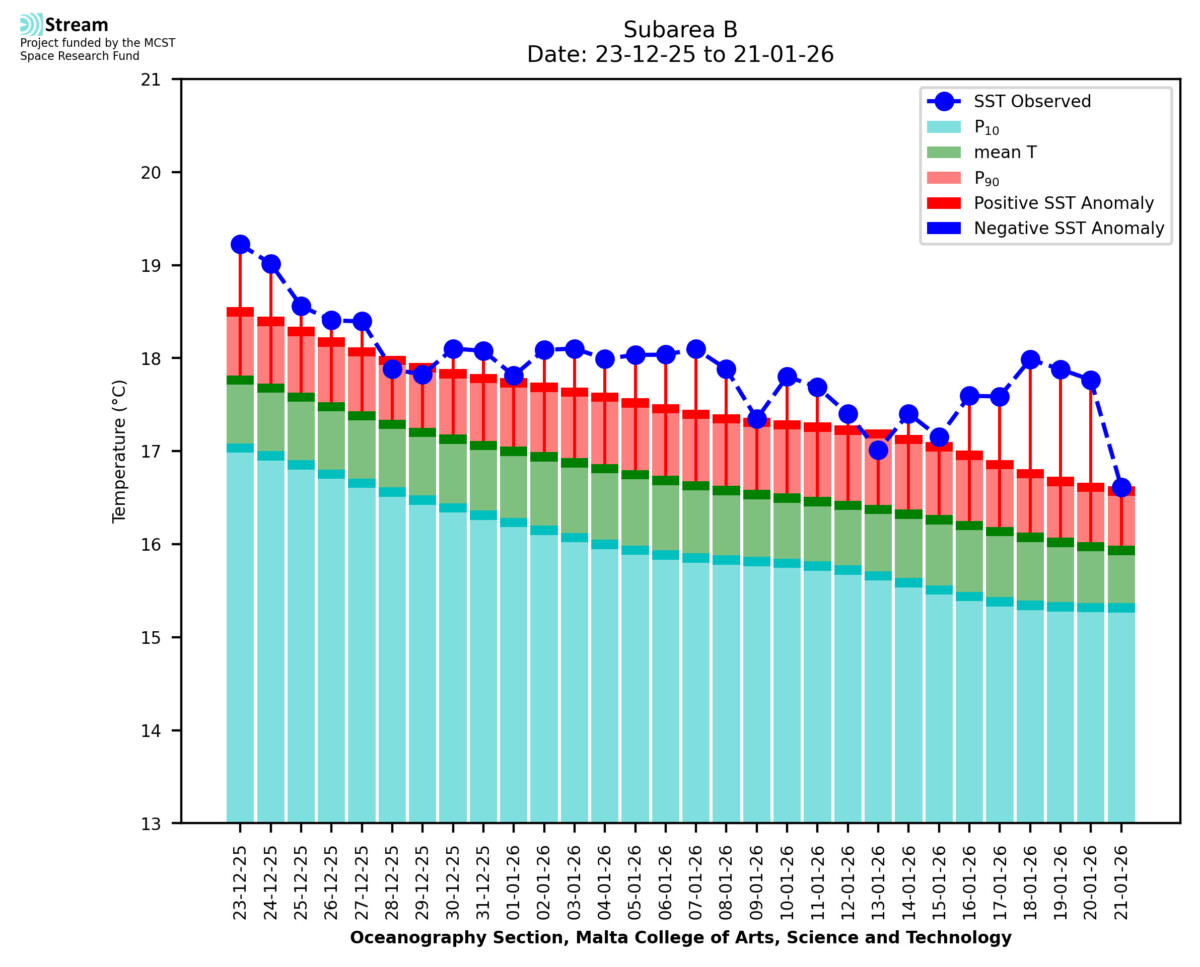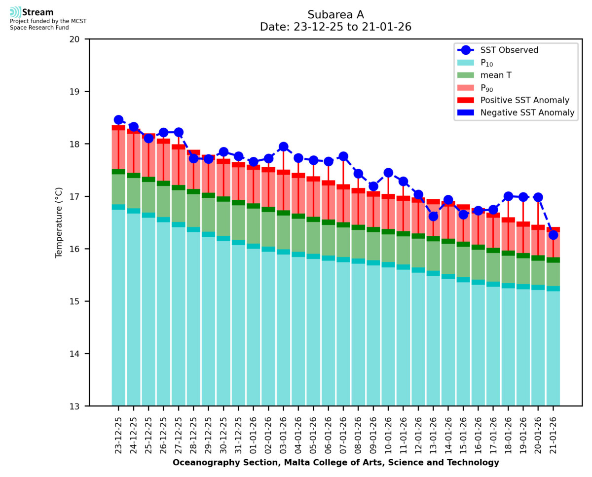 Elaborated by STREAM, the service provides daily analysis of sea surface temperature (SST) anomalies, including spatial maps for marine heat wave occurrence and intensity in the Malta shelf area. The service is based on ultra high resolution SST nighttime observations made by the infrared sensors mounted on different satellite platforms. Personalised user requests for detailed pixel-based data visualisation and access are available operationally on the STREAM web and mobile app.