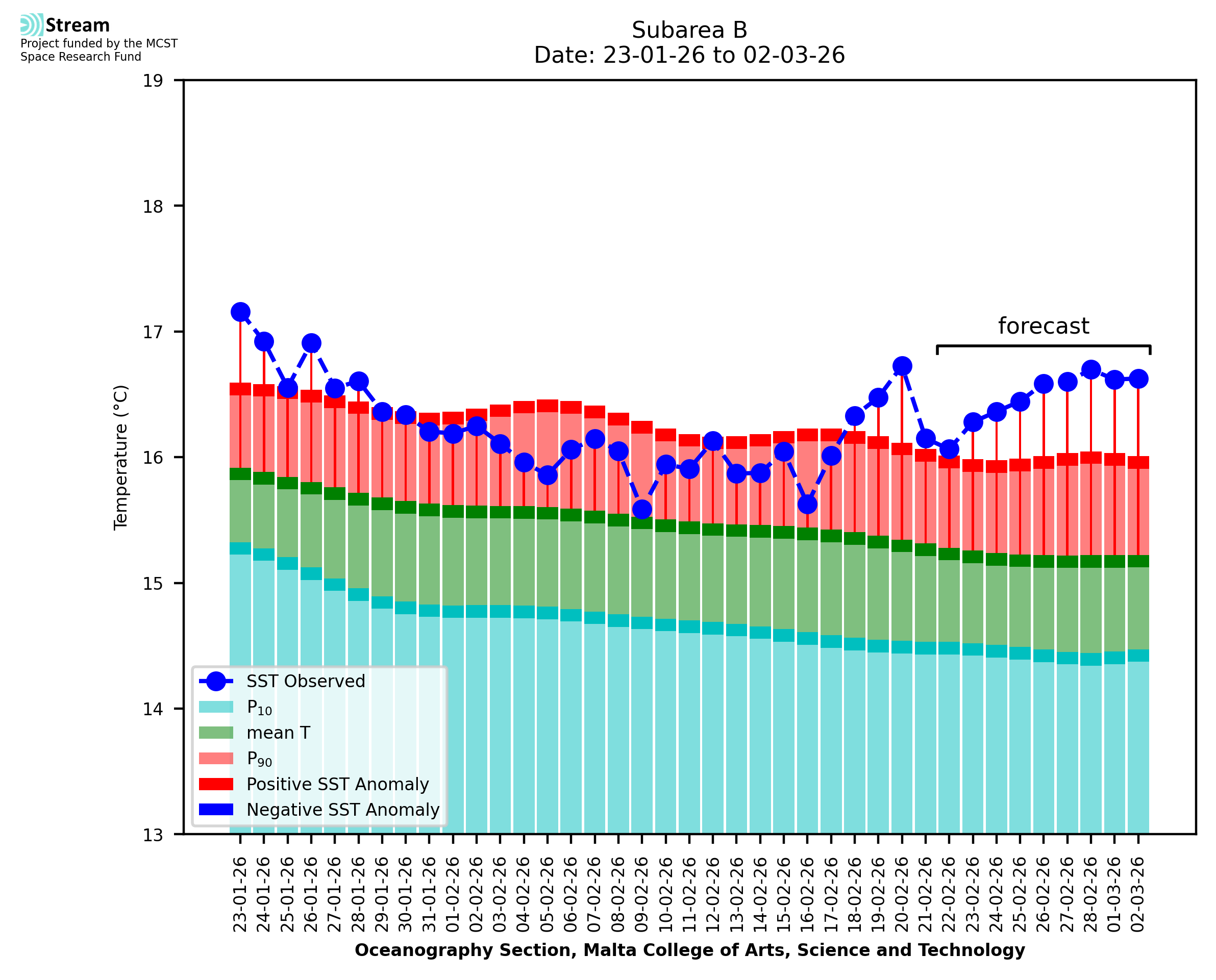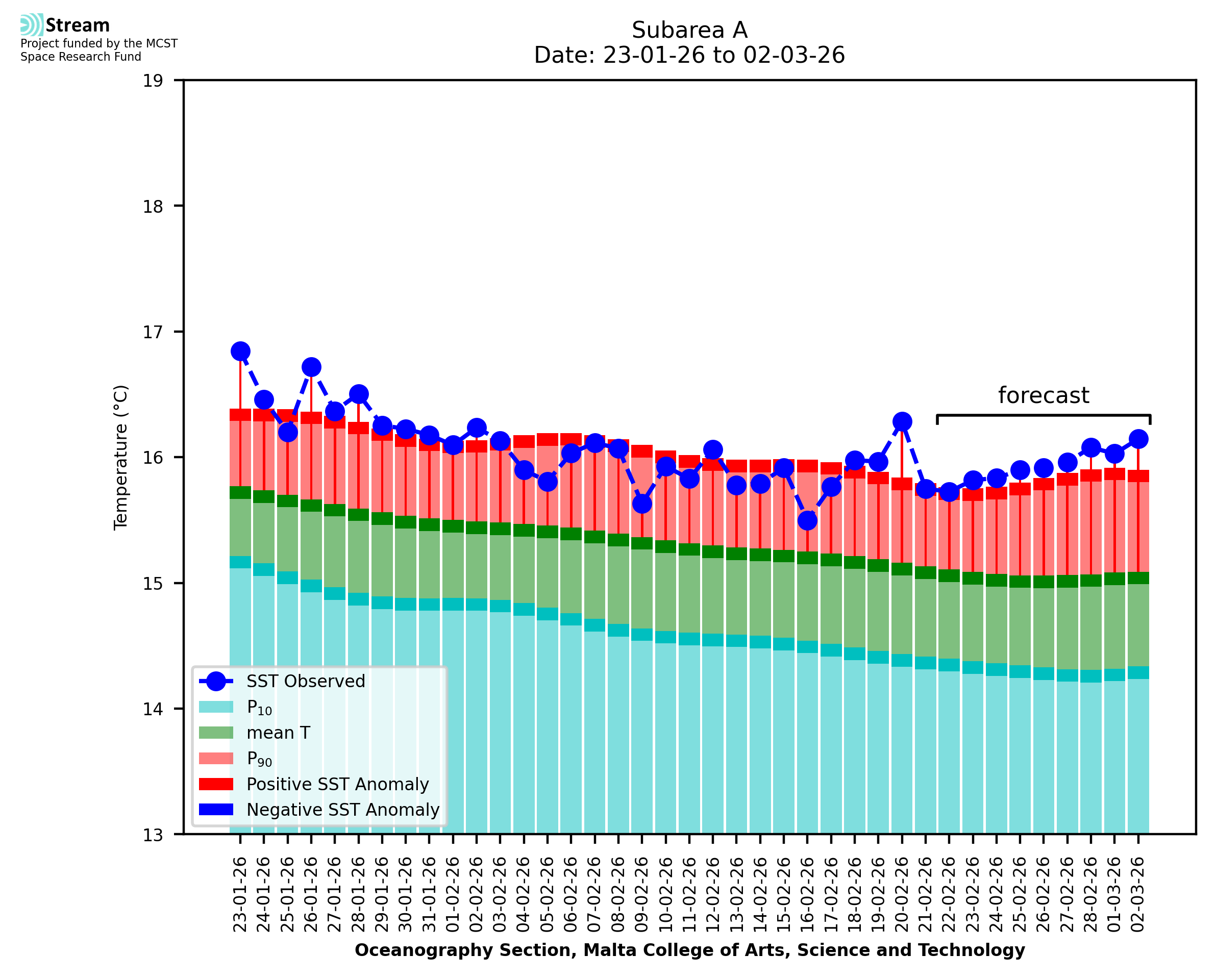 Elaborated by STREAM, the service provides daily analysis of sea surface temperature (SST) anomalies, including spatial maps for marine heat wave occurrence and intensity in the Malta shelf area. The service is based on ultra high resolution SST nighttime observations made by the infrared sensors mounted on different satellite platforms. Personalised user requests for detailed pixel-based data visualisation and access are available operationally on the STREAM web and mobile app.