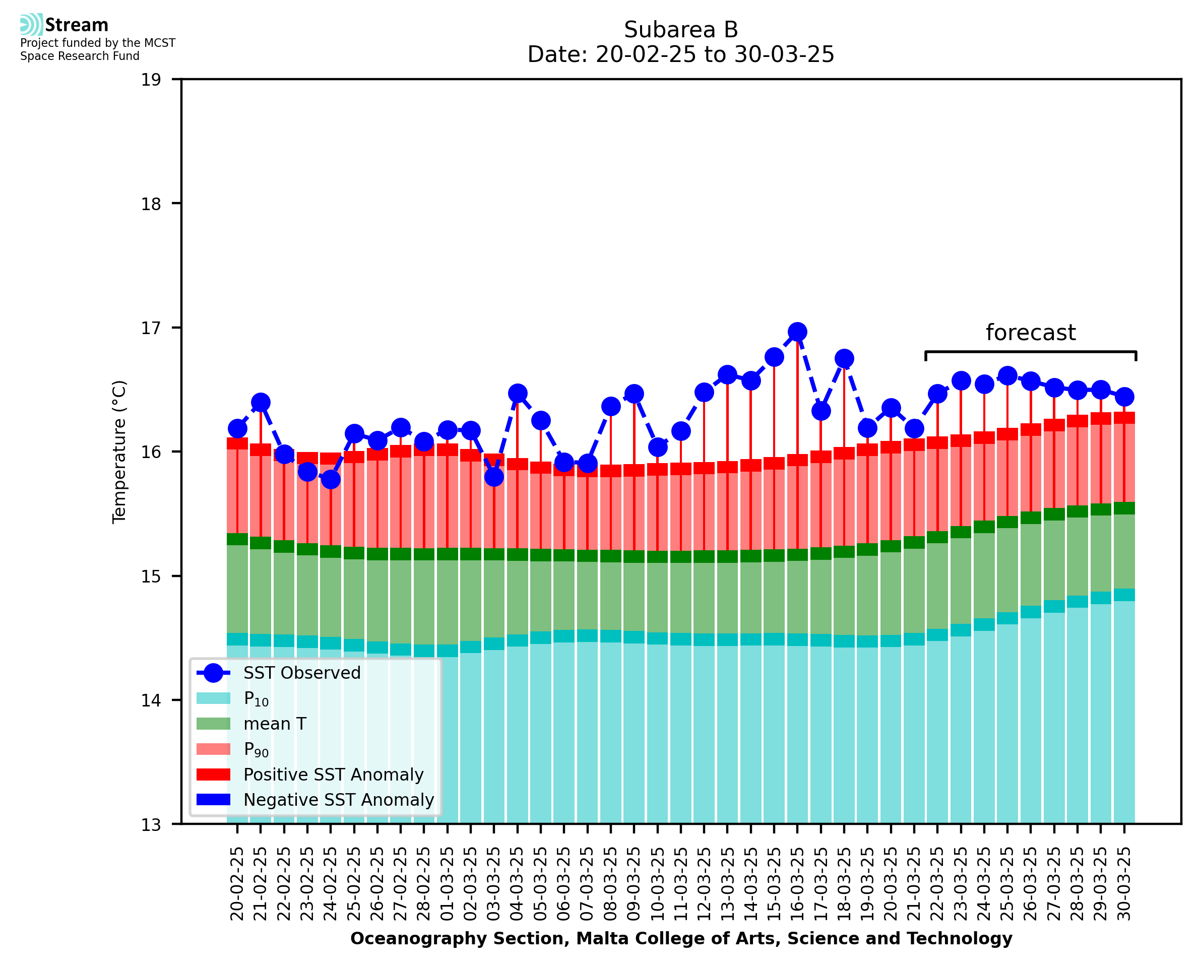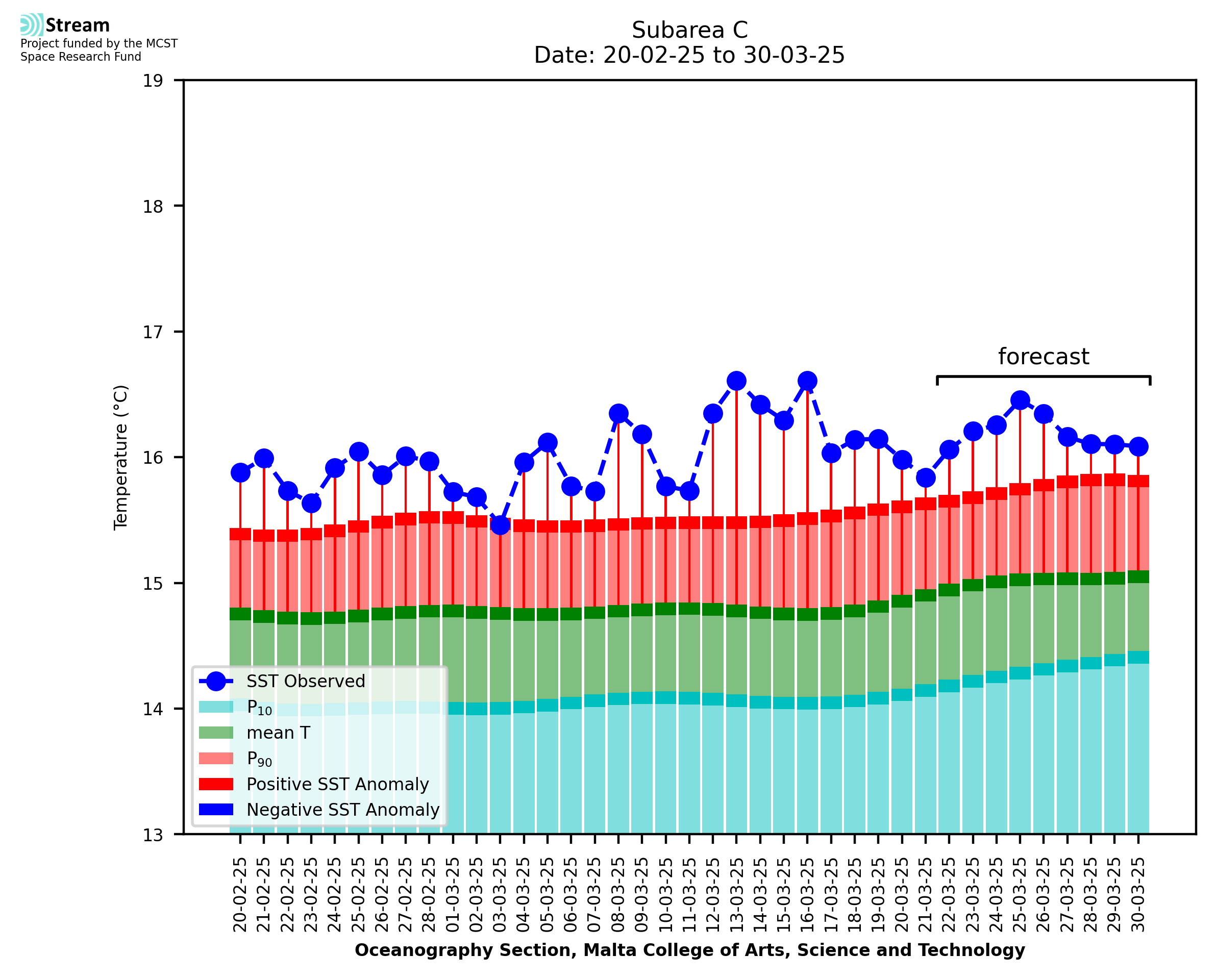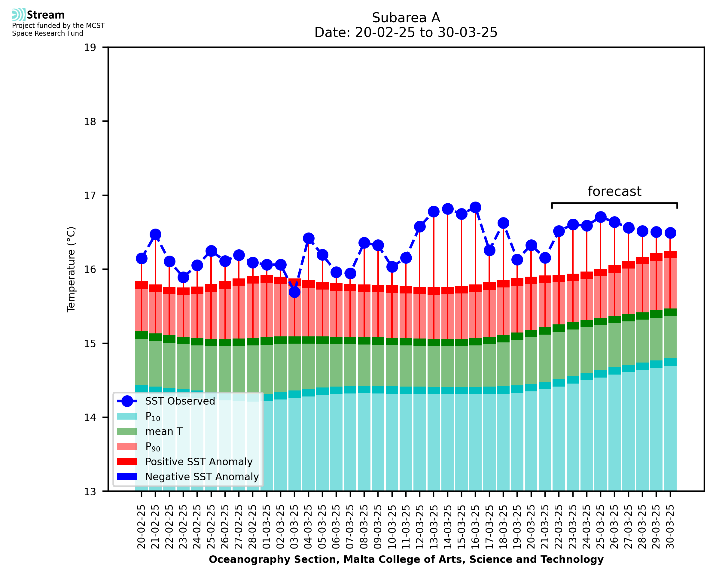 Elaborated by STREAM, the service provides daily analysis of sea surface temperature (SST) anomalies, including spatial maps for marine heat wave occurrence and intensity in the Malta shelf area. The service is based on ultra high resolution SST nighttime observations made by the infrared sensors mounted on different satellite platforms. Personalised user requests for detailed pixel-based data visualisation and access are available operationally on the STREAM web and mobile app.
