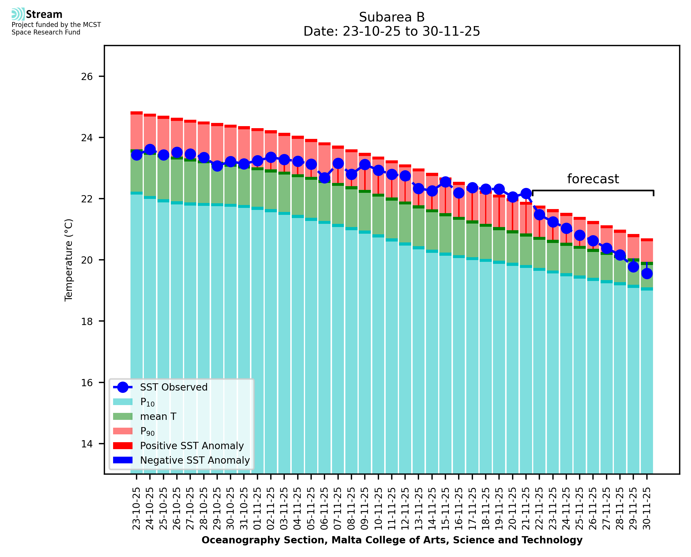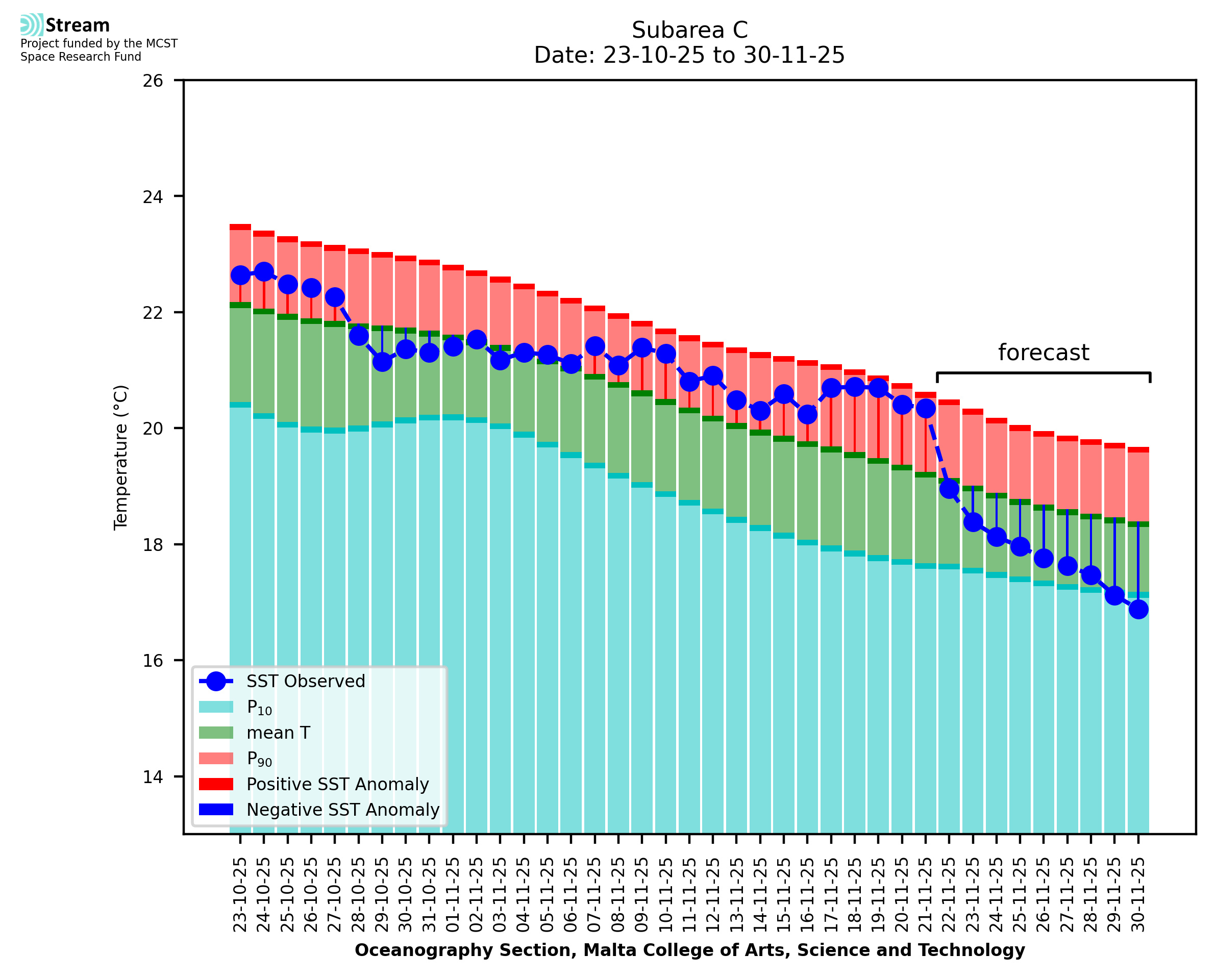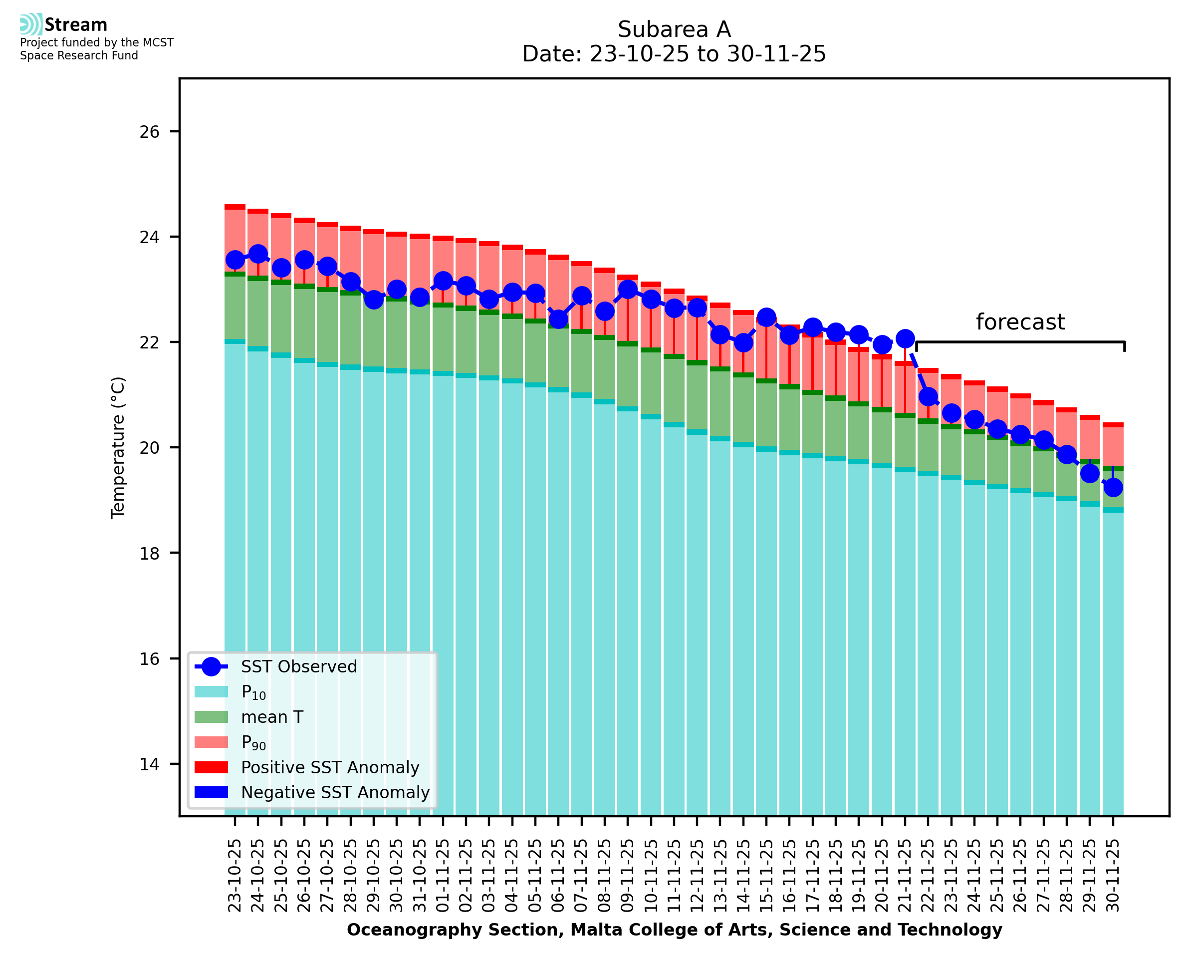 Elaborated by STREAM, the service provides daily analysis of sea surface temperature (SST) anomalies, including spatial maps for marine heat wave occurrence and intensity in the Malta shelf area. The service is based on ultra high resolution SST nighttime observations made by the infrared sensors mounted on different satellite platforms. Personalised user requests for detailed pixel-based data visualisation and access are available operationally on the STREAM web and mobile app.