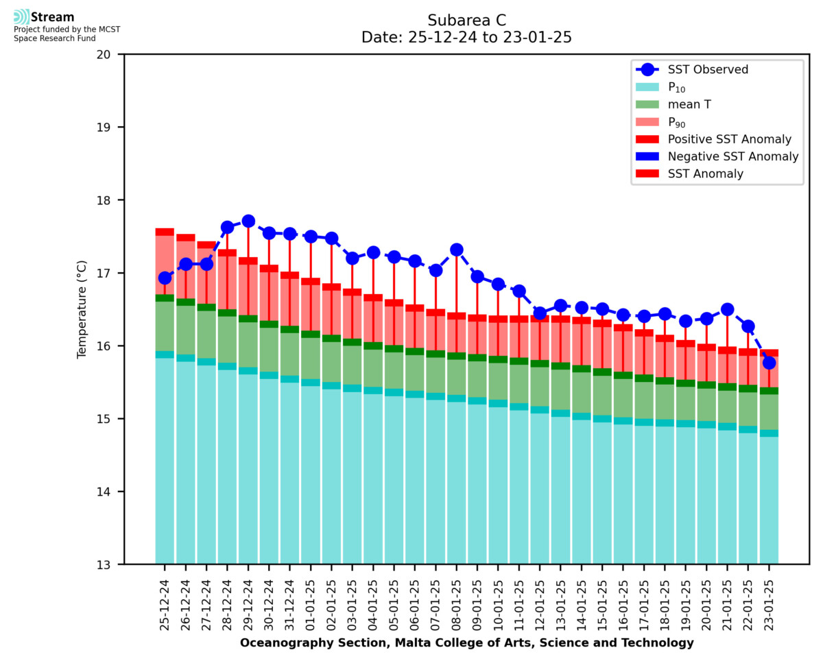 Elaborated by STREAM, the service provides daily analysis of sea surface temperature (SST) anomalies, including spatial maps for marine heat wave occurrence and intensity in the Malta shelf area. The service is based on ultra high resolution SST nighttime observations made by the infrared sensors mounted on different satellite platforms. Personalised user requests for detailed pixel-based data visualisation and access are available operationally on the STREAM web and mobile app.