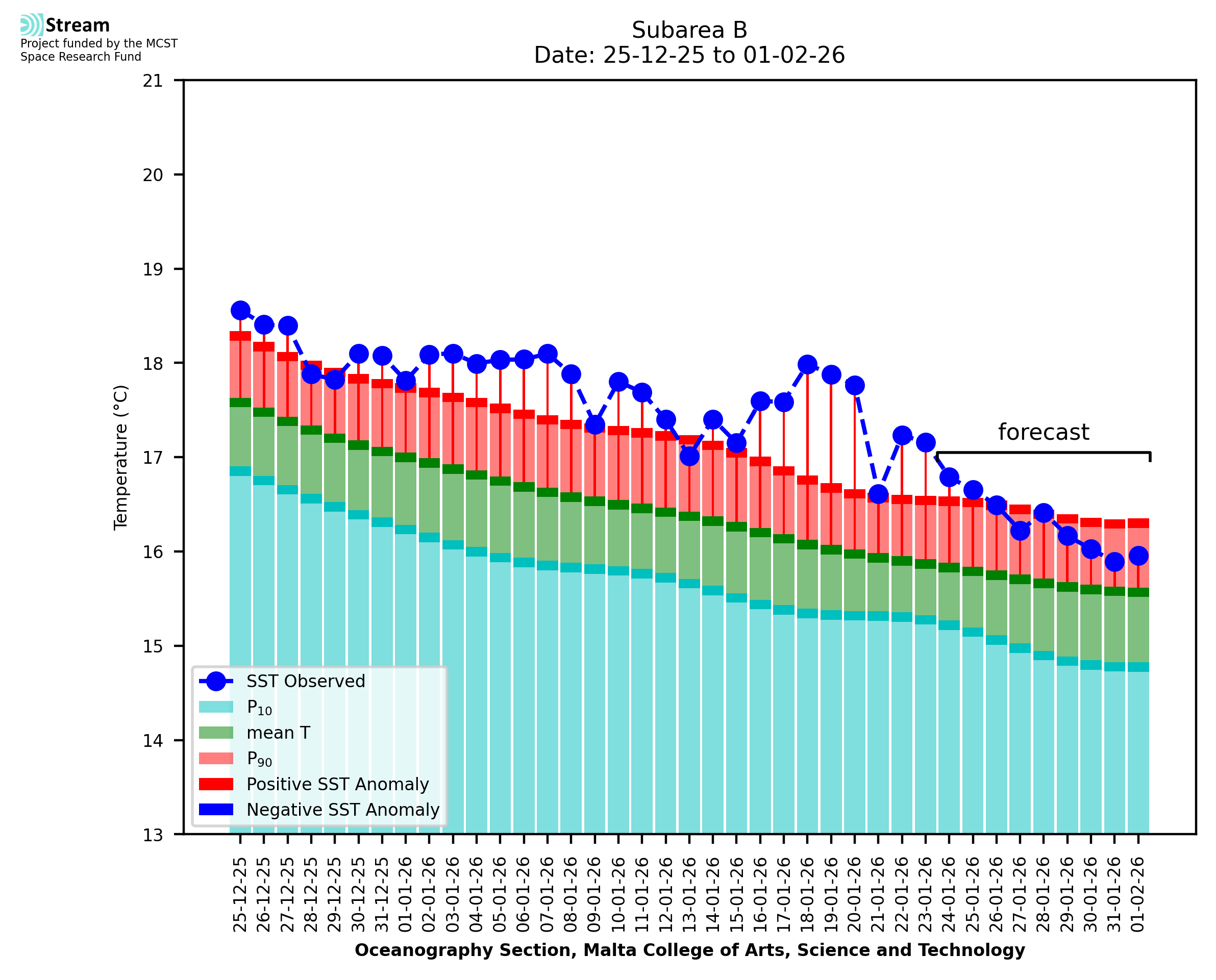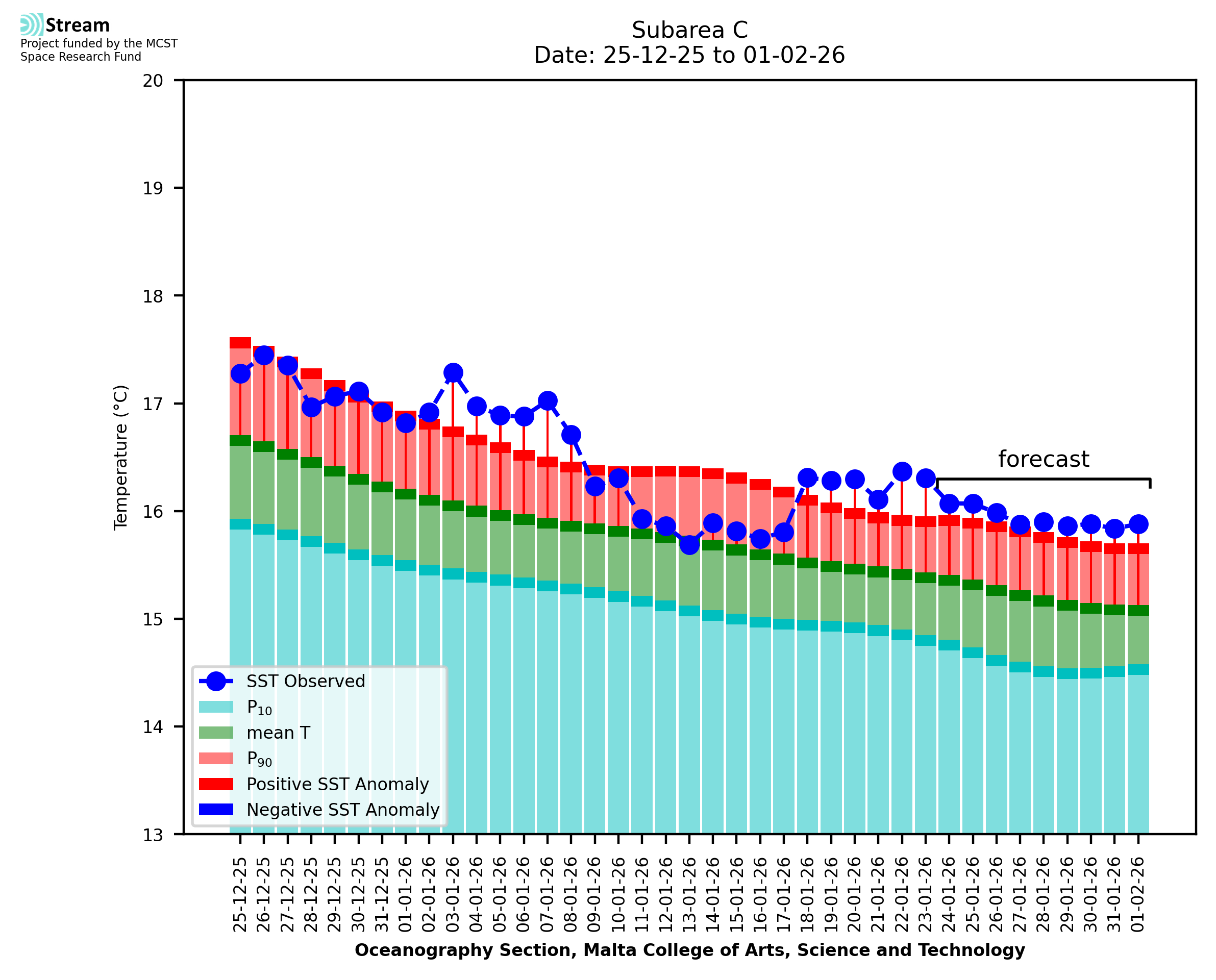 Elaborated by STREAM, the service provides daily analysis of sea surface temperature (SST) anomalies, including spatial maps for marine heat wave occurrence and intensity in the Malta shelf area. The service is based on ultra high resolution SST nighttime observations made by the infrared sensors mounted on different satellite platforms. Personalised user requests for detailed pixel-based data visualisation and access are available operationally on the STREAM web and mobile app.