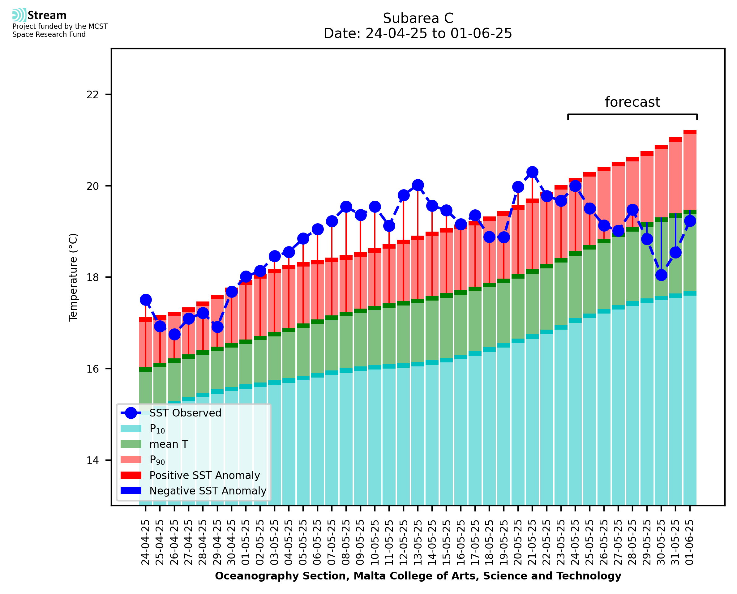 Elaborated by STREAM, the service provides daily analysis of sea surface temperature (SST) anomalies, including spatial maps for marine heat wave occurrence and intensity in the Malta shelf area. The service is based on ultra high resolution SST nighttime observations made by the infrared sensors mounted on different satellite platforms. Personalised user requests for detailed pixel-based data visualisation and access are available operationally on the STREAM web and mobile app.