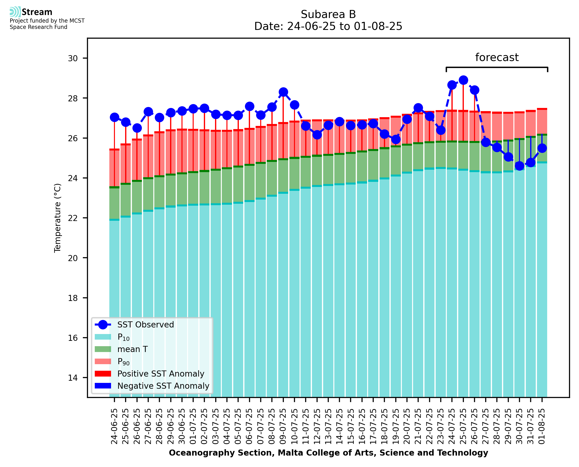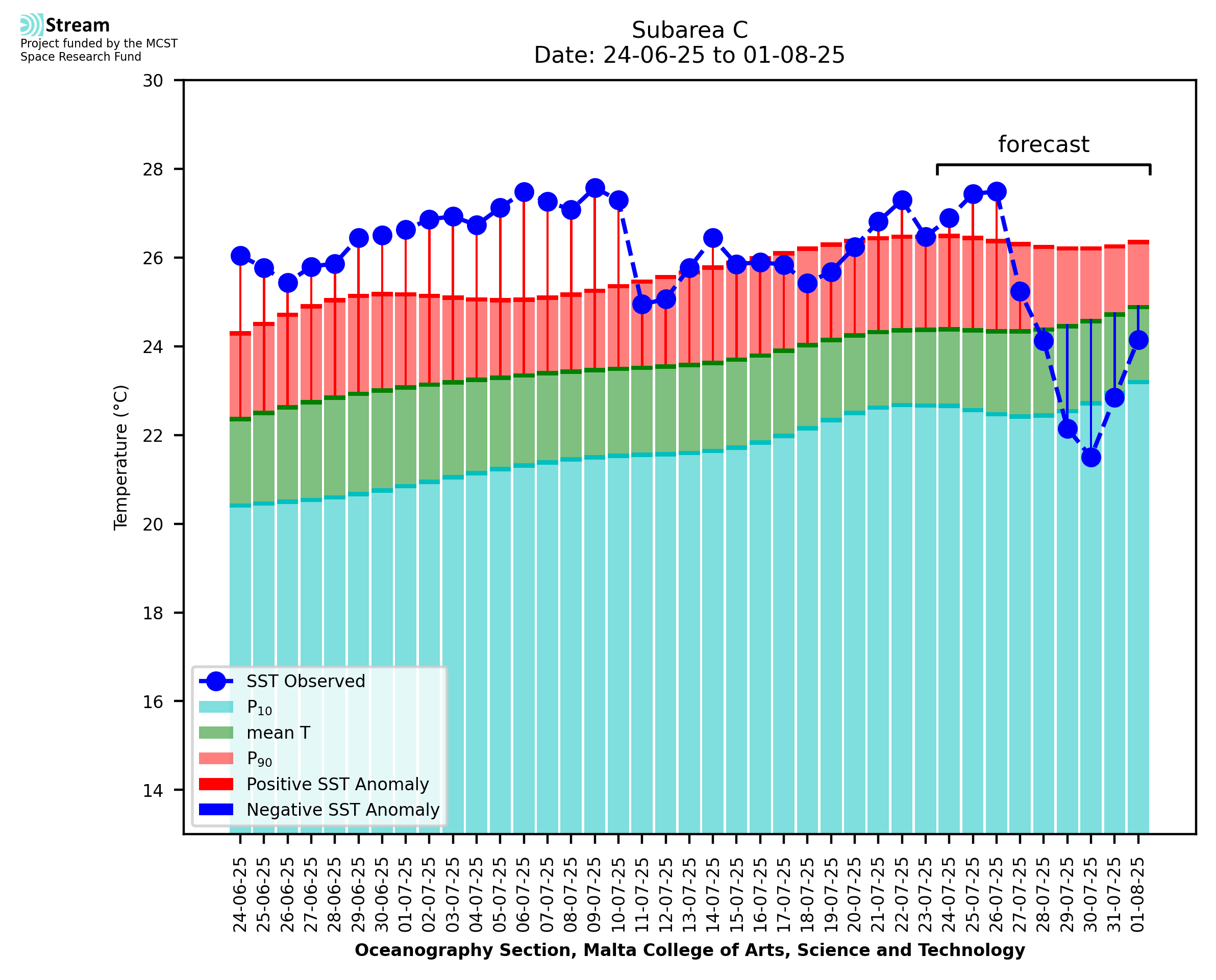 Elaborated by STREAM, the service provides daily analysis of sea surface temperature (SST) anomalies, including spatial maps for marine heat wave occurrence and intensity in the Malta shelf area. The service is based on ultra high resolution SST nighttime observations made by the infrared sensors mounted on different satellite platforms. Personalised user requests for detailed pixel-based data visualisation and access are available operationally on the STREAM web and mobile app.