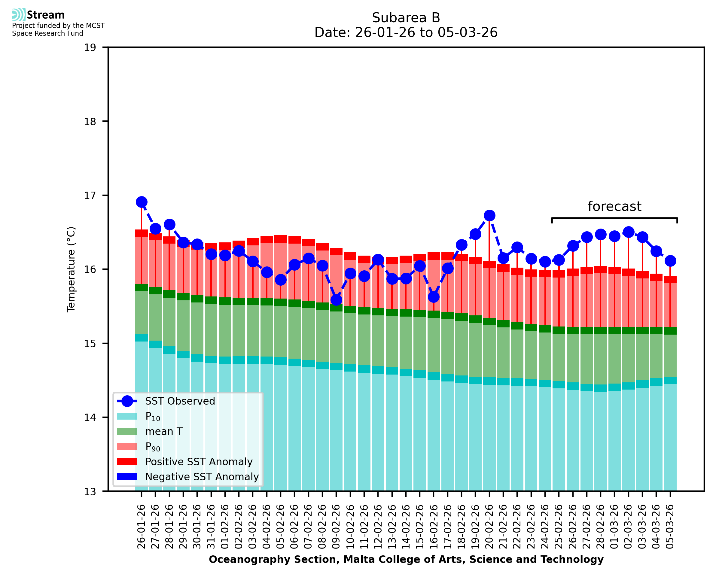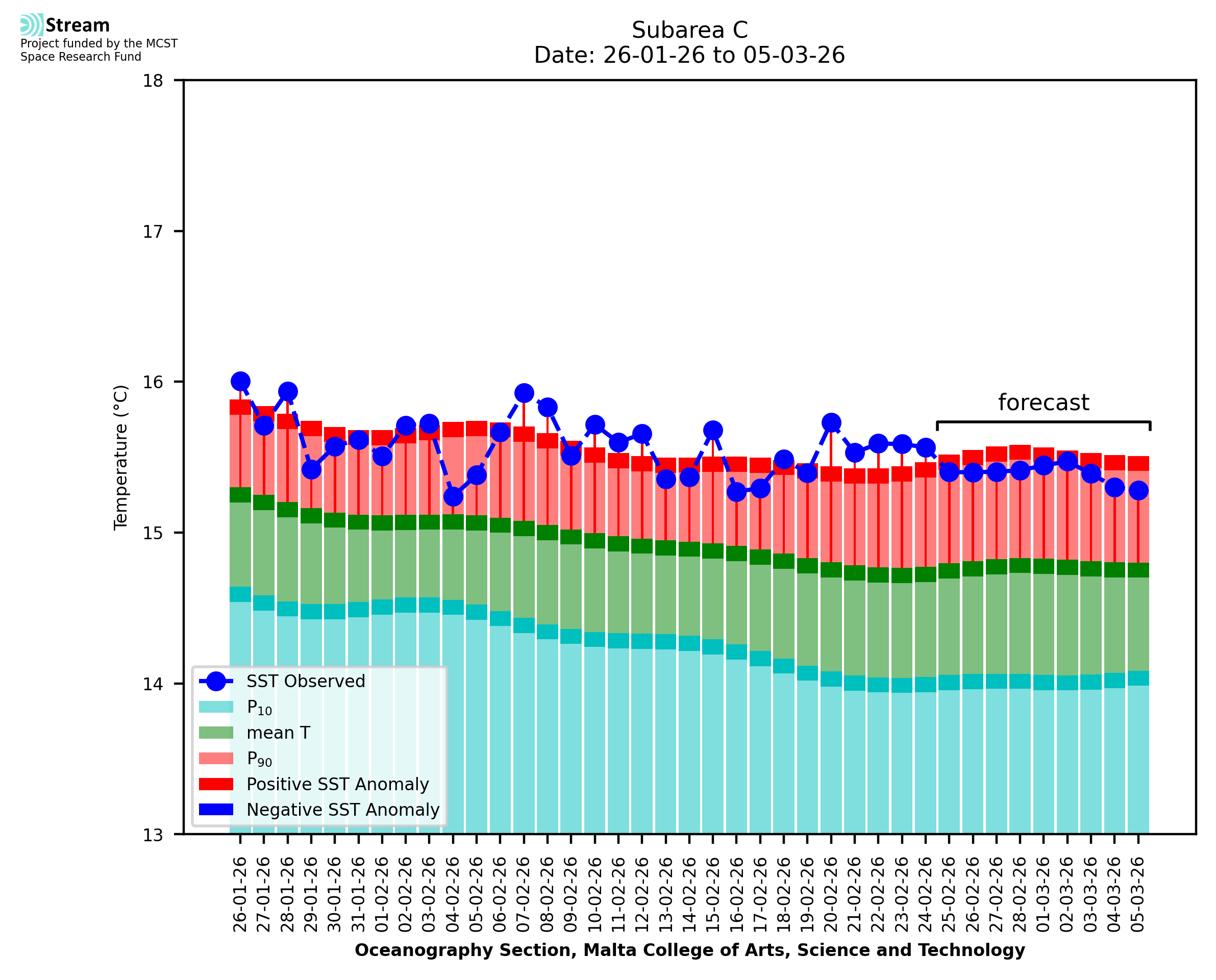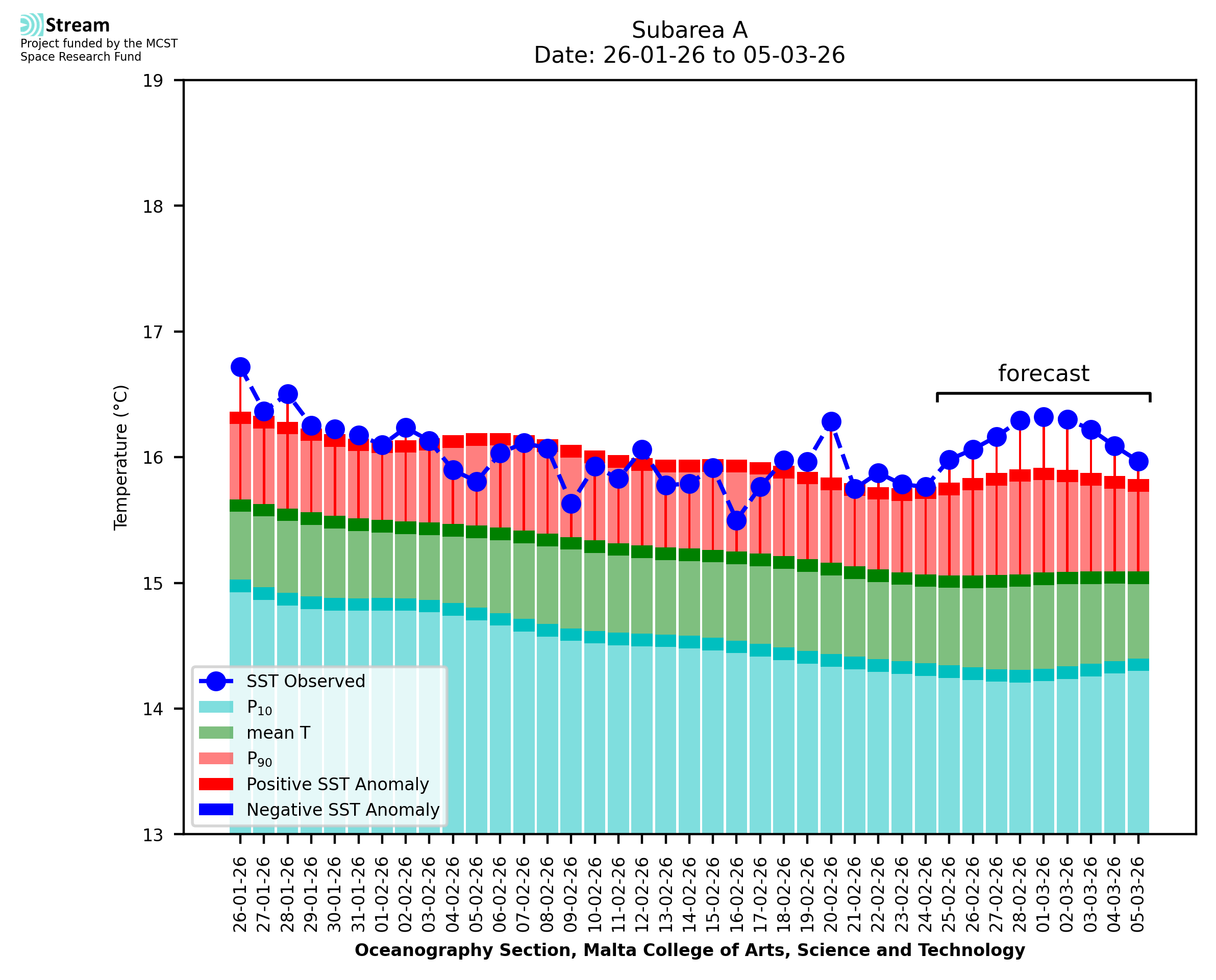 Elaborated by STREAM, the service provides daily analysis of sea surface temperature (SST) anomalies, including spatial maps for marine heat wave occurrence and intensity in the Malta shelf area. The service is based on ultra high resolution SST nighttime observations made by the infrared sensors mounted on different satellite platforms. Personalised user requests for detailed pixel-based data visualisation and access are available operationally on the STREAM web and mobile app.