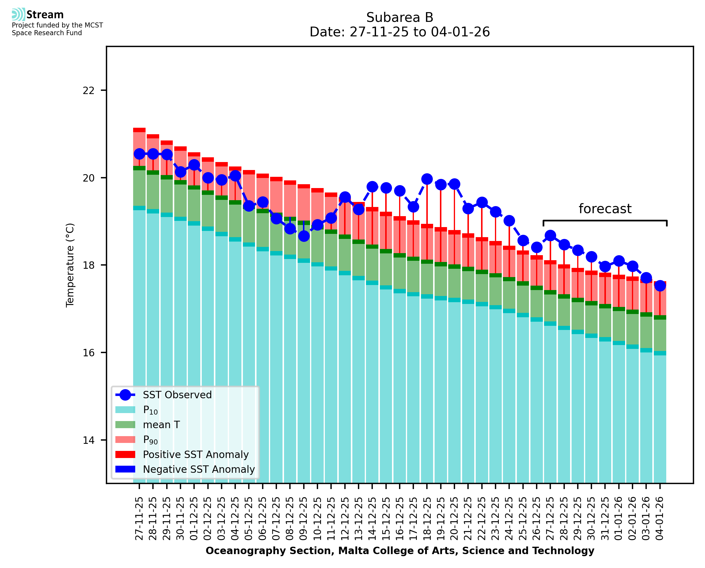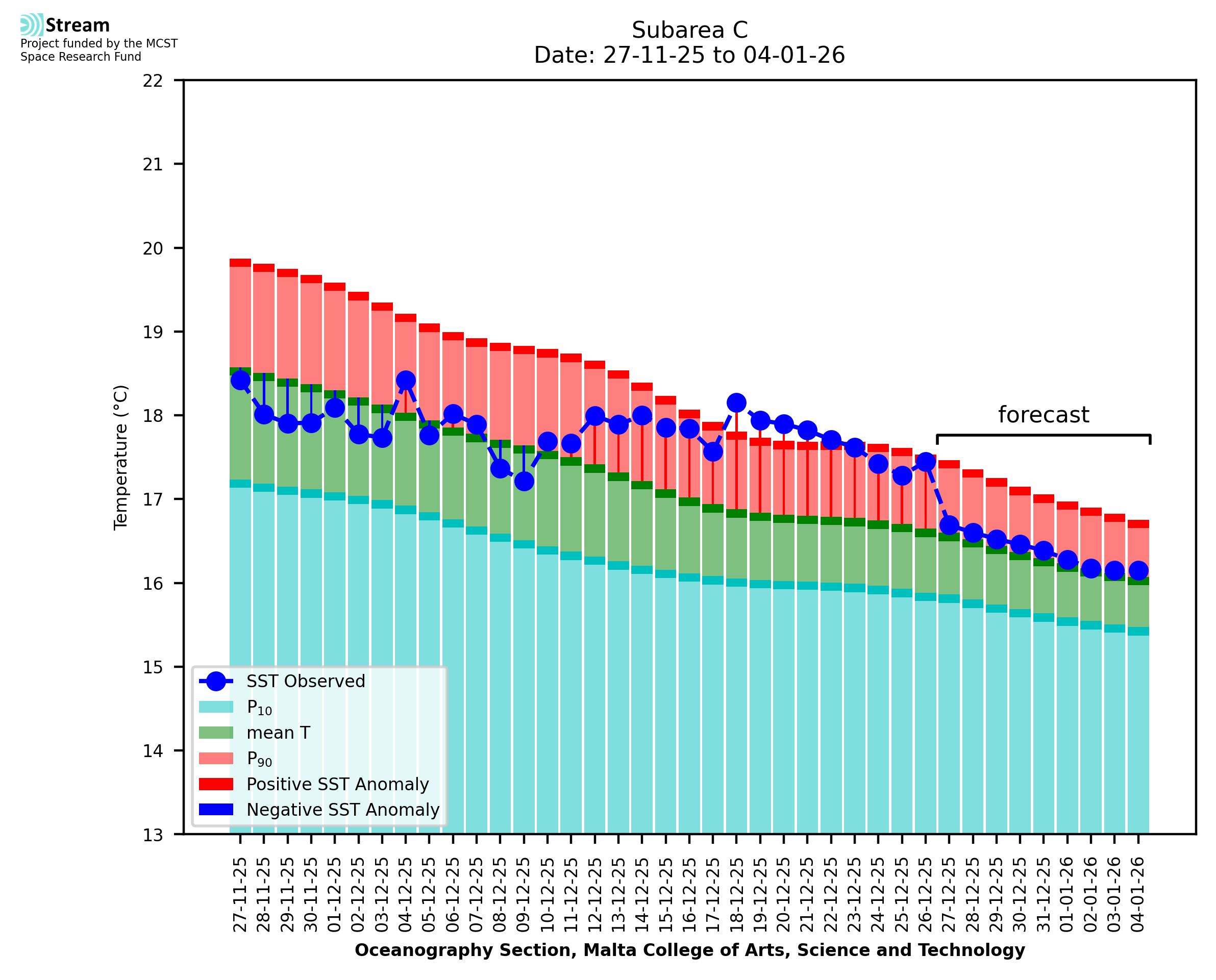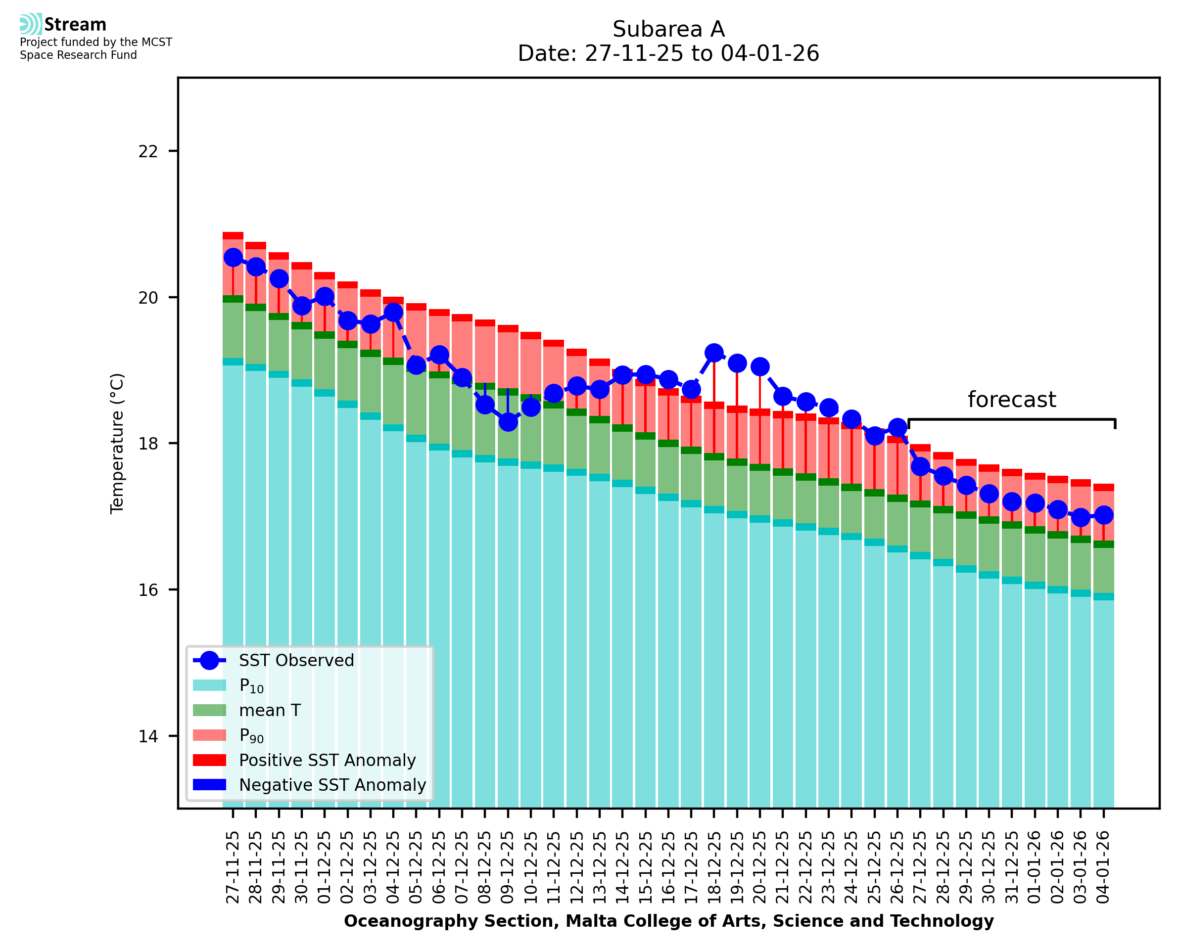 Elaborated by STREAM, the service provides daily analysis of sea surface temperature (SST) anomalies, including spatial maps for marine heat wave occurrence and intensity in the Malta shelf area. The service is based on ultra high resolution SST nighttime observations made by the infrared sensors mounted on different satellite platforms. Personalised user requests for detailed pixel-based data visualisation and access are available operationally on the STREAM web and mobile app.