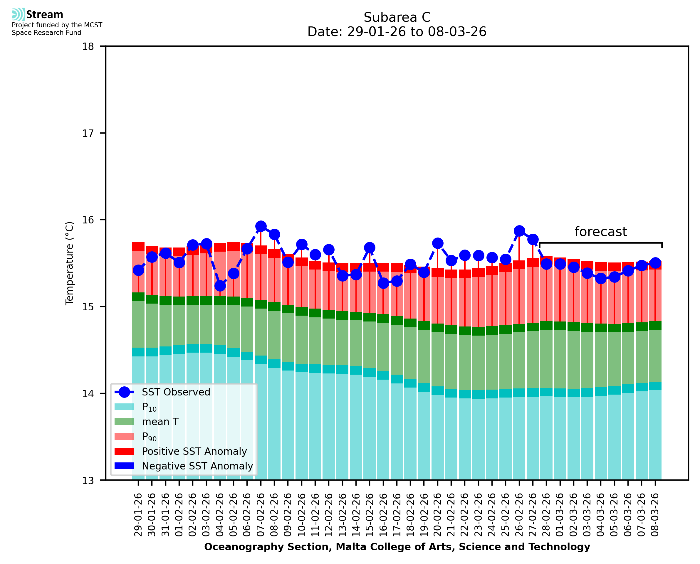 Elaborated by STREAM, the service provides daily analysis of sea surface temperature (SST) anomalies, including spatial maps for marine heat wave occurrence and intensity in the Malta shelf area. The service is based on ultra high resolution SST nighttime observations made by the infrared sensors mounted on different satellite platforms. Personalised user requests for detailed pixel-based data visualisation and access are available operationally on the STREAM web and mobile app.