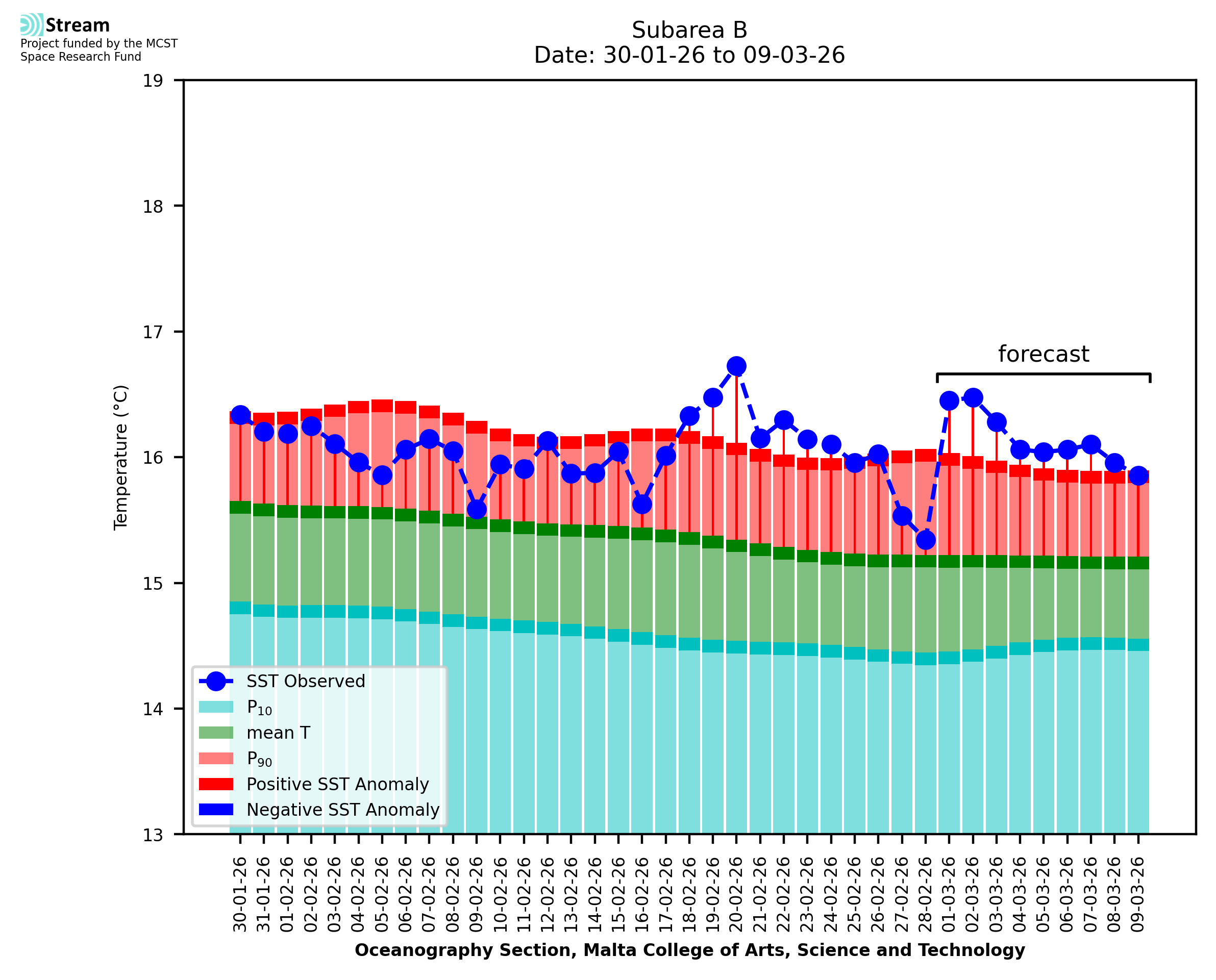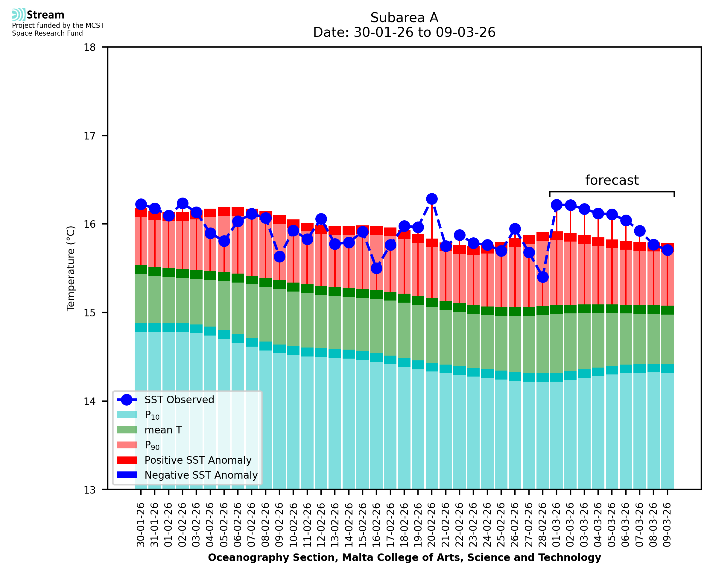Elaborated by STREAM, the service provides daily analysis of sea surface temperature (SST) anomalies, including spatial maps for marine heat wave occurrence and intensity in the Malta shelf area. The service is based on ultra high resolution SST nighttime observations made by the infrared sensors mounted on different satellite platforms. Personalised user requests for detailed pixel-based data visualisation and access are available operationally on the STREAM web and mobile app.