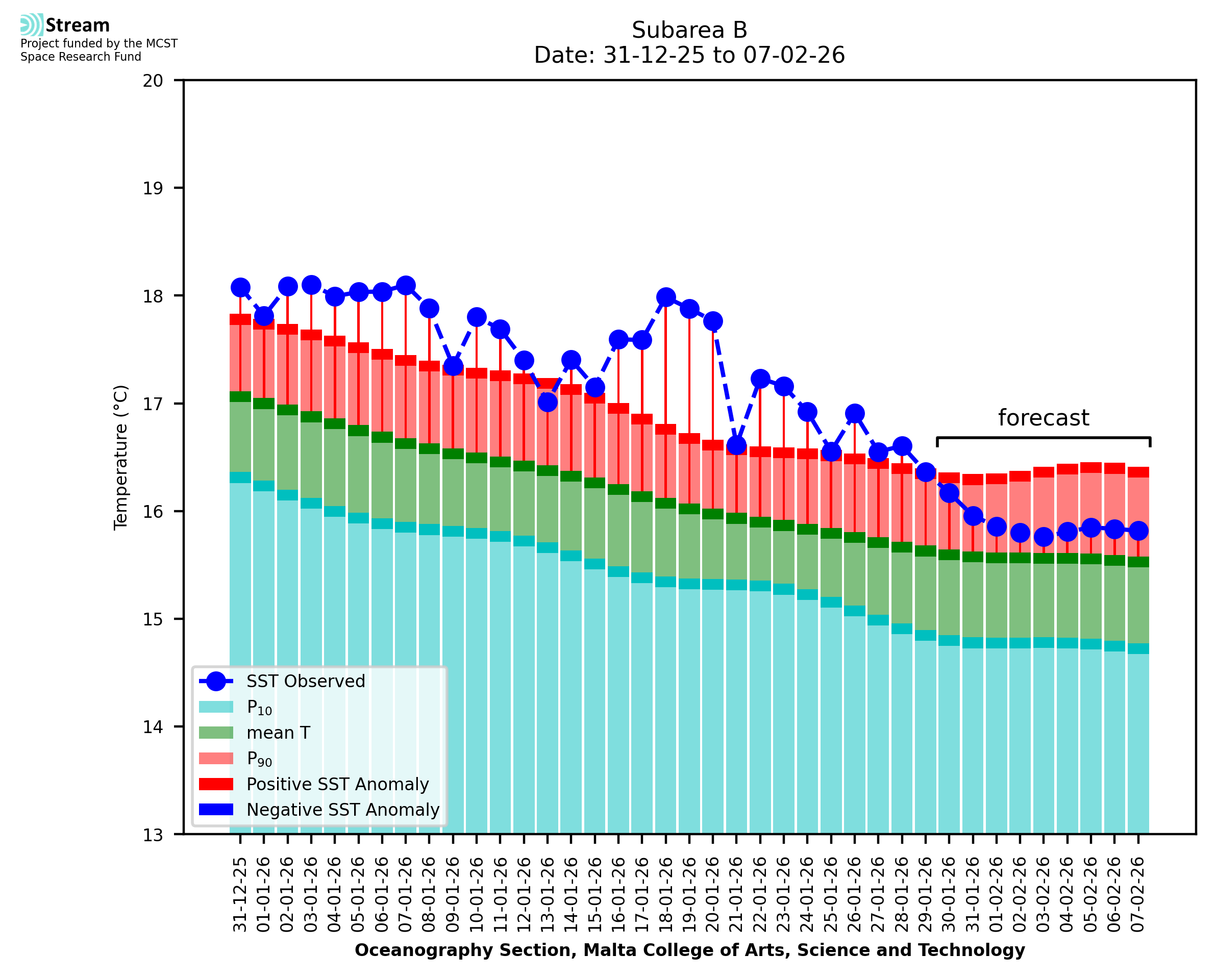 Elaborated by STREAM, the service provides daily analysis of sea surface temperature (SST) anomalies, including spatial maps for marine heat wave occurrence and intensity in the Malta shelf area. The service is based on ultra high resolution SST nighttime observations made by the infrared sensors mounted on different satellite platforms. Personalised user requests for detailed pixel-based data visualisation and access are available operationally on the STREAM web and mobile app.